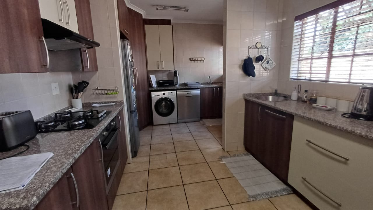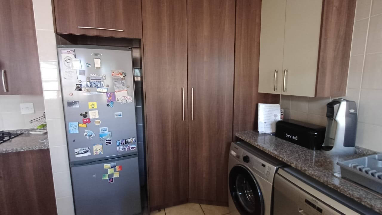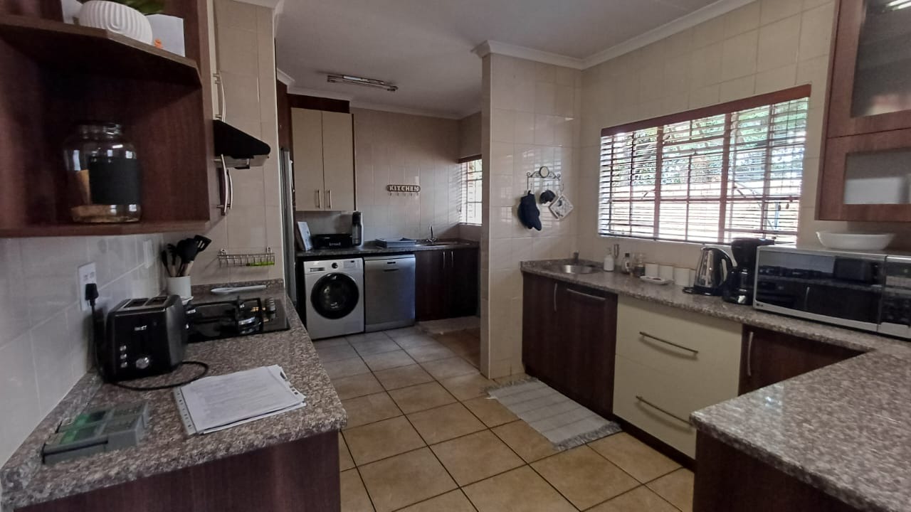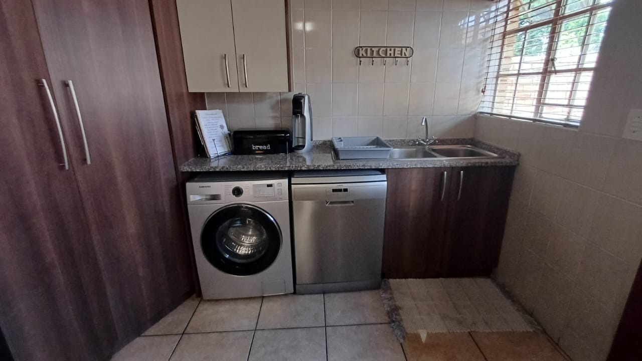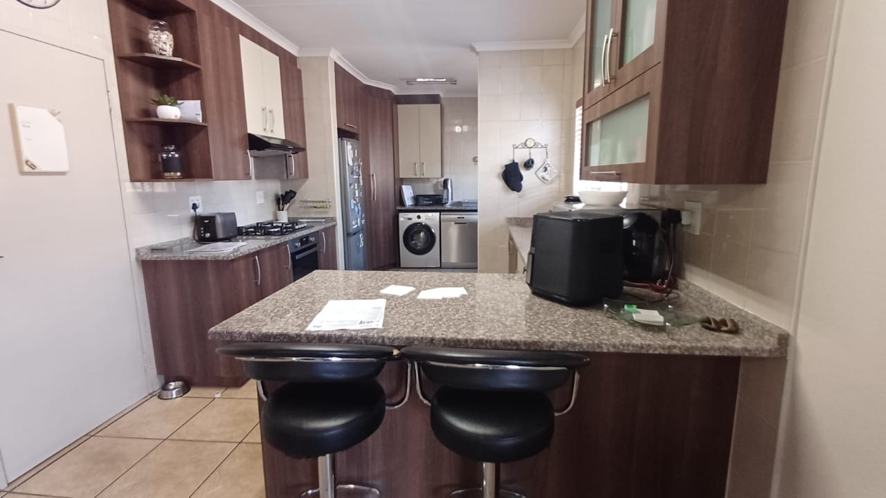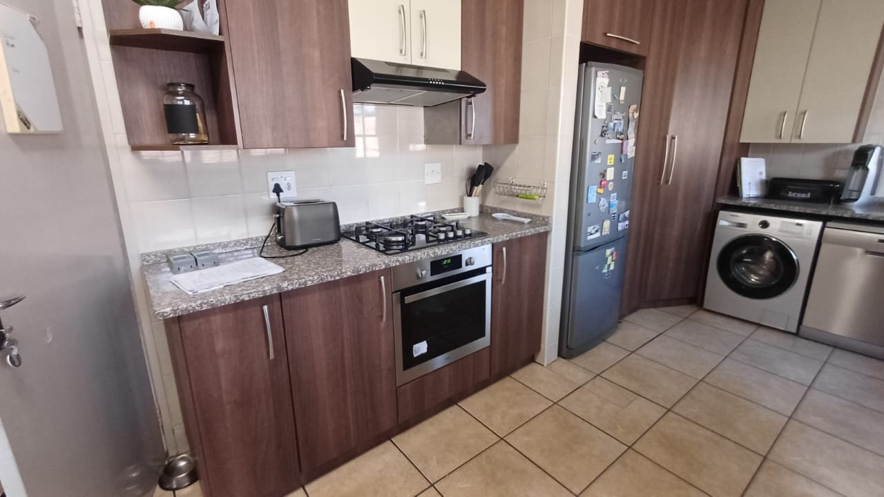Step inside to discover an inviting open-plan layout, seamlessly connecting the lounge, dining area, and a well-appointed kitchen. The kitchen is a highlight, boasting modern two-tone cabinetry, granite-look countertops, and integrated appliances including a gas stove, oven, extractor fan, washing machine, and dishwasher. A practical breakfast nook adds to its functionality, while tiled flooring extends throughout these communal spaces, leading to sliding doors that open to an outdoor patio.