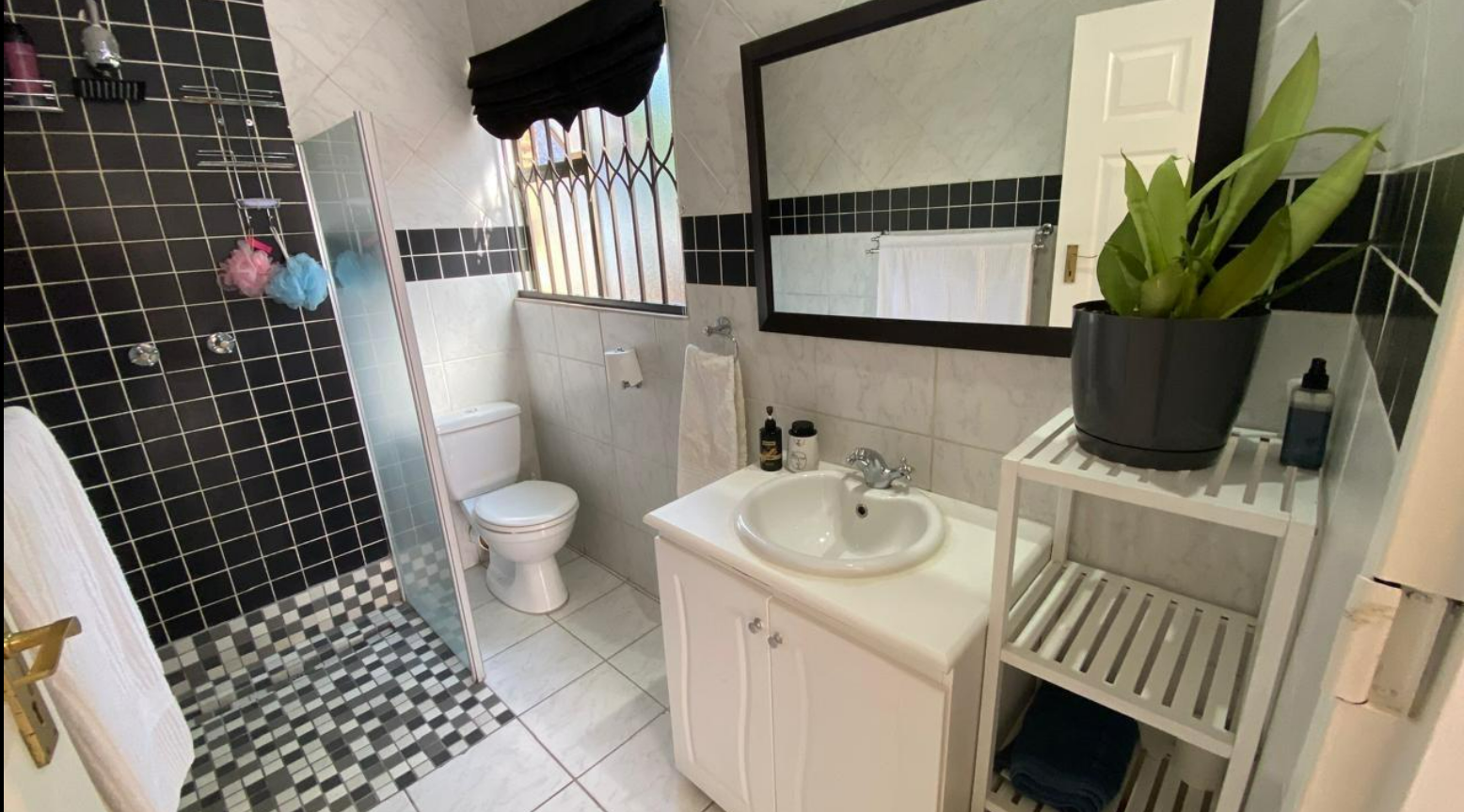 The three bedrooms are well-proportioned, with built-in wardrobes providing essential storage. Natural light fills these spaces, creating a bright atmosphere. The property boasts two bathrooms, one of which is an en-suite, offering convenience and privacy. One bathroom features a modern black and white tiled design with a walk-in shower, while the other includes a bathtub.