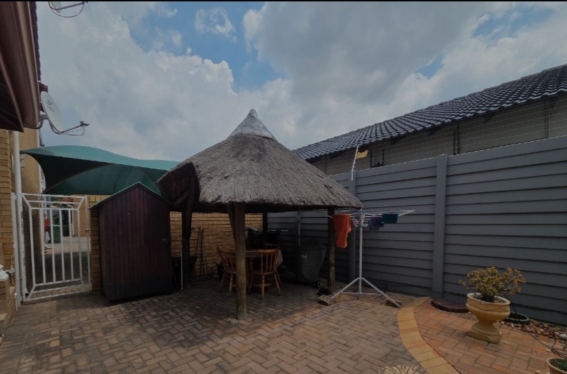 The private quarters comprise three generously proportioned bedrooms, offering serene retreats for rest and rejuvenation. Two exquisitely finished bathrooms, including a luxurious en-suite, provide ultimate comfort and convenience. Outside, the expansive 1983 square metre erf unfolds into a beautifully landscaped garden, complete with elegant paving and a charming lapa, ideal for alfresco entertaining and enjoying the South African climate. Enhanced security features, including an access gate, electric fencing, and robust burglar bars, ensure peace of mind within this exclusive complex.