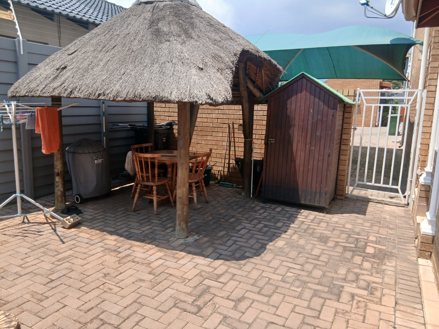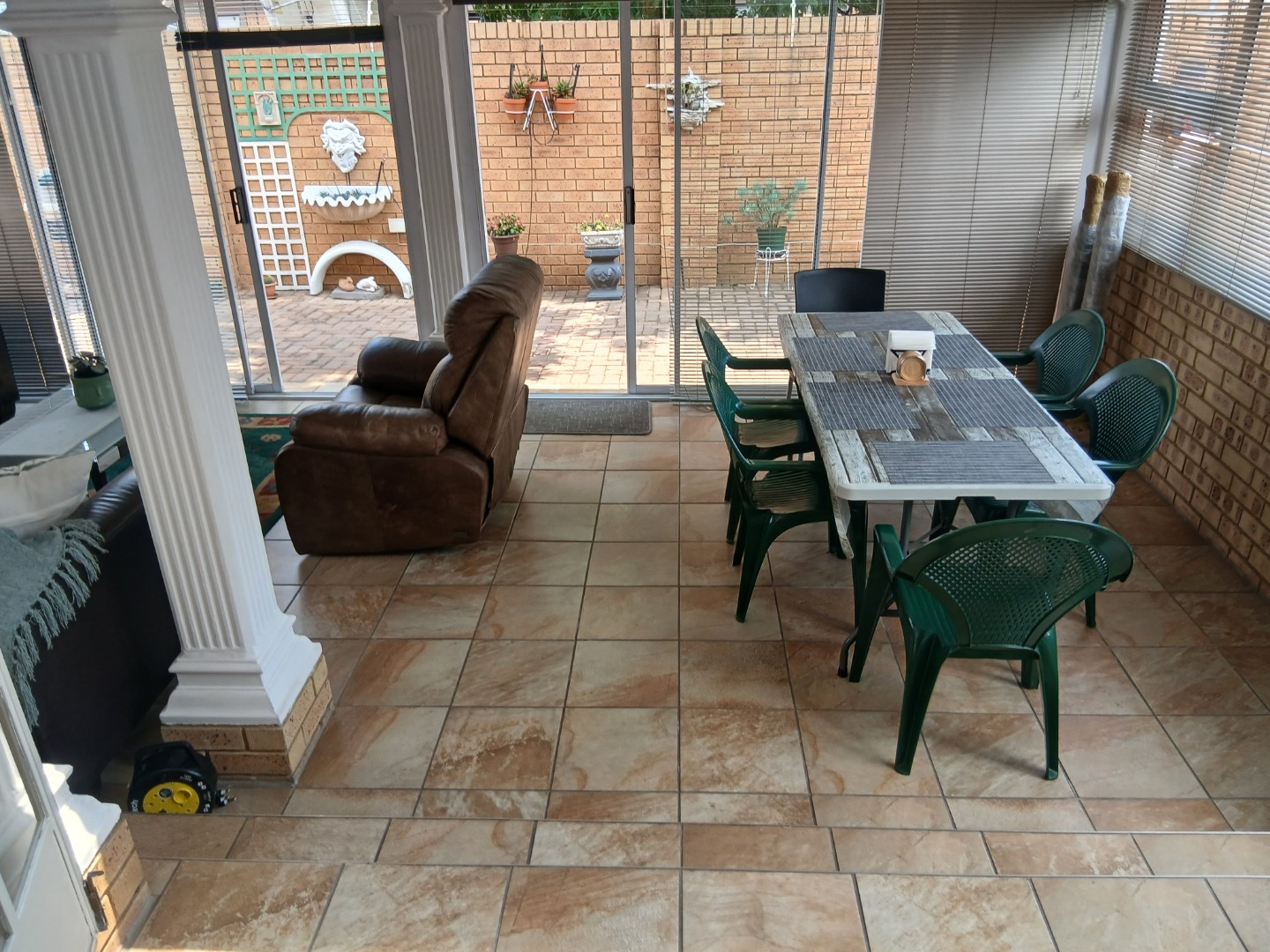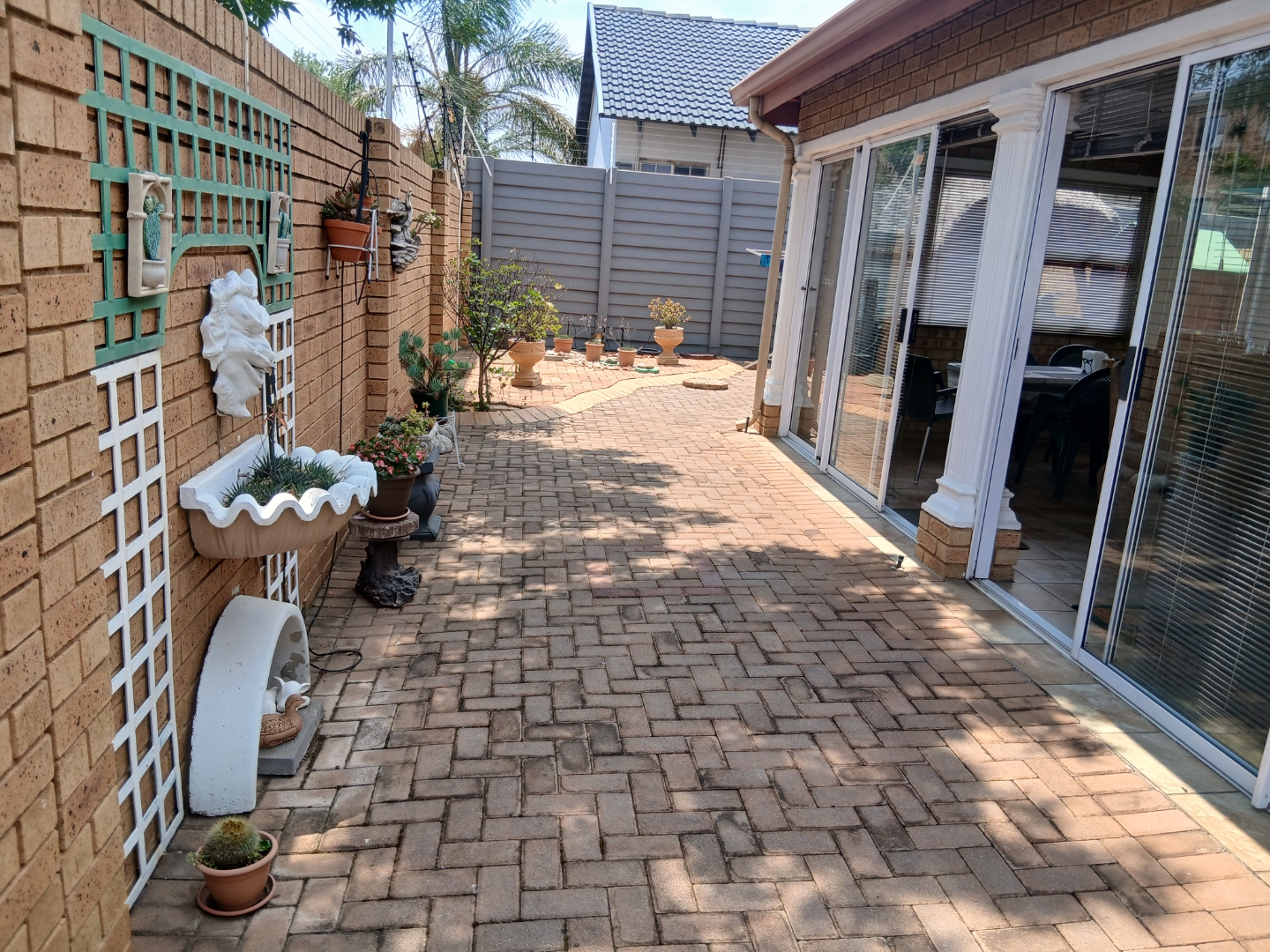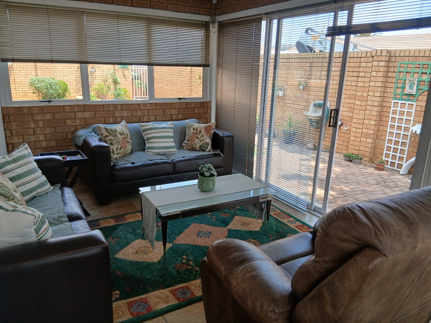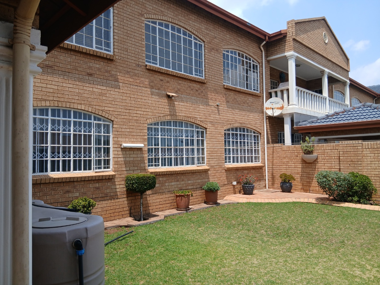 This elegant and immaculately maintained ground-floor townhouse offers comfort, security, and modern convenience — a true move-in-ready home! A neat paved driveway leads to two automated double garages equipped with shelving for storage and an additional shaded carport. The front door opens to a spacious open-plan tiled lounge and dining area, which flows seamlessly into a covered recreation room — perfect for an additional lounge set and dining area for entertaining family and friends. A guest toilet adds extra convenience. The home features four spacious bedrooms with ample cupboard space and two full bathrooms, including a main en-suite. Outside, enjoy a well-kept green lawn, water tanks, and a charming thatched lapa for outdoor relaxation.Additional features include an inverter system, electric fencing, intercom, and an electric gate, ensuring comfort and security throughout.