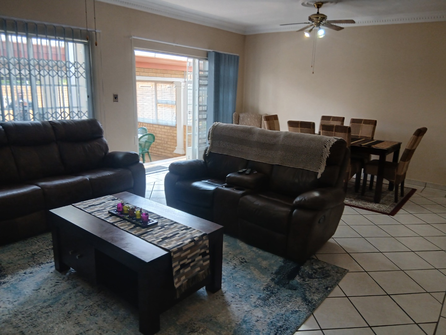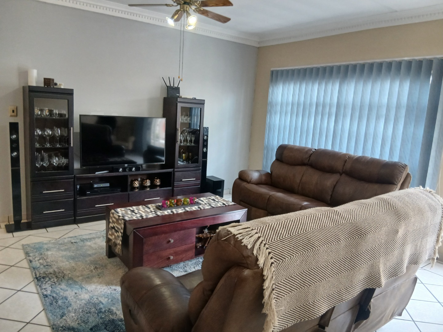This elegant and immaculately maintained ground-floor townhouse offers comfort, security, and modern convenience — a true move-in-ready home! A neat paved driveway leads to two automated double garages equipped with shelving for storage and an additional shaded carport. The front door opens to a spacious open-plan tiled lounge and dining area, which flows seamlessly into a covered recreation room — perfect for an additional lounge set and dining area for entertaining family and friends. A guest toilet adds extra convenience. The home features four spacious bedrooms with ample cupboard space and two full bathrooms, including a main en-suite. Outside, enjoy a well-kept green lawn, water tanks, and a charming thatched lapa for outdoor relaxation.Additional features include an inverter system, electric fencing, intercom, and an electric gate, ensuring comfort and security throughout.
