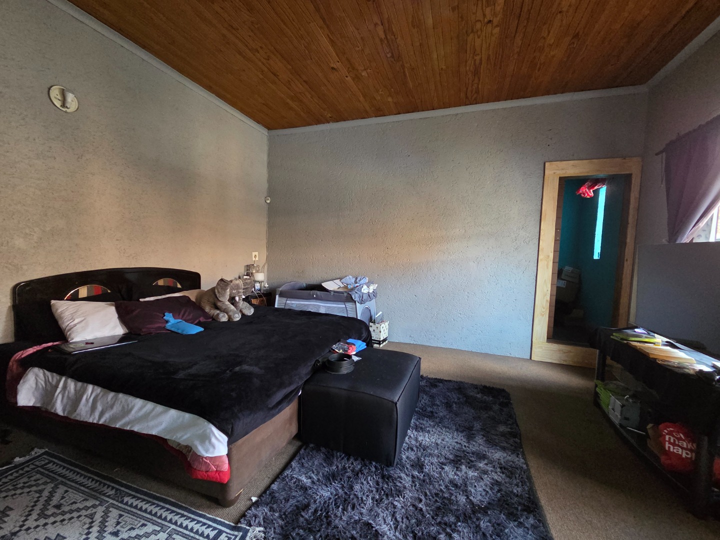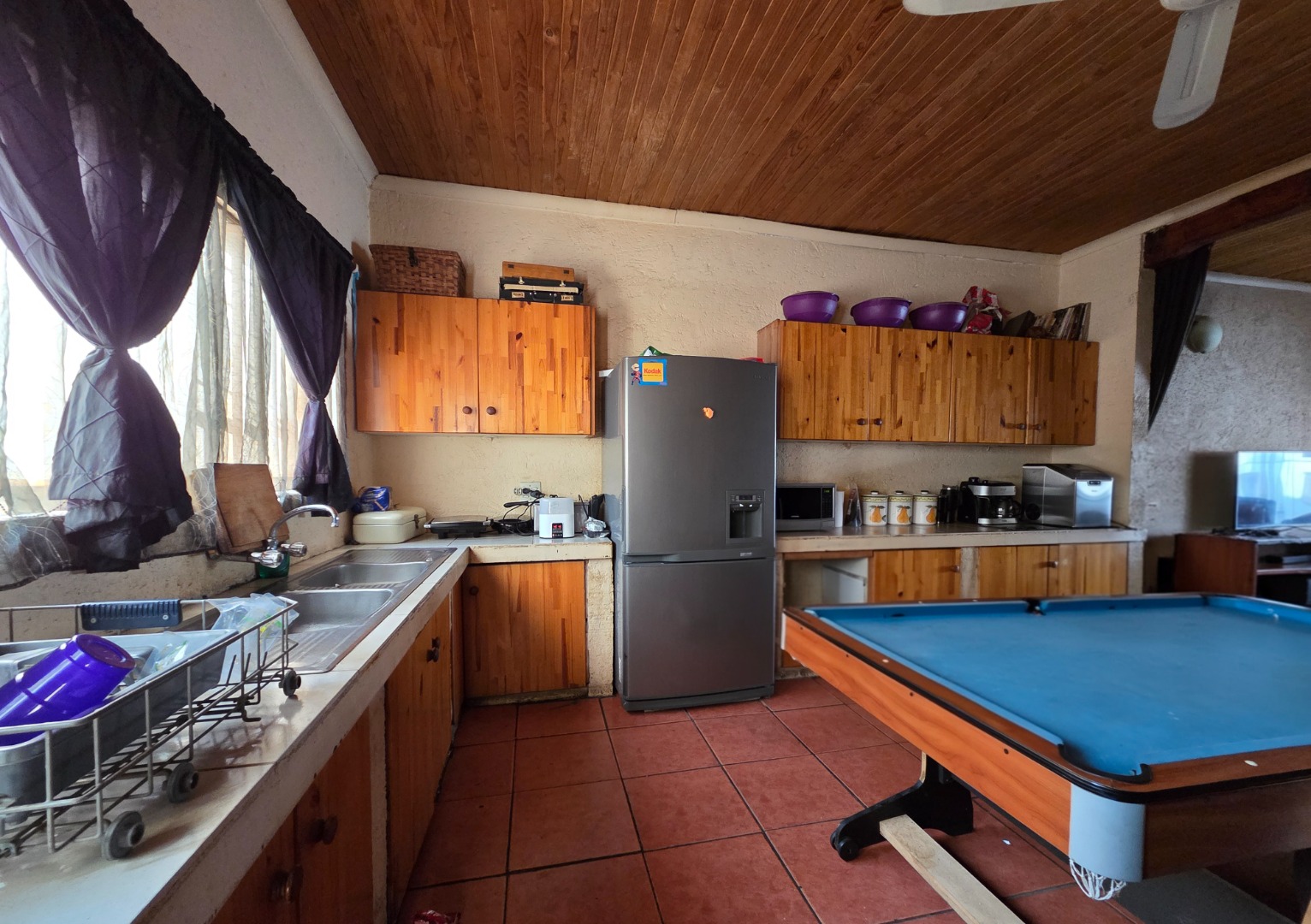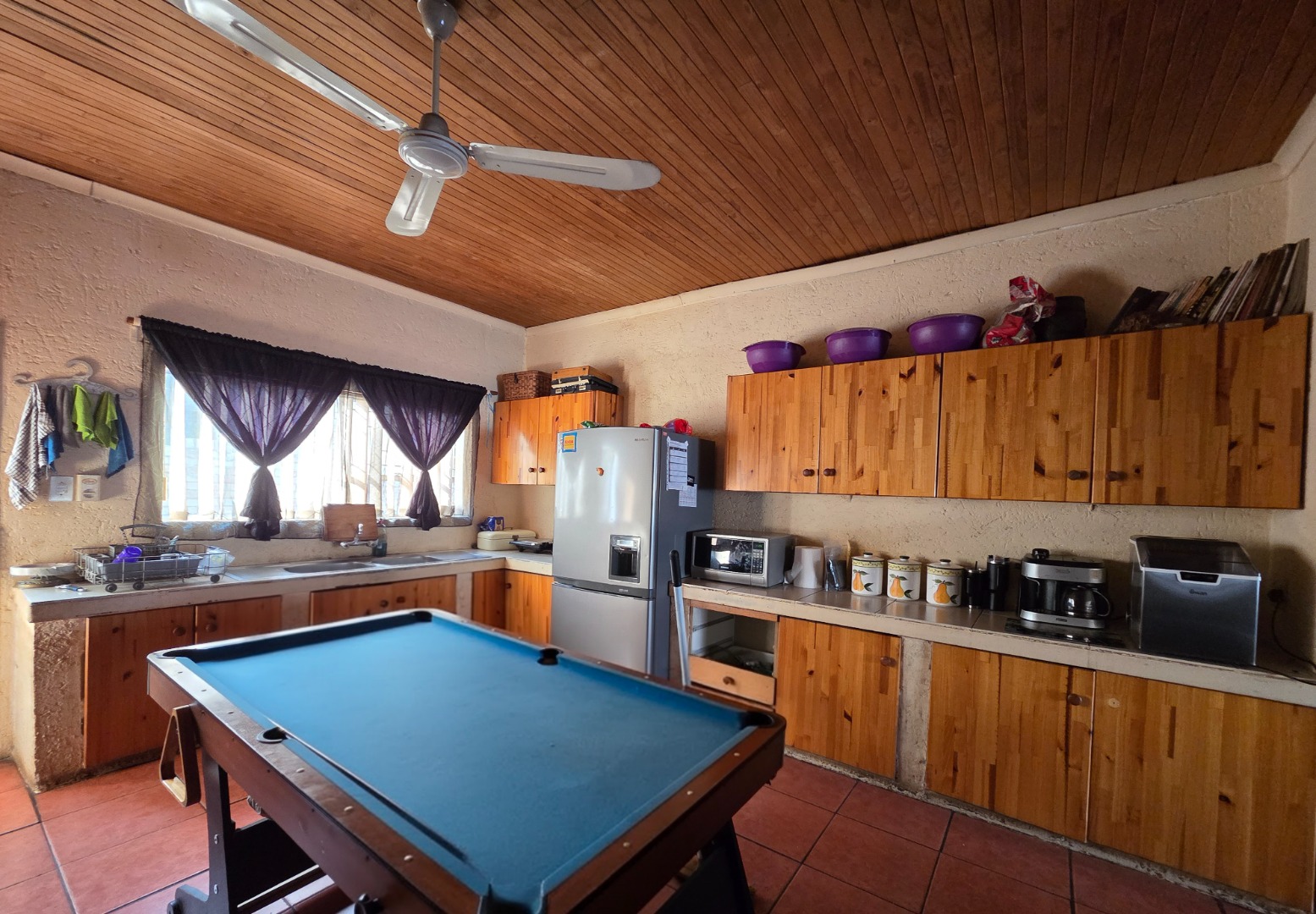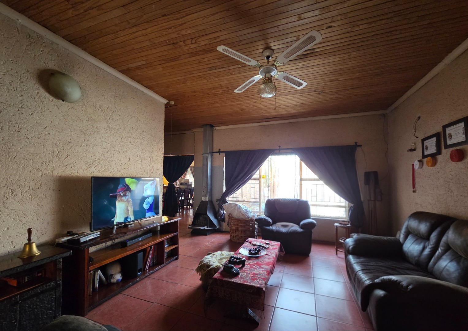 Living spaces are warm and inviting, including a large lounge with a charming wooden ceiling and a separate TV room complete with a fireplace, perfect for cozy evenings. The open-plan kitchen is both stylish and functional, offering cement countertops, wooden cupboards, and an outside laundry for added convenience.