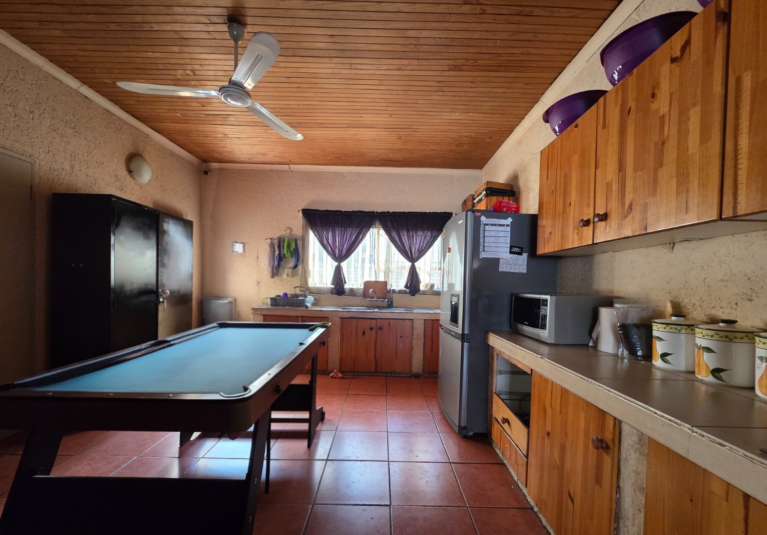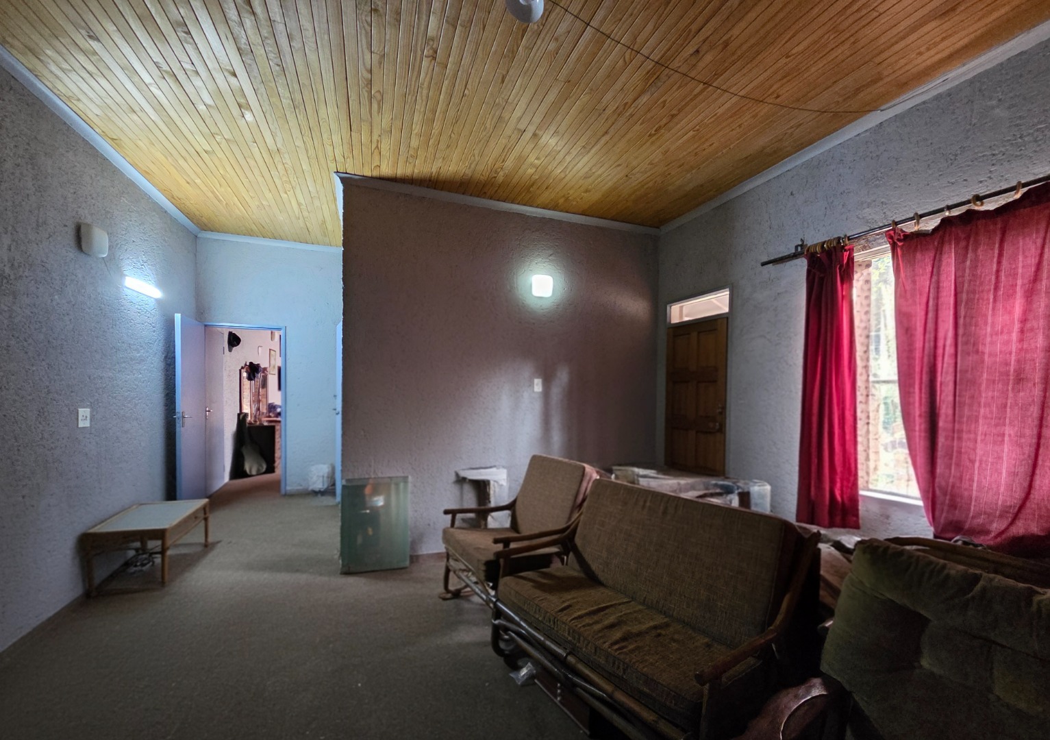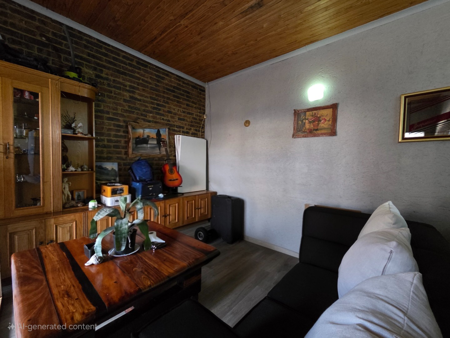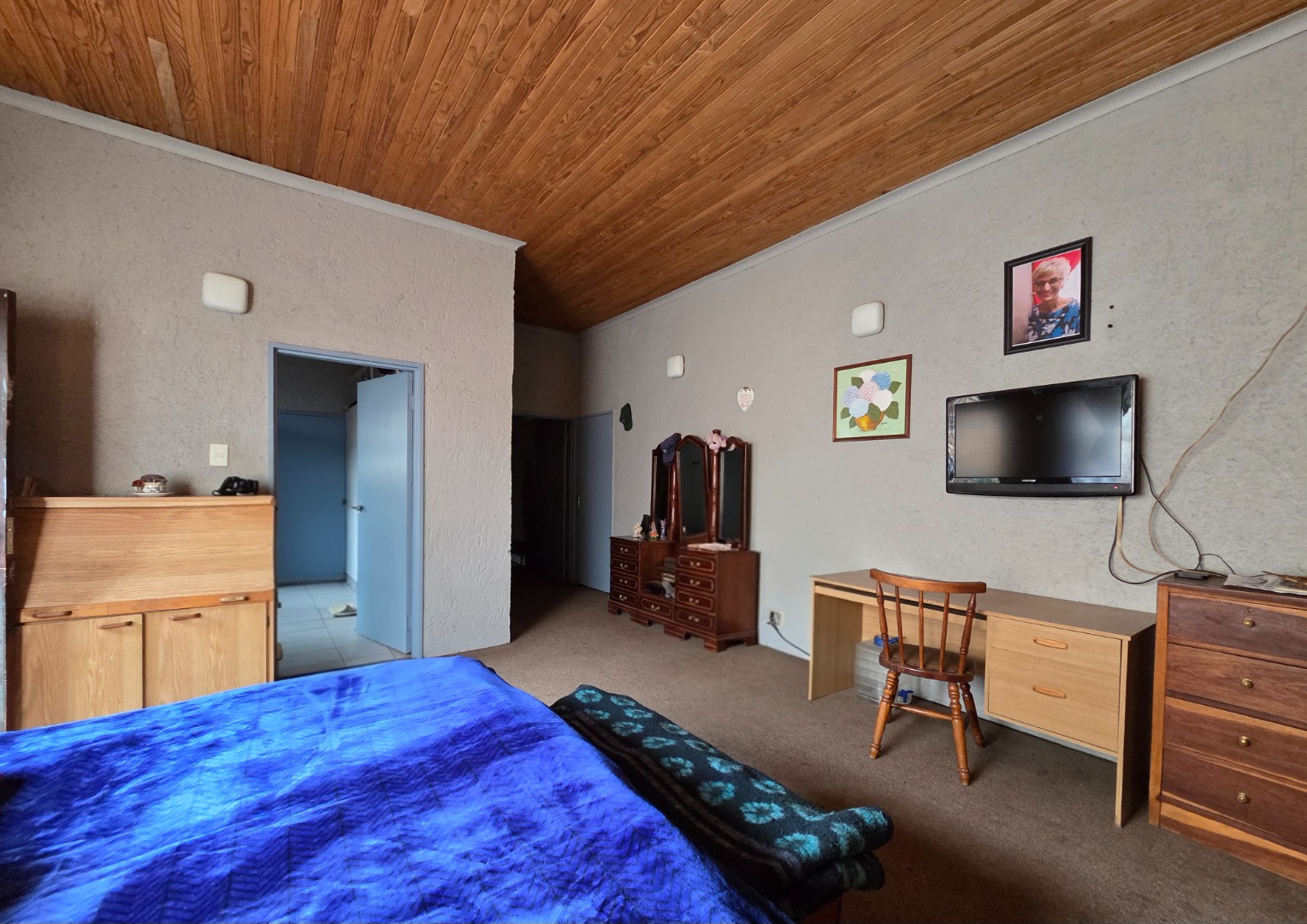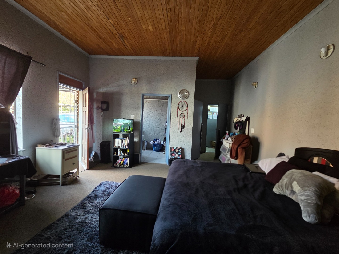 Living spaces are warm and inviting, including a large lounge with a charming wooden ceiling and a separate TV room complete with a fireplace, perfect for cozy evenings. The open-plan kitchen is both stylish and functional, offering cement countertops, wooden cupboards, and an outside laundry for added convenience.