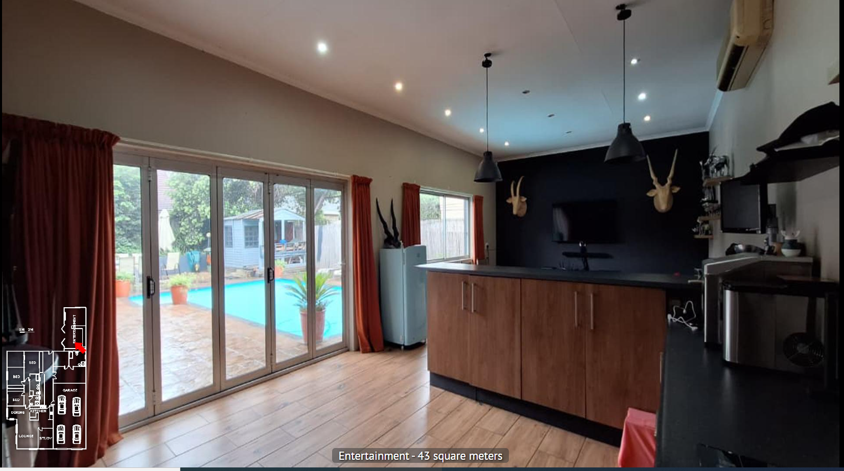 Interior of the house features an inviting open-plan layout, seamlessly connecting the main living areas. A well equipped kitchen, dinning room, lounge, and an additional family TV room provides a versatile space for relaxation and entertaining.