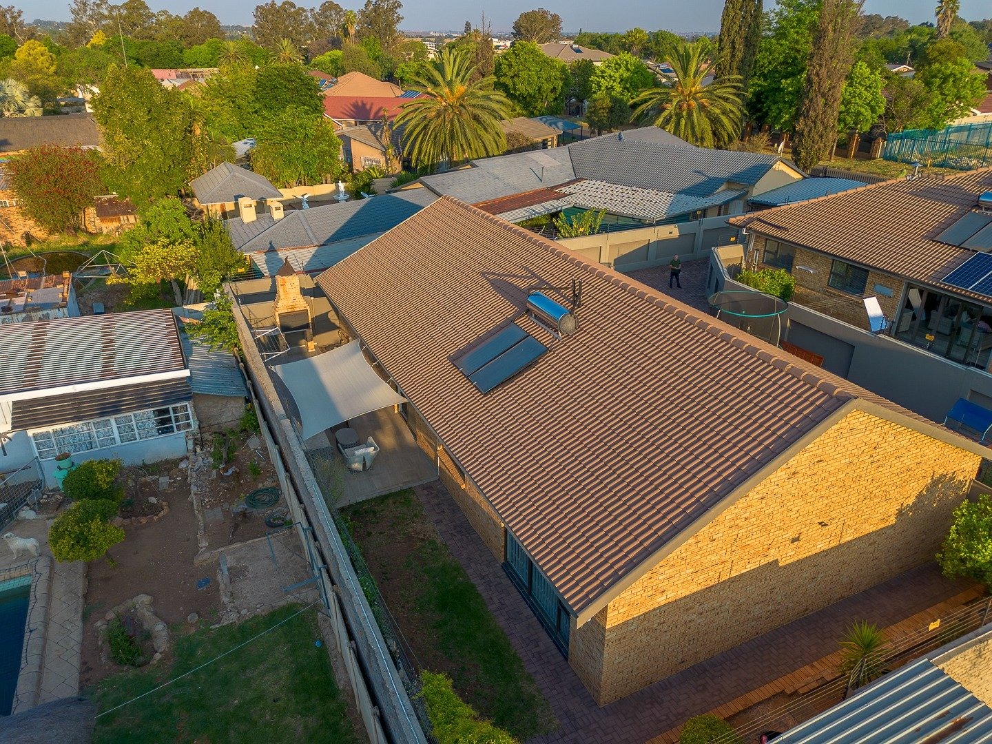 Enjoy a charming covered patio with shade sail and modern tiling, seamlessly connected to the interior via sliding glass doors. A built?in braai makes entertaining effortless, while the secure perimeter wall, alarm system, CCTV, electric fencing, and access gate provide peace of mind. Energy efficiency is enhanced with a solar geyser and pre?paid electricity.