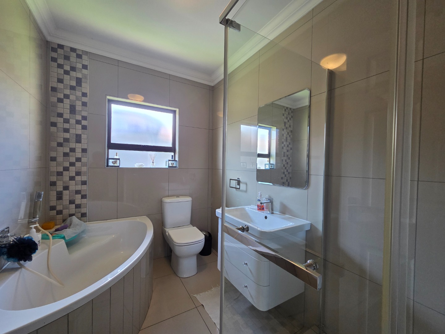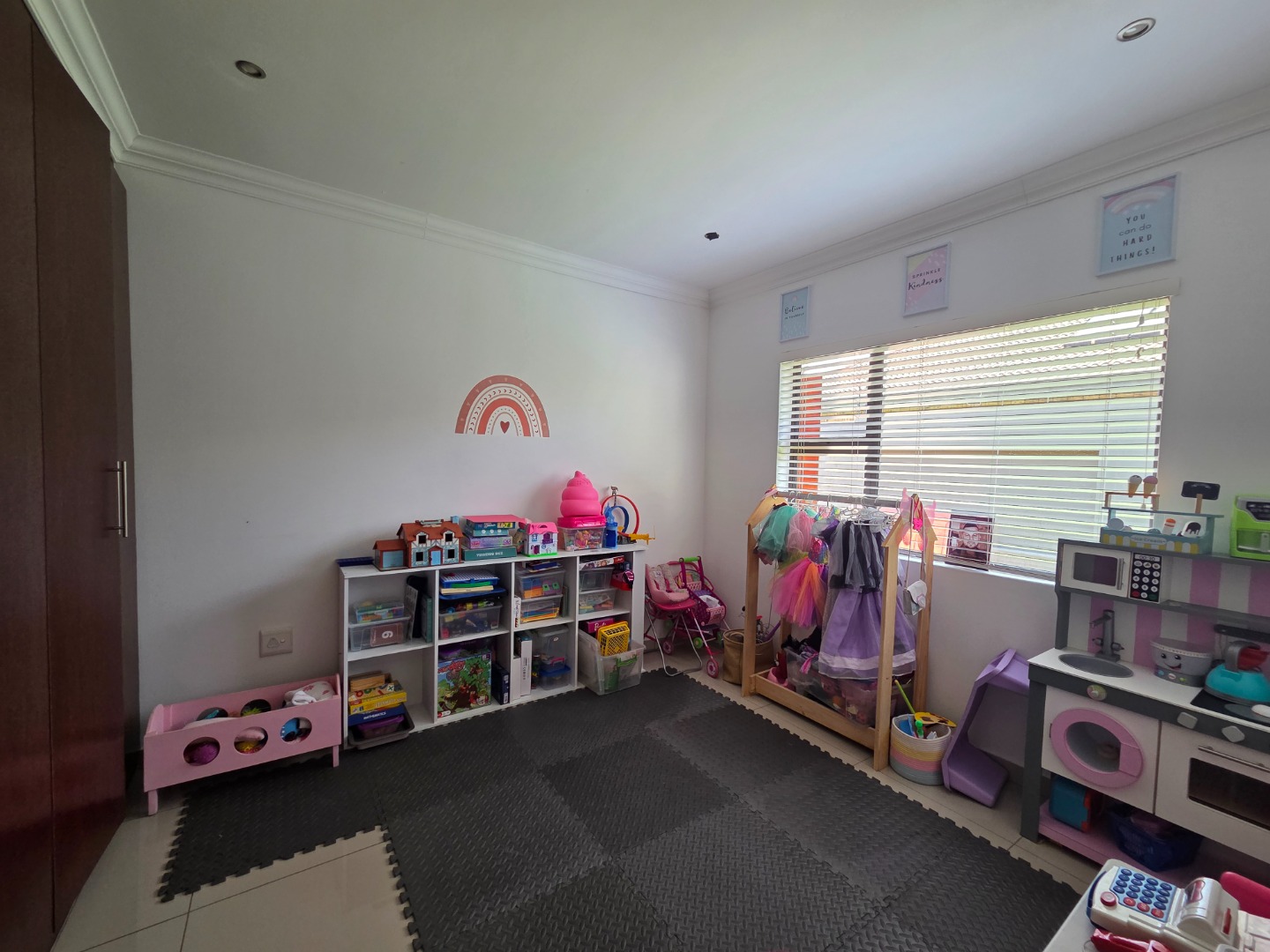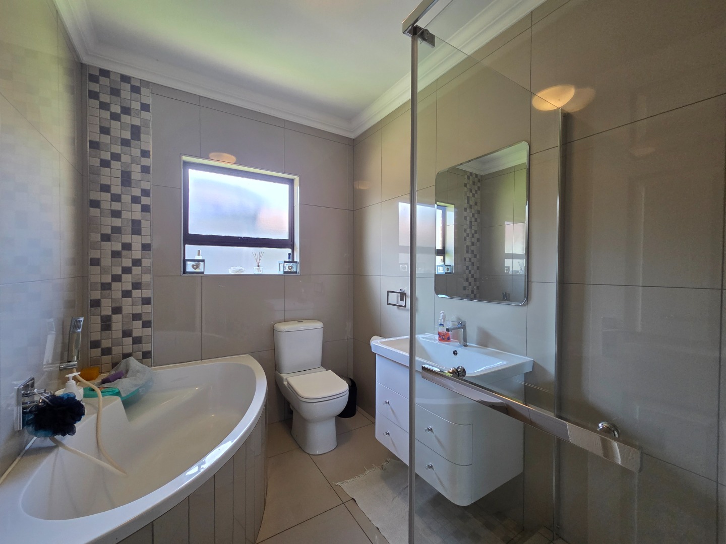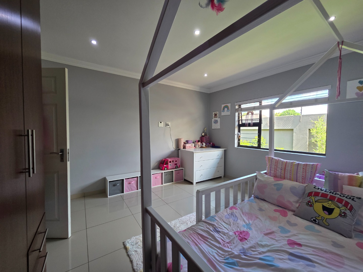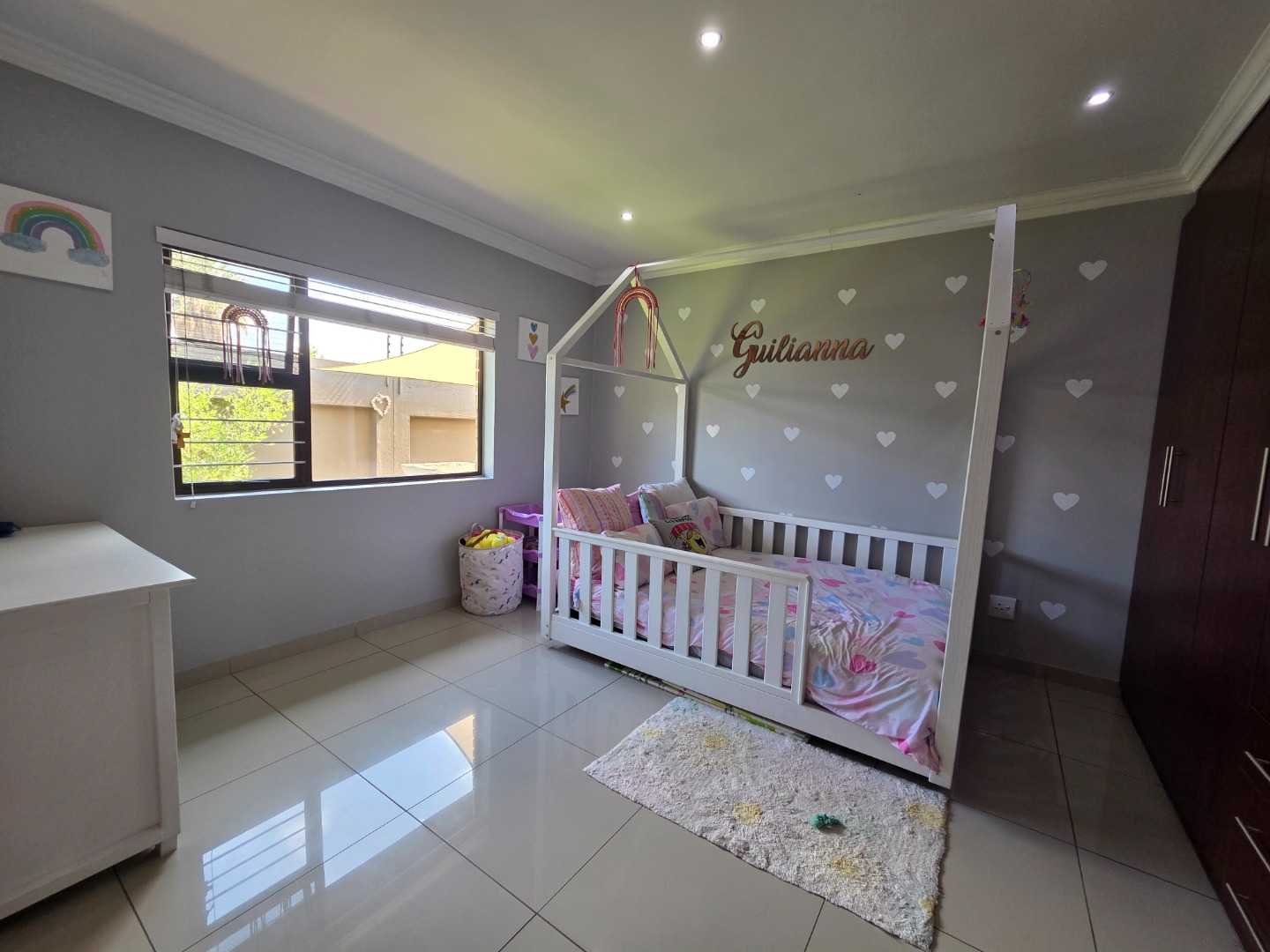 The home features three well-sized bedrooms and two fully tiled bathrooms, providing practical living space for the whole family. The spacious lounge is fitted with a built-in TV unit, creating a cozy yet stylish area to relax and entertain.