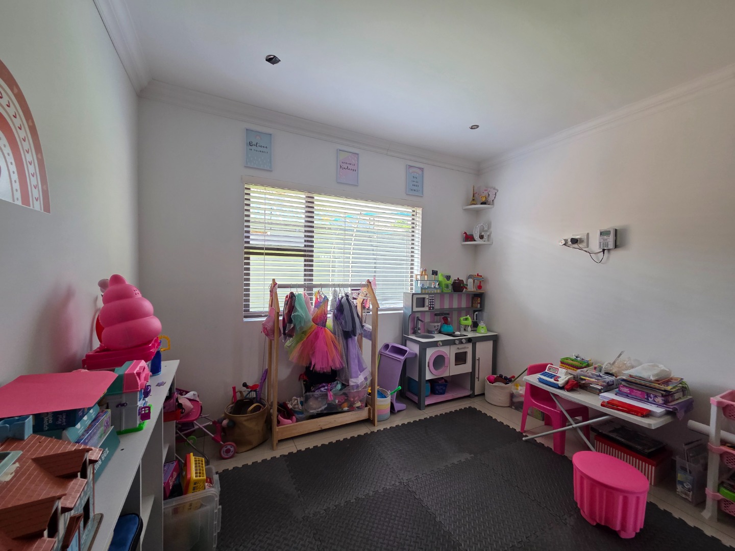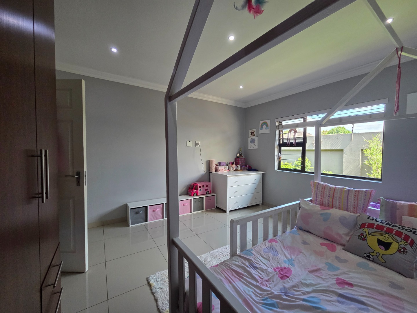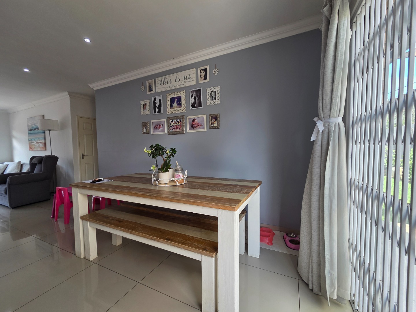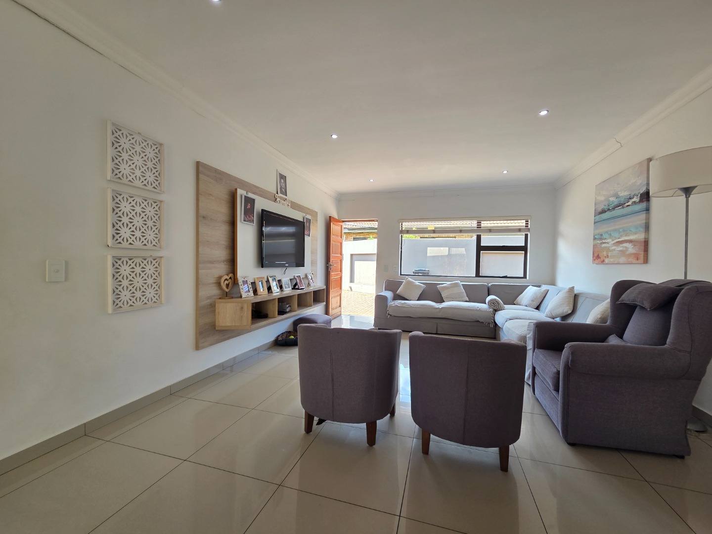 The home features three well-sized bedrooms and two fully tiled bathrooms, providing practical living space for the whole family. The spacious lounge is fitted with a built-in TV unit, creating a cozy yet stylish area to relax and entertain.