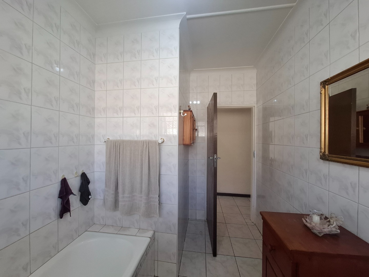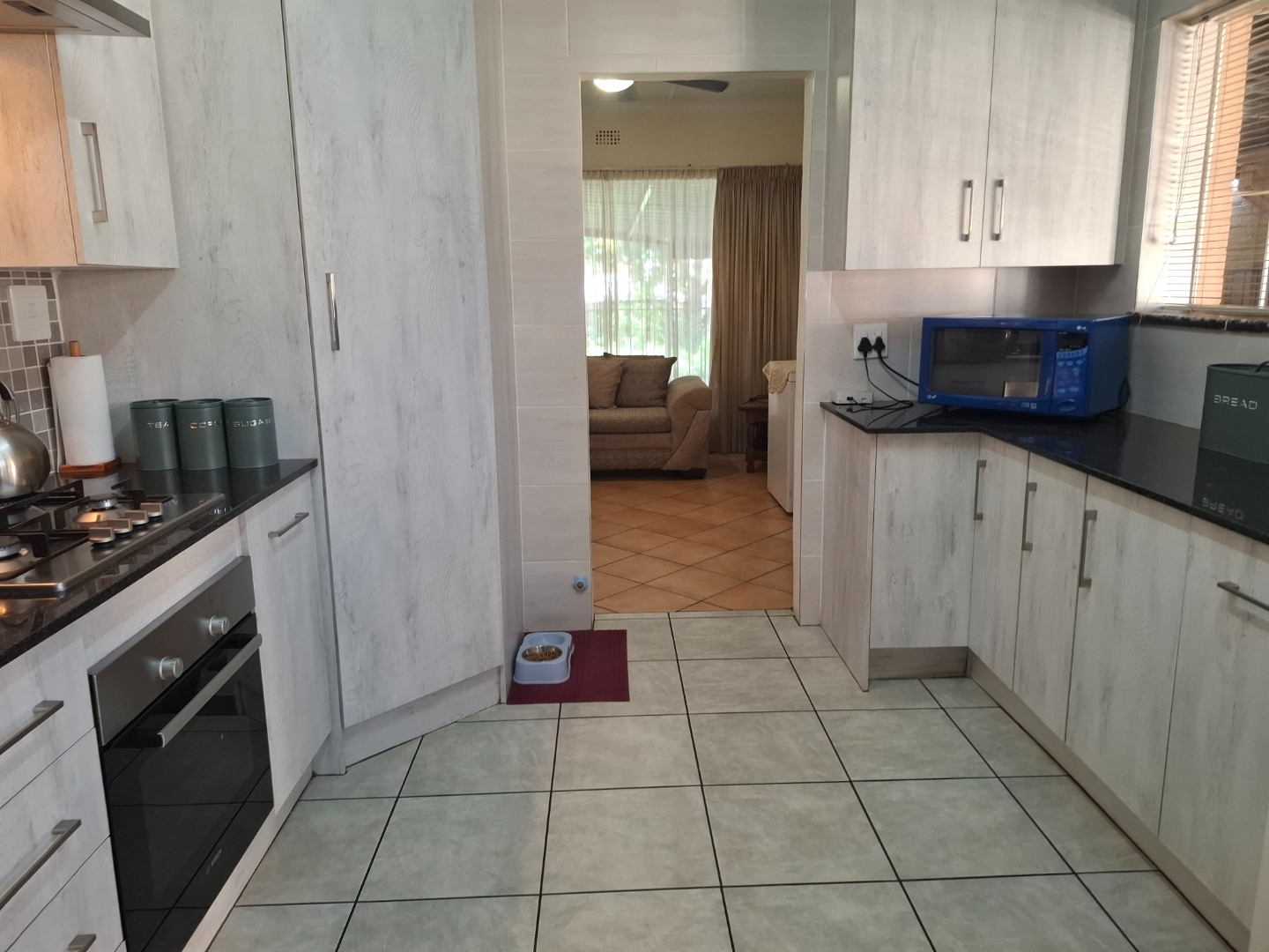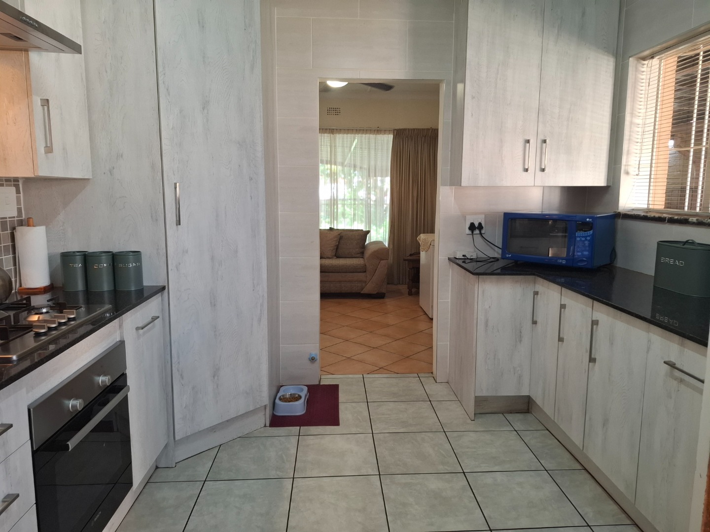 Inside, you’ll find three well-sized bedrooms, each fitted with built-in cupboards for ample storage. Two neatly maintained bathrooms—one with a relaxing bathtub and the other with a shower—serve the home with ease. The stylish kitchen is a standout feature, boasting granite countertops, a gas stove, hob, undercounter oven, extractor fan, and plenty of cupboard space to meet all your culinary needs.