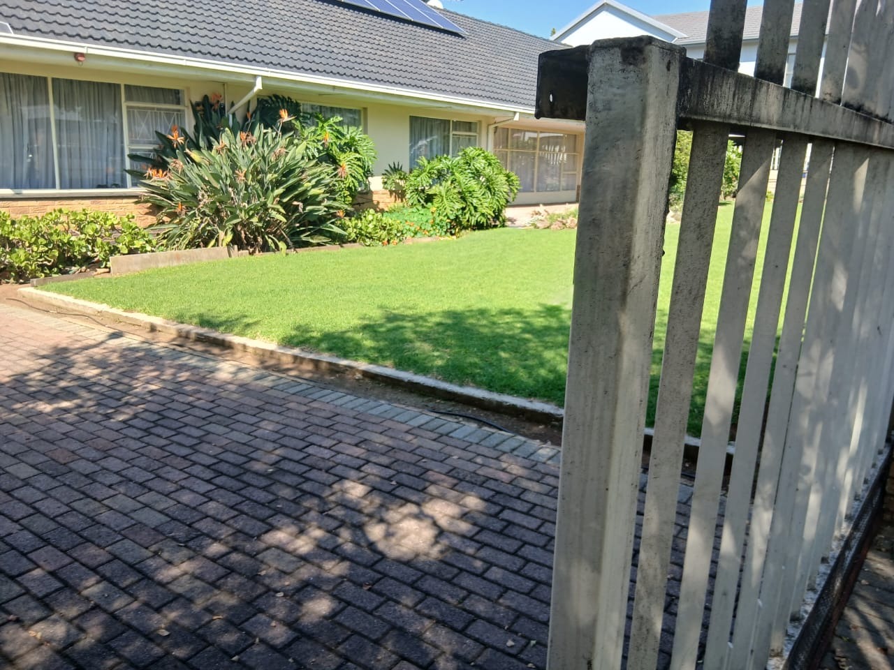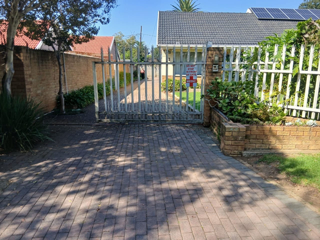 Step outside to a private garden, complemented by a charming patio, perfect for outdoor dining. The property benefits from a secure driveway leading to two garages, with a total of four parking spaces. Modern efficiencies include solar panels and a solar geyser for energy savings, alongside high-speed fibre internet connectivity.