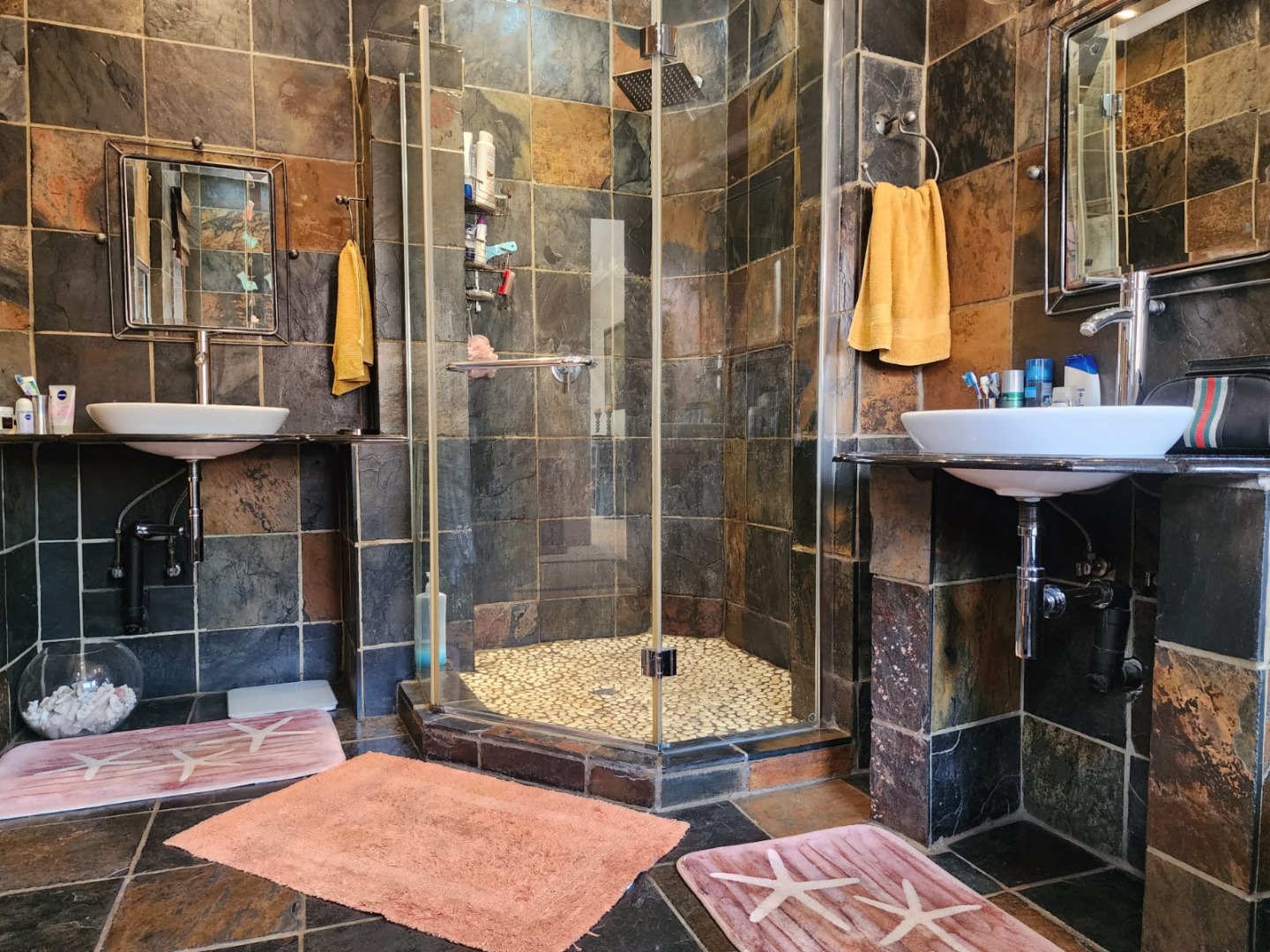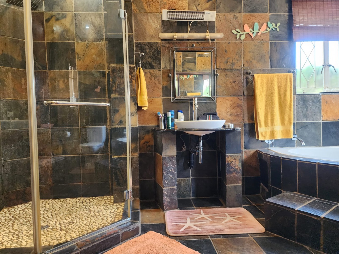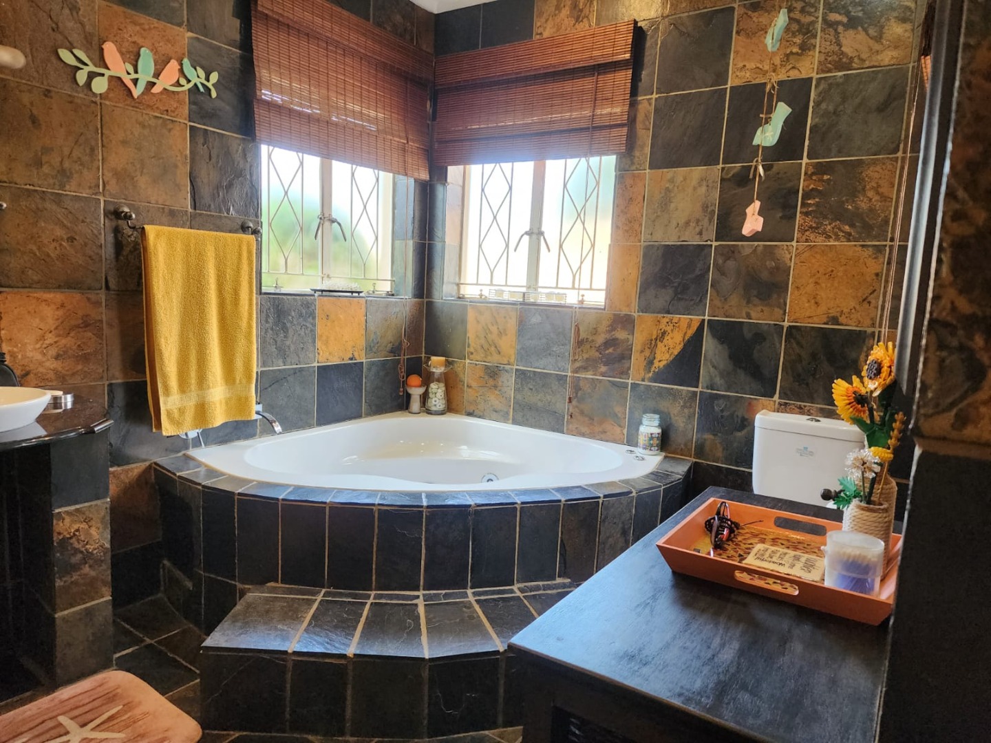 The property is serviced by 2.5 bathrooms, including a luxurious main en-suite with a corner bath, shower, double basins, toilet, and a built-in heater. A second full bathroom offers similar quality finishes, while a separate guest toilet adds convenience.