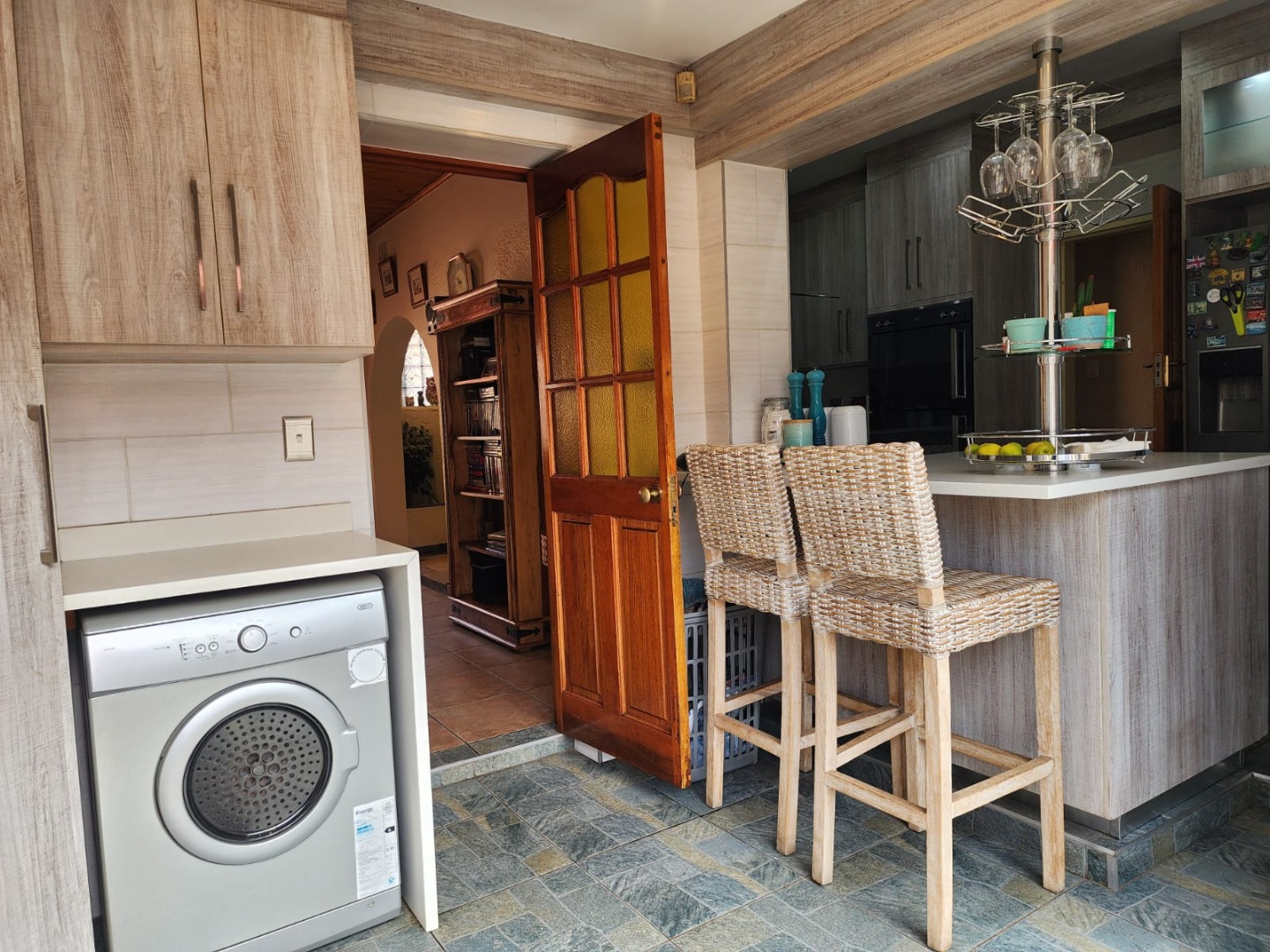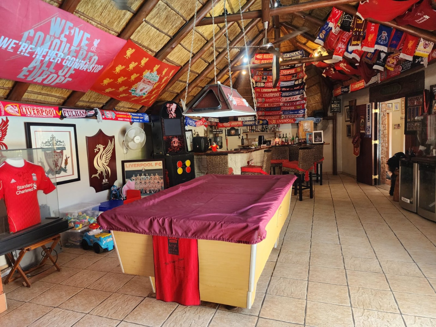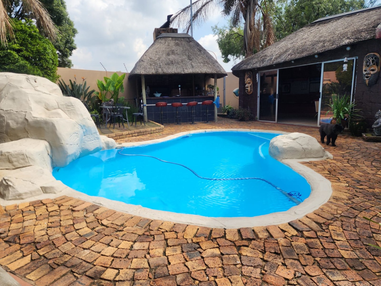 A dedicated indoor bar area, complete with built-in cabinetry and space for a pool table, further enhances the home’s entertainment appeal. An outdoor lapa with a built-in braai provides the perfect setting for relaxed gatherings and alfresco dining.