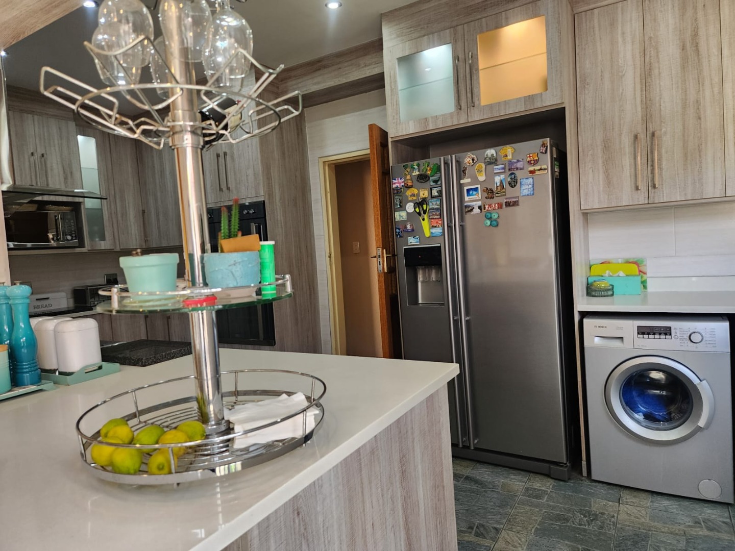 At the heart of the home is a stylish, well-equipped kitchen fitted with granite countertops, ample cupboard space, a gas hob, an electric eye-level oven, and room for a double-door fridge and additional appliances. A separate scullery ensures a neat and functional workspace.