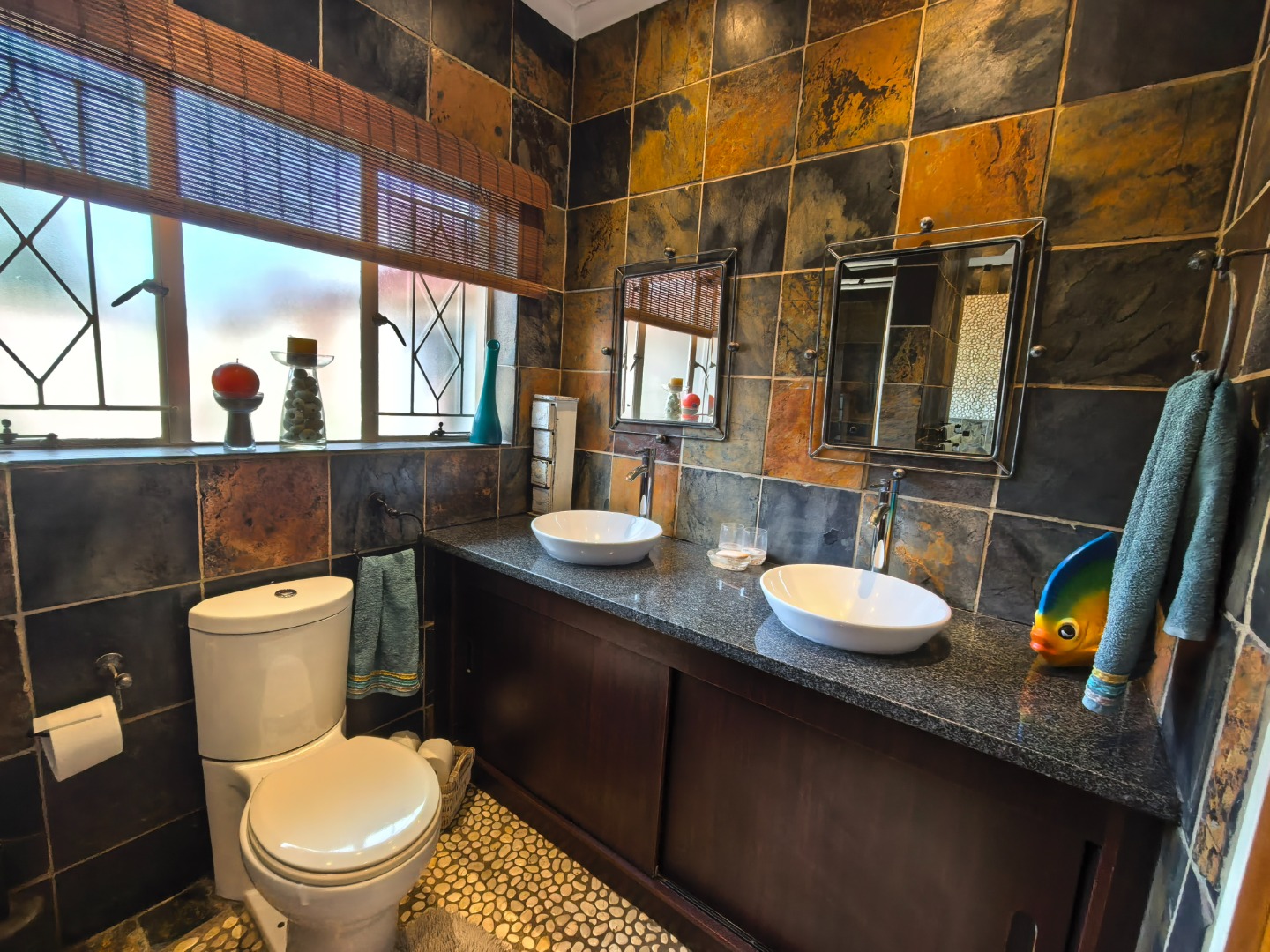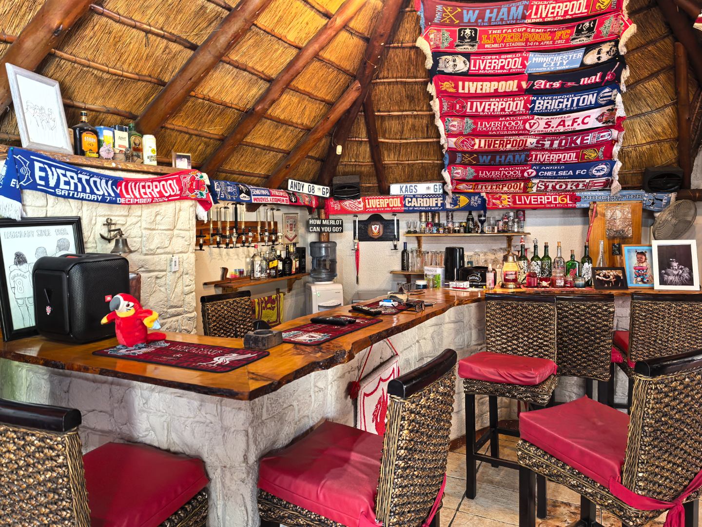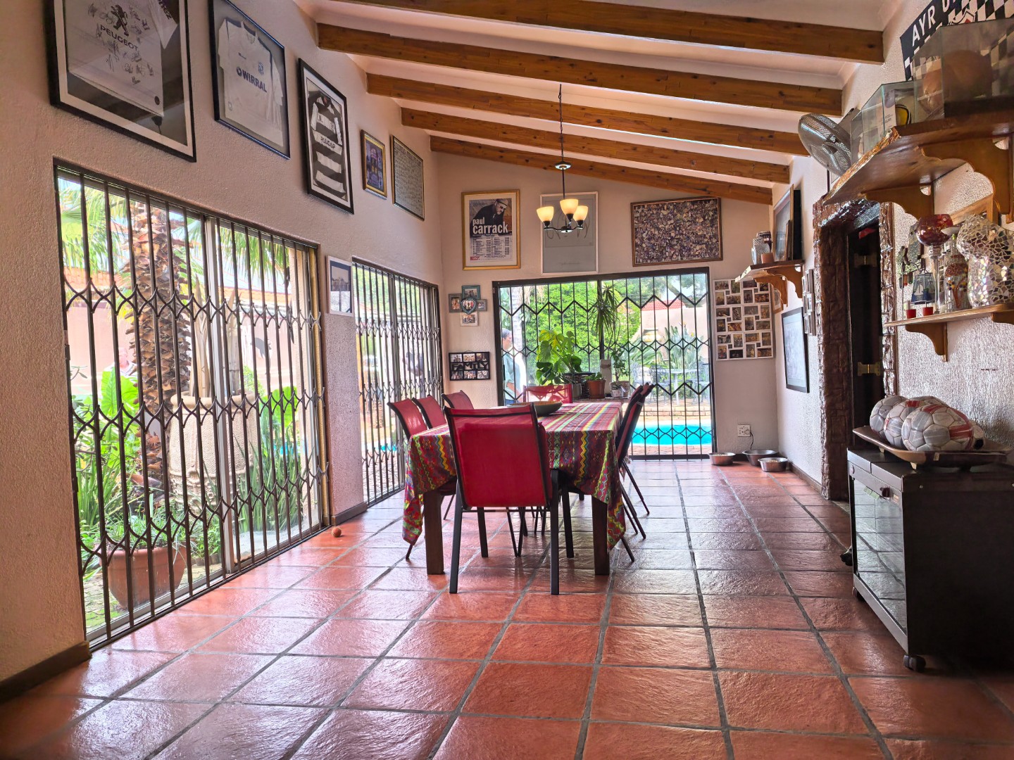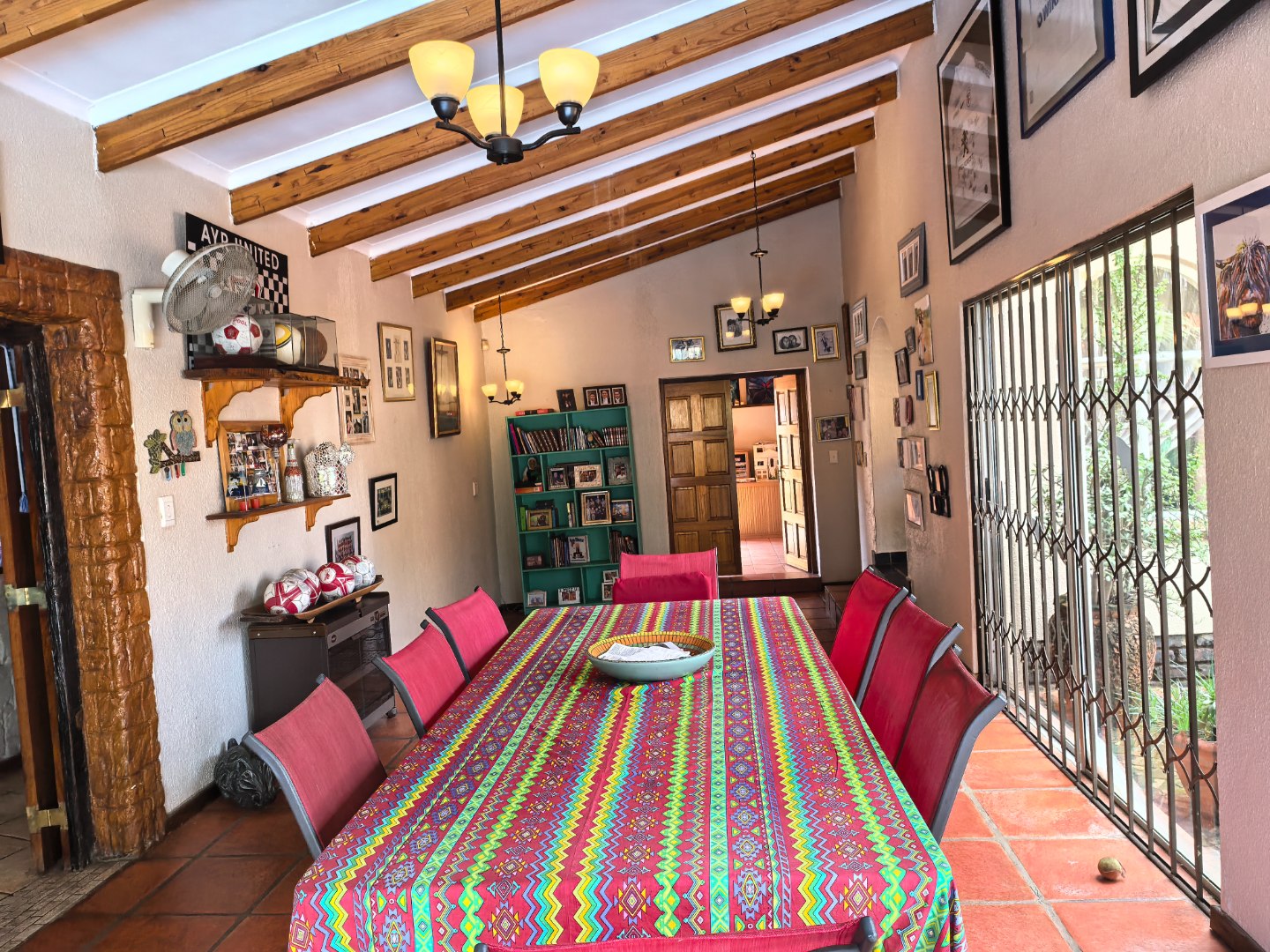 Step outside to discover a refreshing swimming pool and a charming lapa, creating an ideal setting for outdoor relaxation and entertaining. The property further benefits from three garages and four additional parking spaces, providing extensive secure parking. Modern features include solar panels for energy efficiency, complemented by electric fencing and an alarm system for enhanced security. Pets are permitted, making this an ideal home for animal lovers.