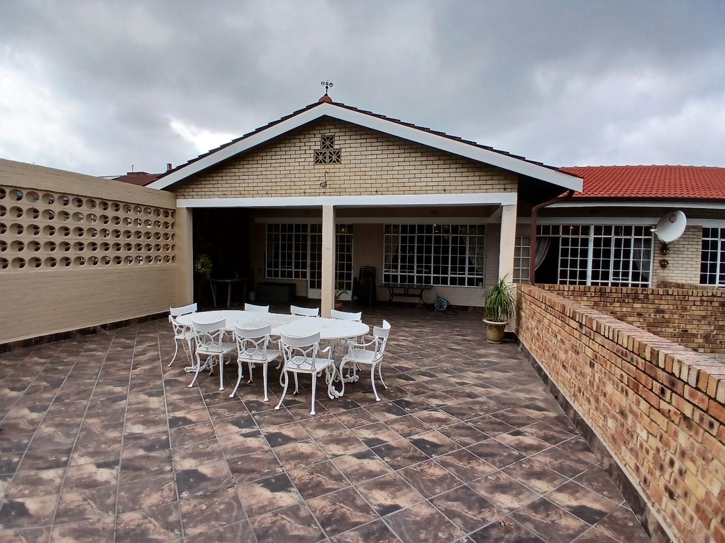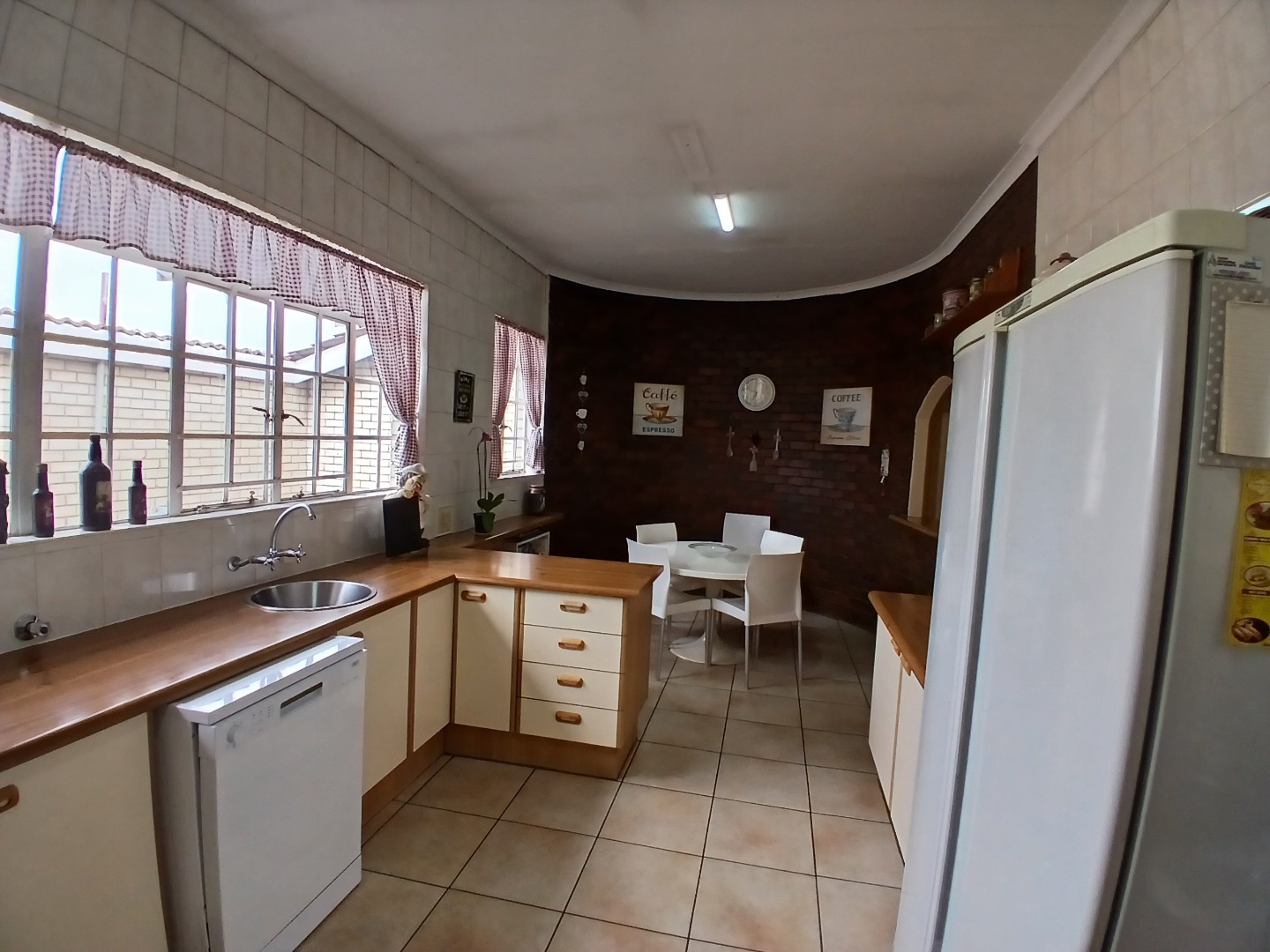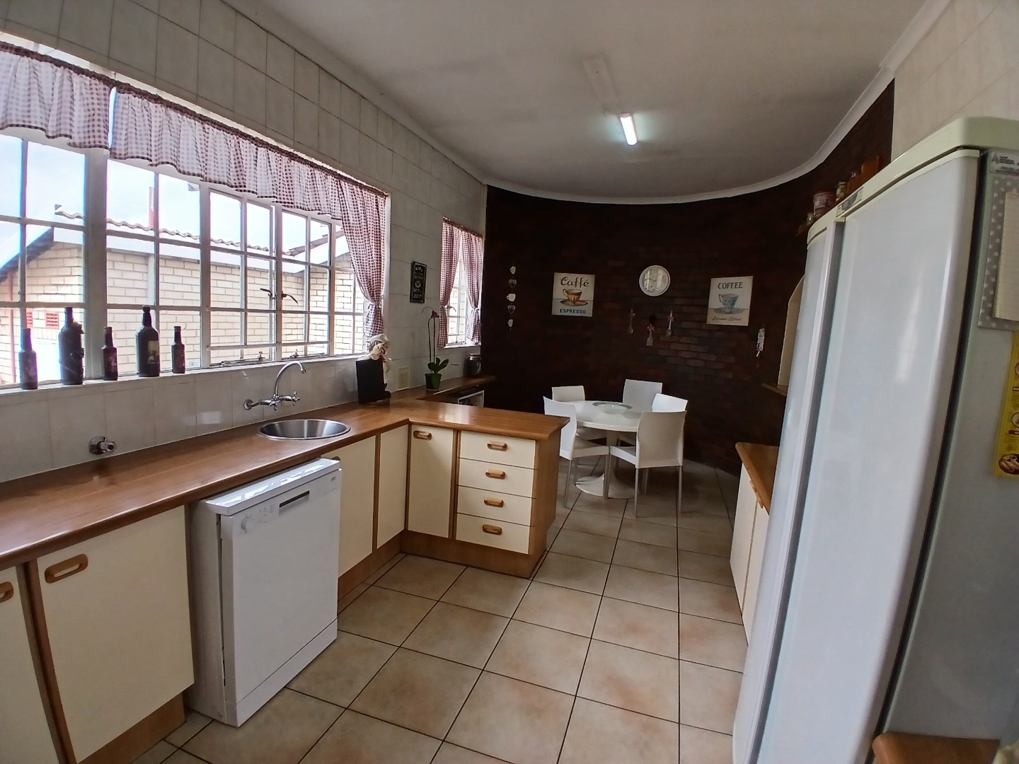 The modern kitchen is a chef’s delight, offering a cozy breakfast corner, ample cupboard space, and a separate washing bay. A back door leads to a second large patio complete with an outside toilet, adding to the home’s practicality.