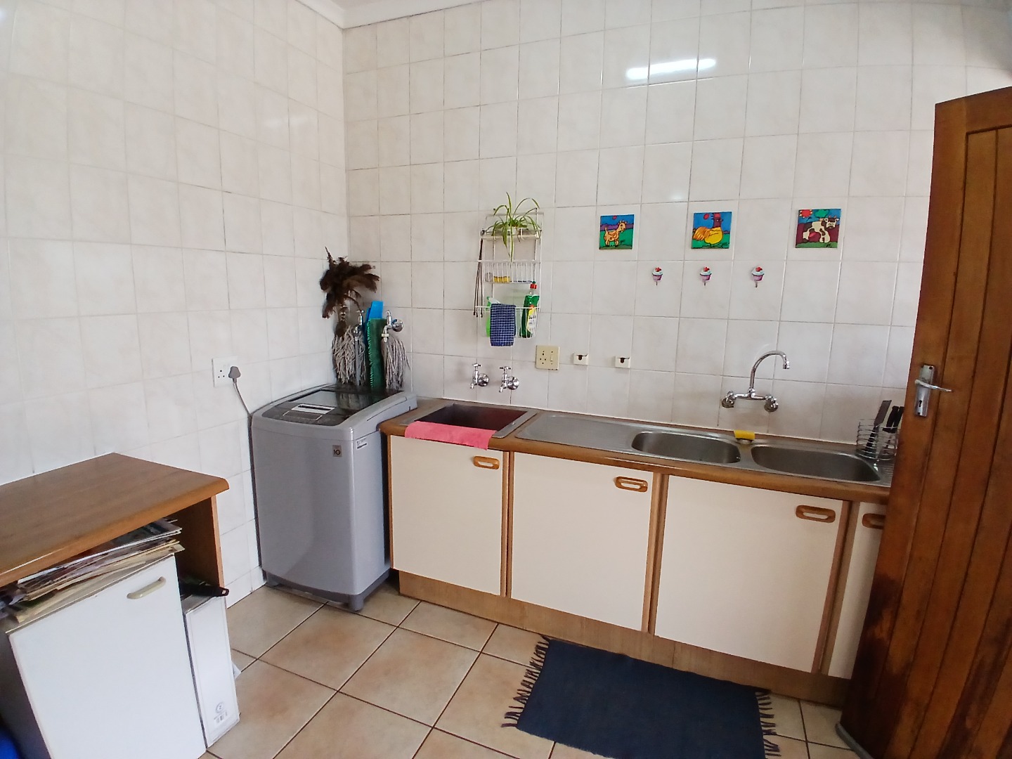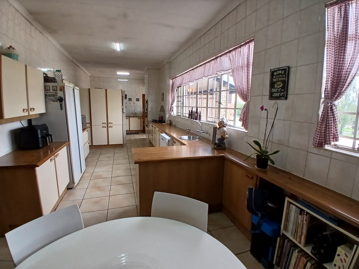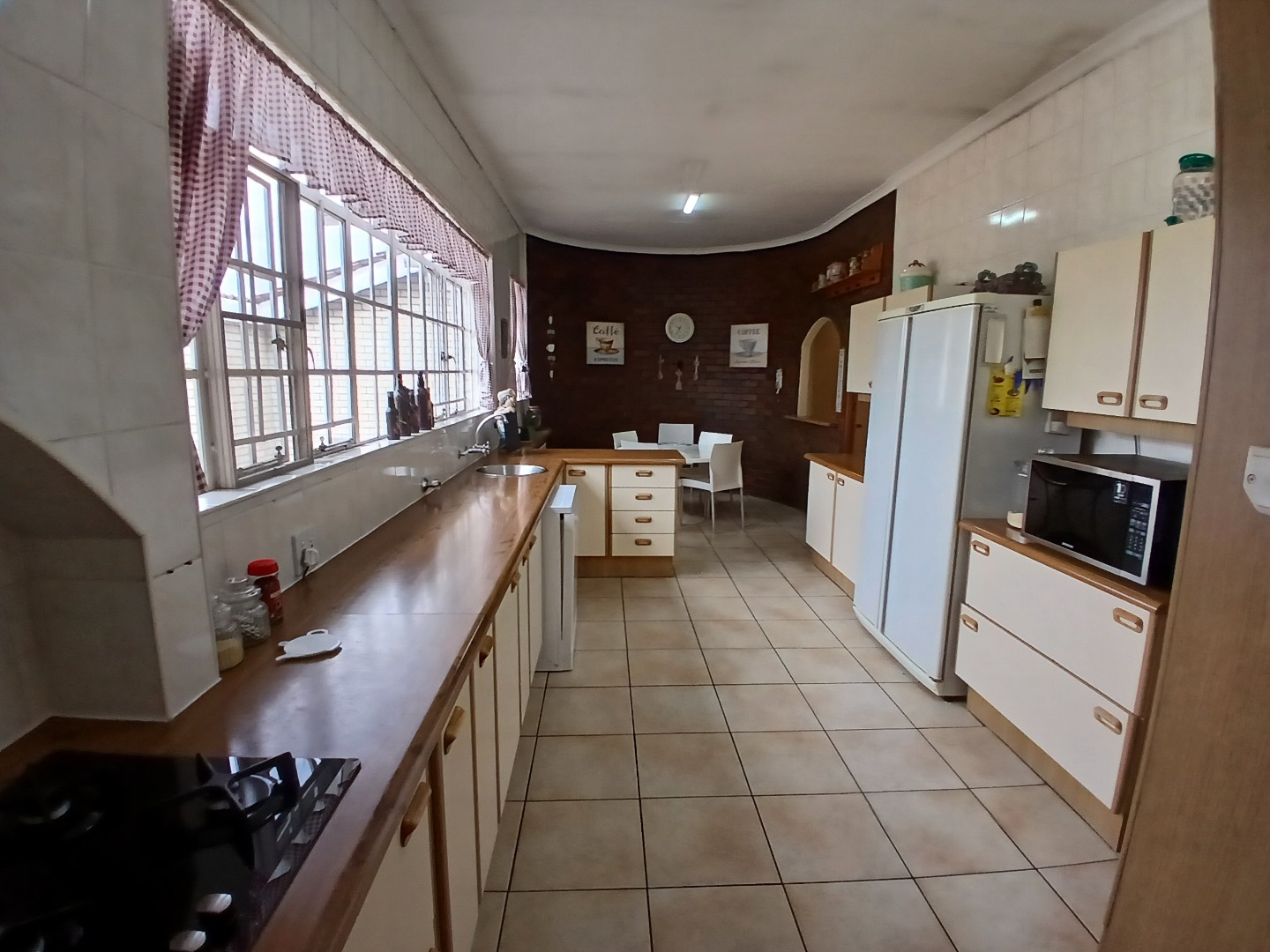 The modern kitchen is a chef’s delight, offering a cozy breakfast corner, ample cupboard space, and a separate washing bay. A back door leads to a second large patio complete with an outside toilet, adding to the home’s practicality.