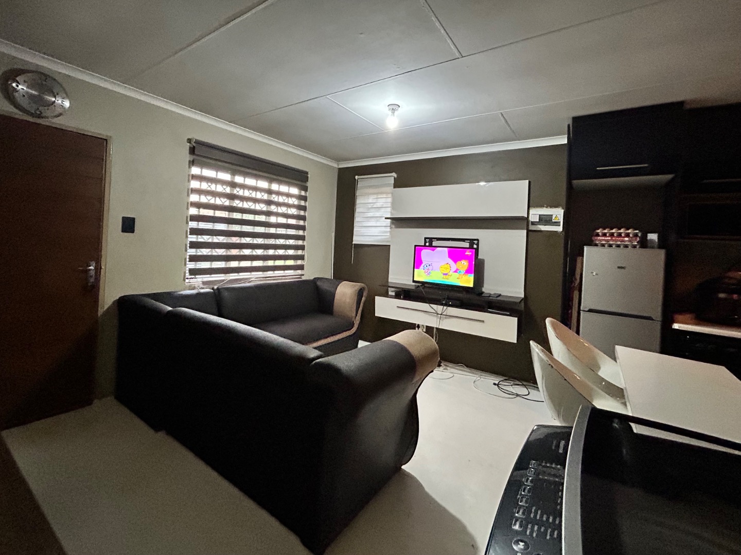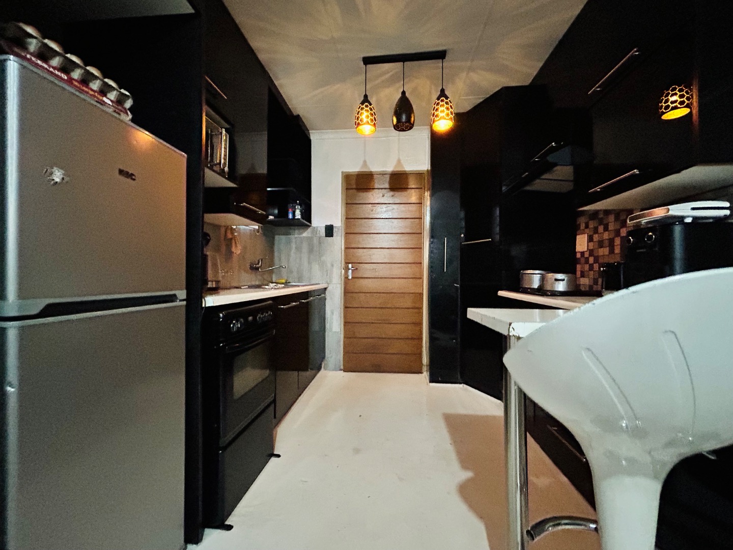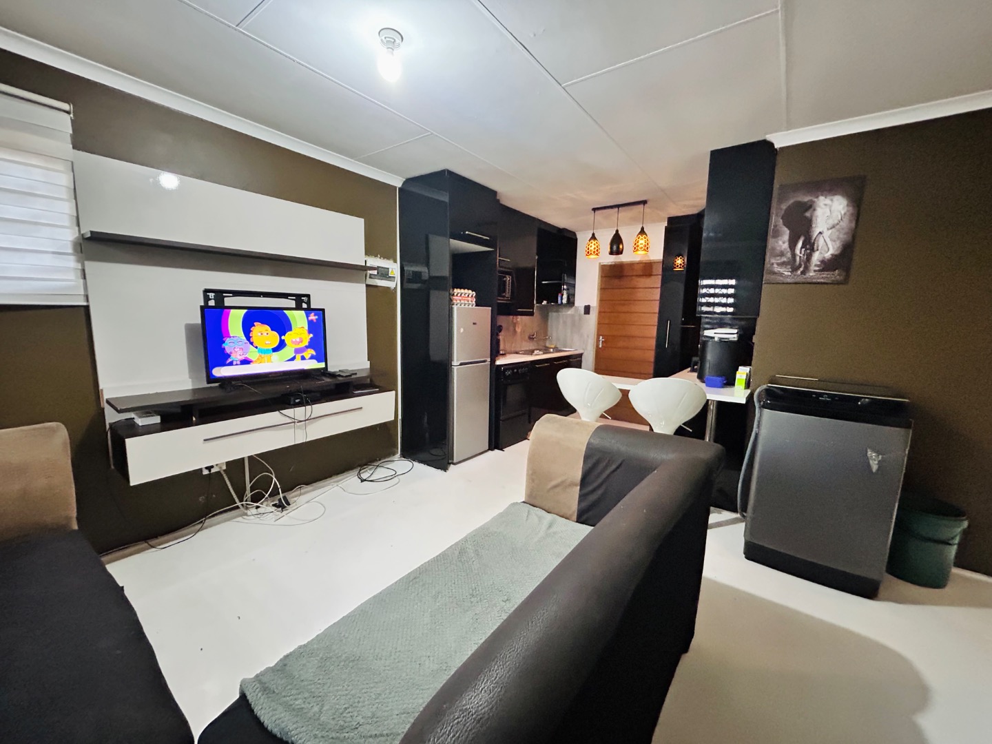 Step inside to an open-plan living area that seamlessly integrates with a contemporary kitchen, designed for both functionality and style. The kitchen boasts sleek black cabinetry, contrasting white countertops, and a practical breakfast bar complete with seating. It comes equipped with essential appliances including an oven, stovetop, fridge, and microwave, making meal preparation a breeze. The lounge area, featuring an L-shaped sofa and a wall-mounted TV unit, offers a comfortable space for relaxation, complemented by modern blinds for light control and privacy.