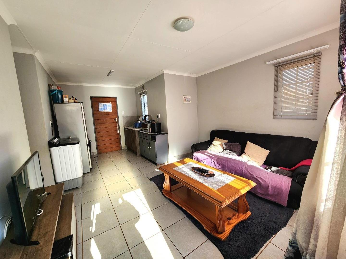 Open-plan lounge and kitchen with tiled flooring and simple curtain rails. The layout offers flexibility in furnishing and décor.