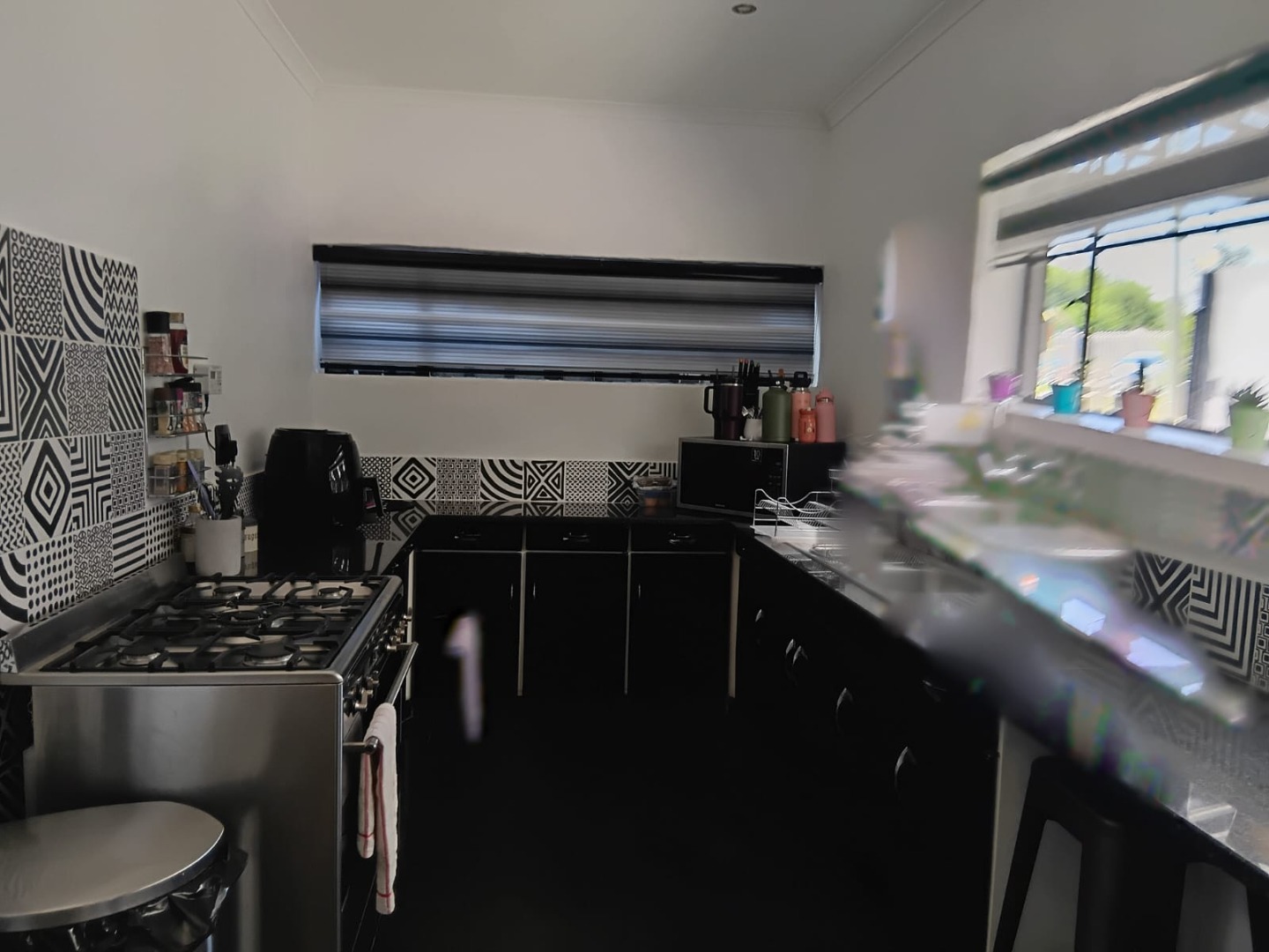 The kitchen is a standout feature, boasting a striking black-and-white design with: