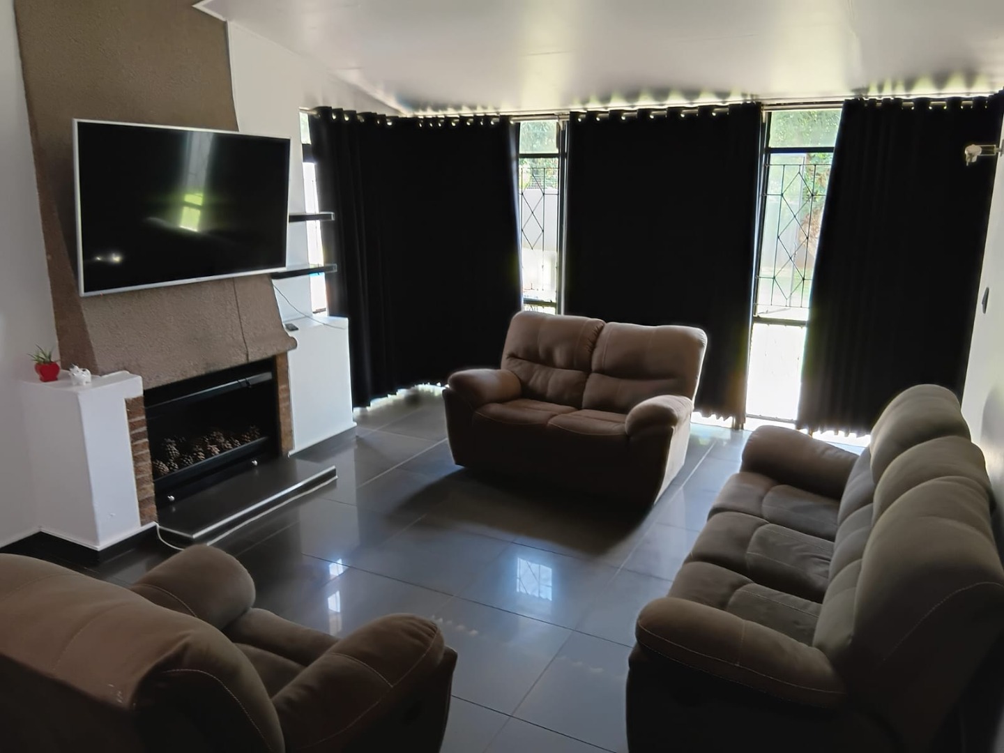 Step inside to spacious open-plan living and dining areas finished with sleek dark tiled flooring throughout. The inviting living room features large windows that allow for abundant natural light, an air-conditioning unit, and a cozy fireplace, creating a comfortable space for both everyday living and entertaining.