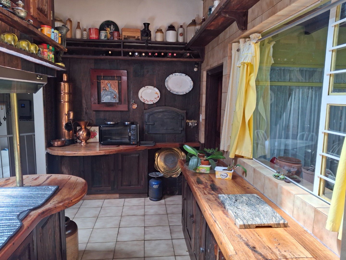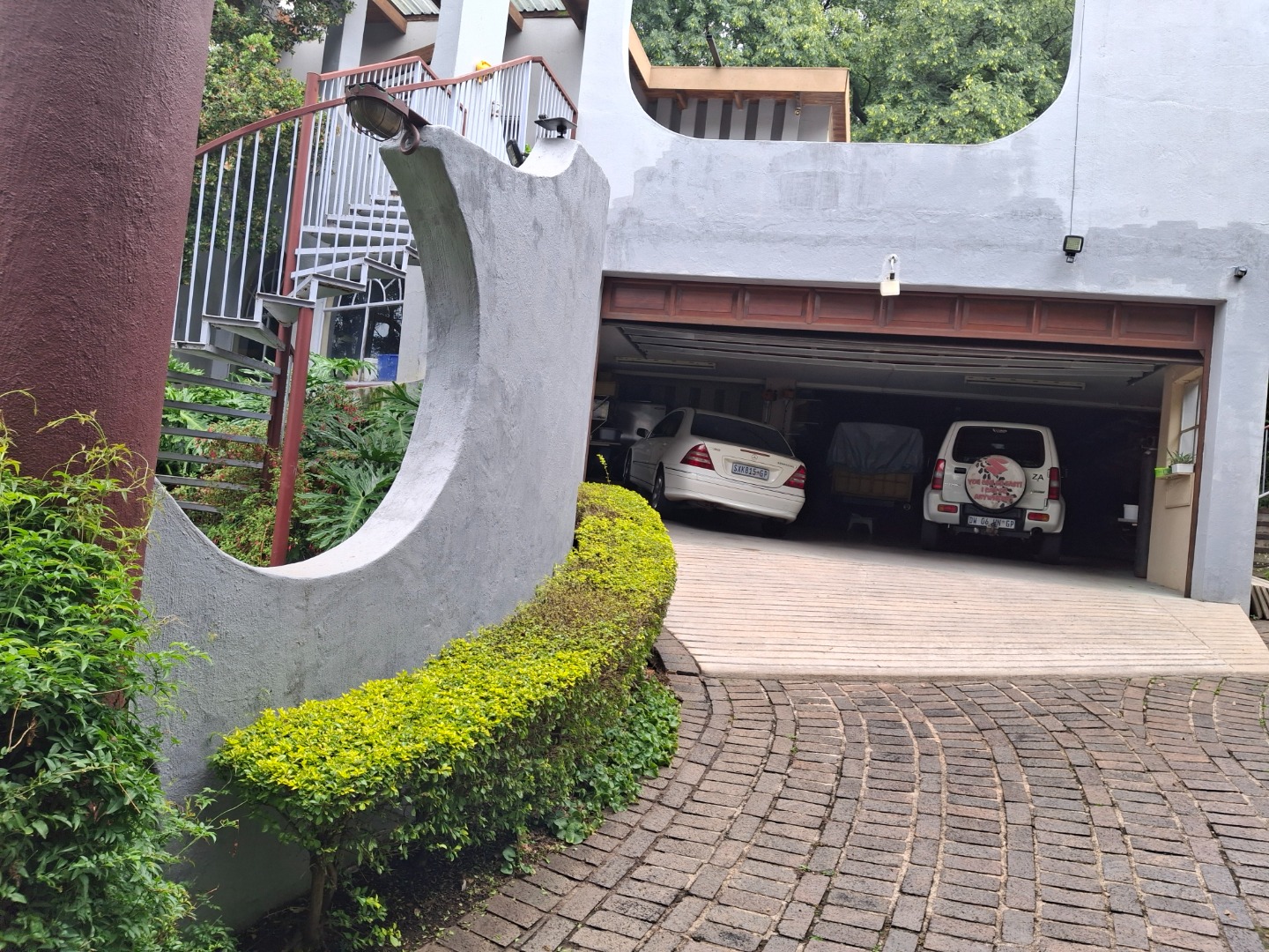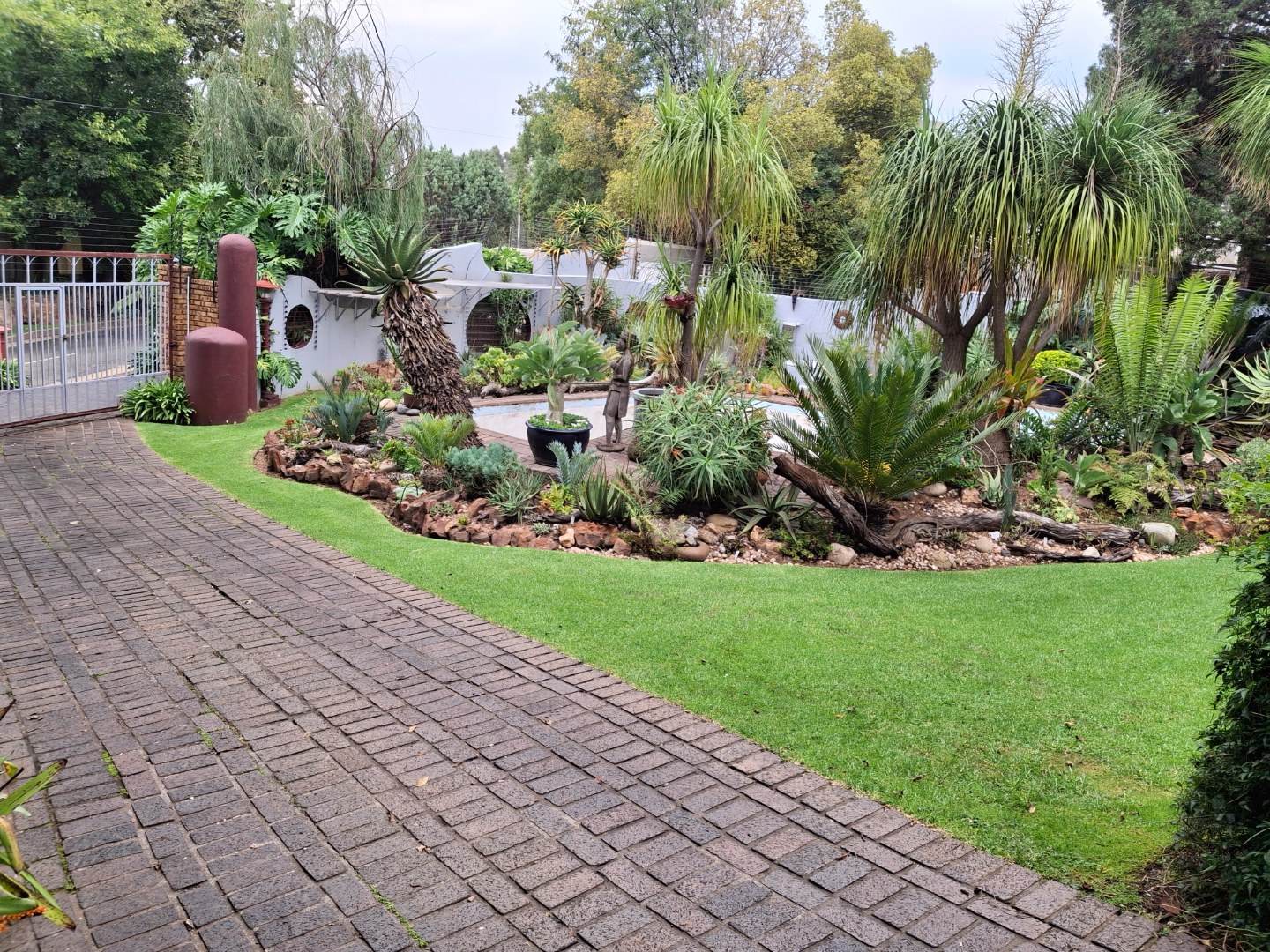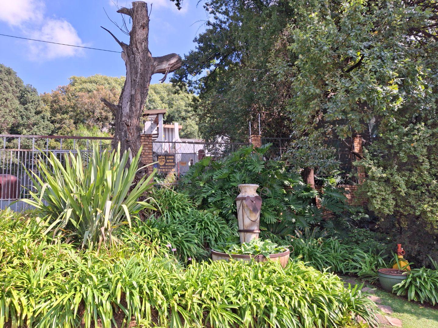 The huge garage (111 square meter) park 9 cars. The House can be entered safely from the garage. The outside room and separate bathroom can also be entered from inside the garage. Three additional storerooms, a laundry and an underroof greenhouse just offer so many opportunities. Melting into a beautiful garden one finds a quality (municipal plans) aviary for the bird or animal lover. The garden with all its trees, landscaping, borehole and huge swimming pool is surely something very special and rare. Peace of mind is guaranteed as the high walls, electric fencing, cameras, alarms and automated gates takes care of your safety.