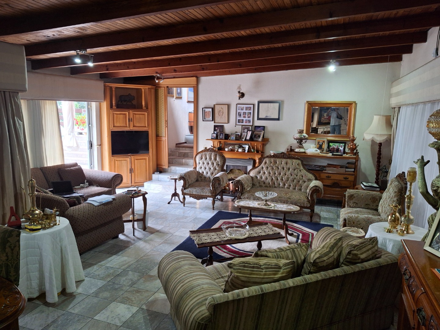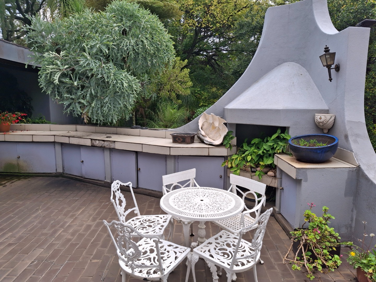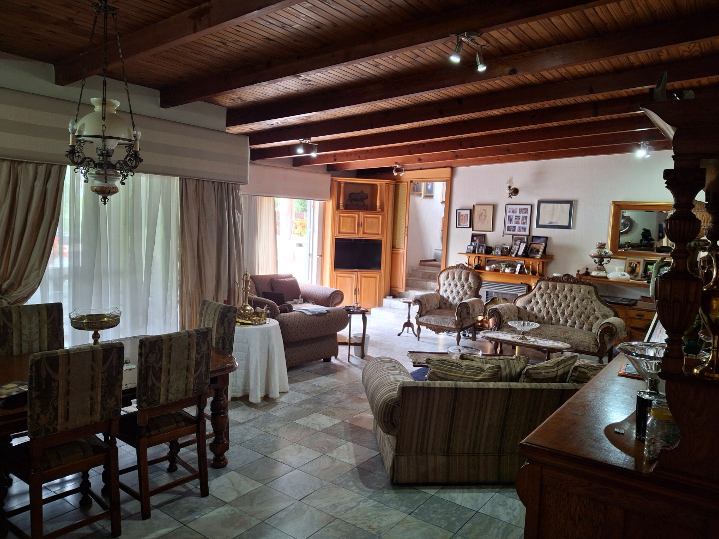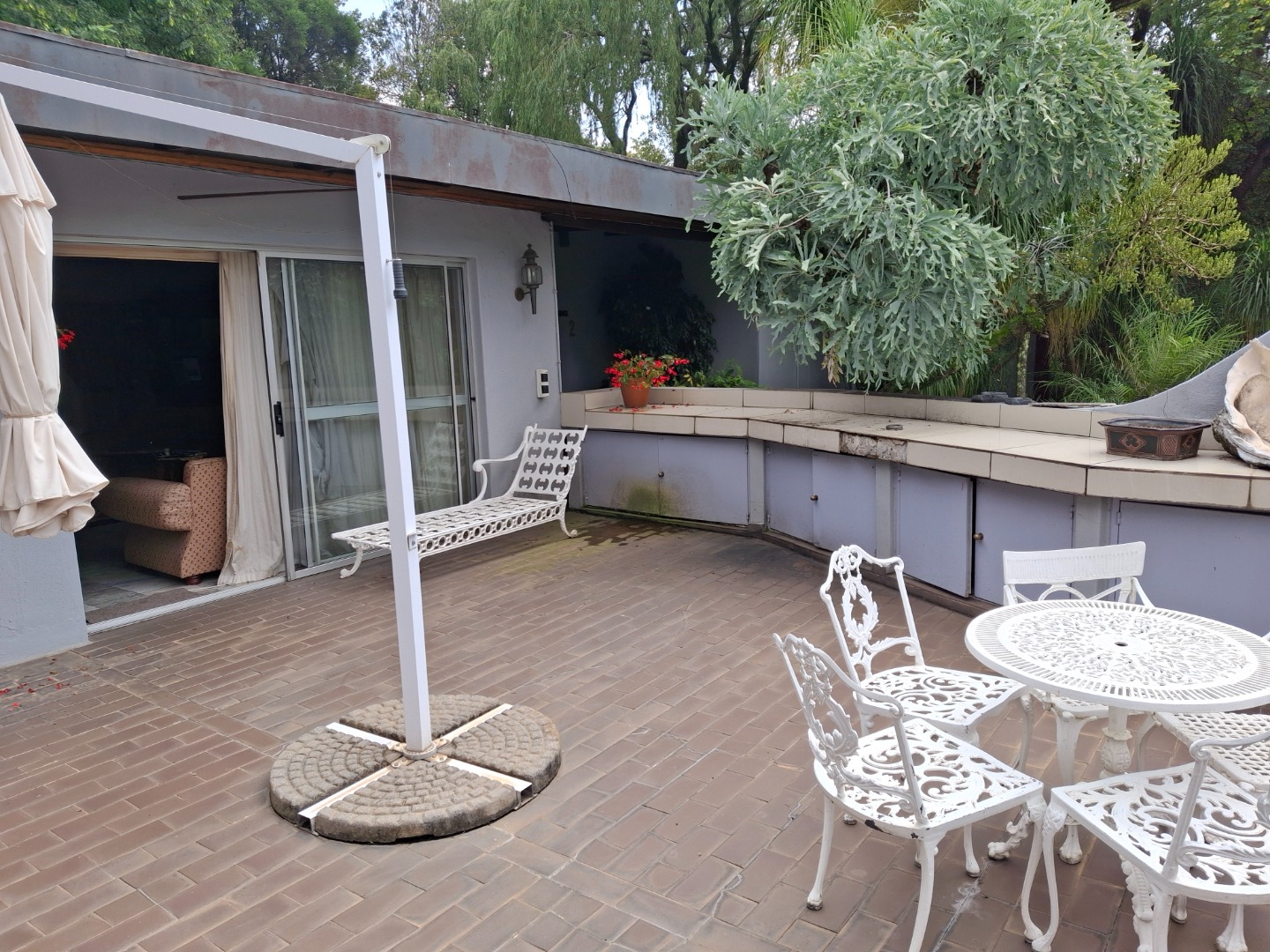 The huge garage (111 square meter) park 9 cars. The House can be entered safely from the garage. The outside room and separate bathroom can also be entered from inside the garage. Three additional storerooms, a laundry and an underroof greenhouse just offer so many opportunities. Melting into a beautiful garden one finds a quality (municipal plans) aviary for the bird or animal lover. The garden with all its trees, landscaping, borehole and huge swimming pool is surely something very special and rare. Peace of mind is guaranteed as the high walls, electric fencing, cameras, alarms and automated gates takes care of your safety.