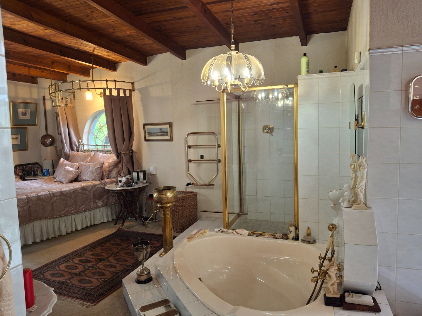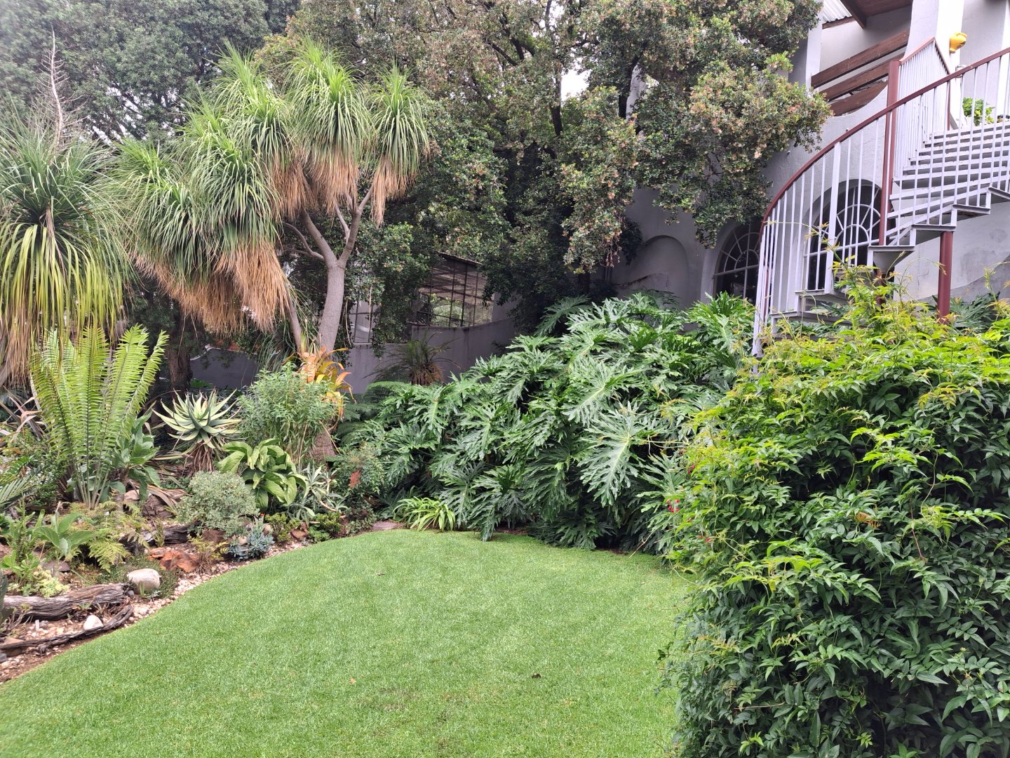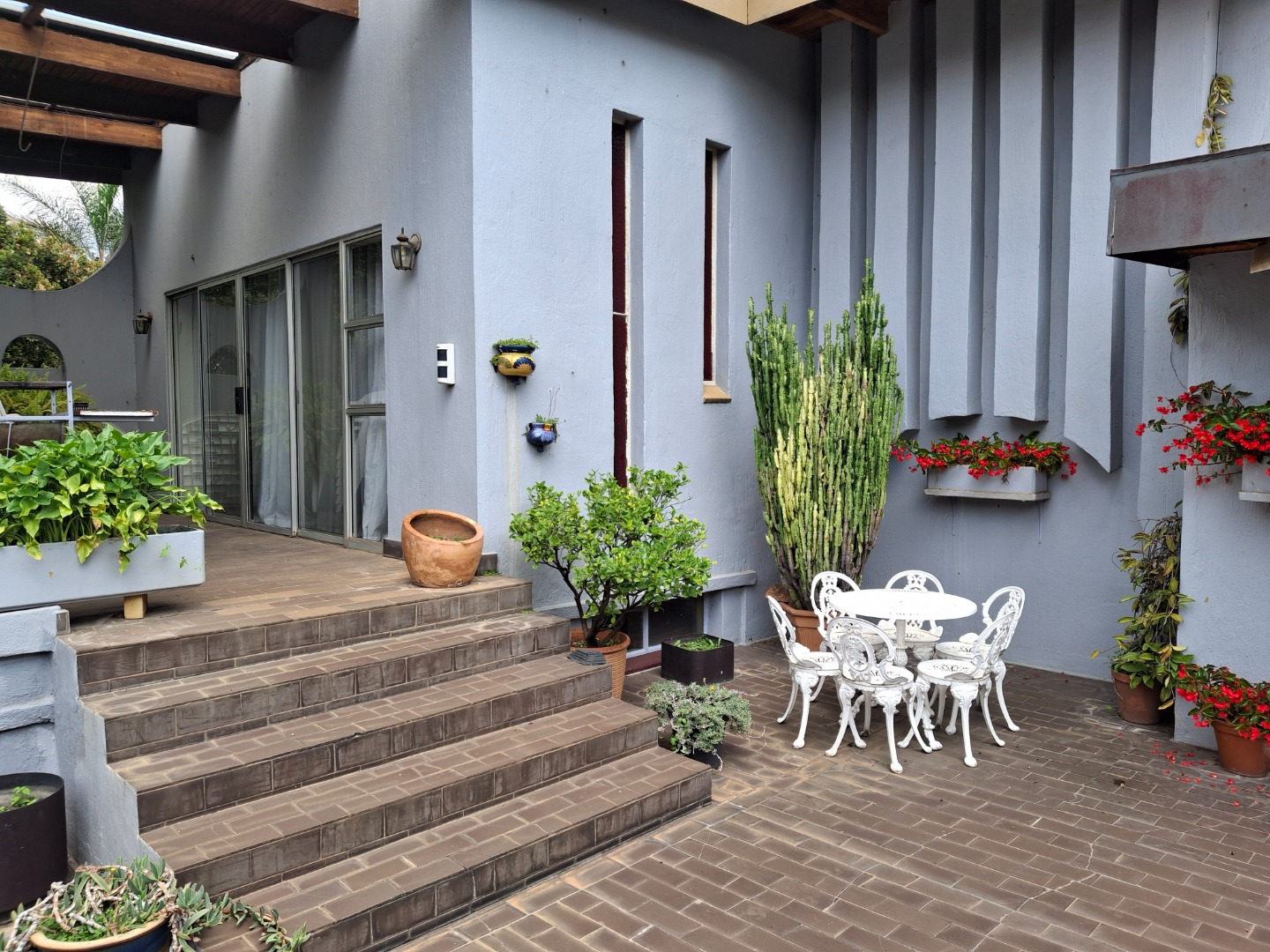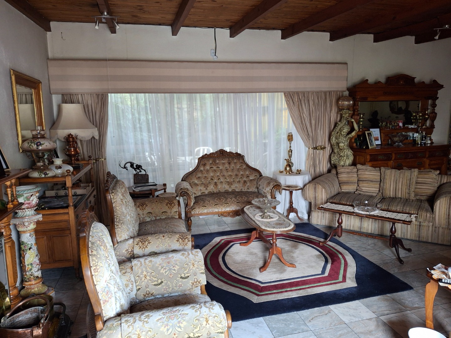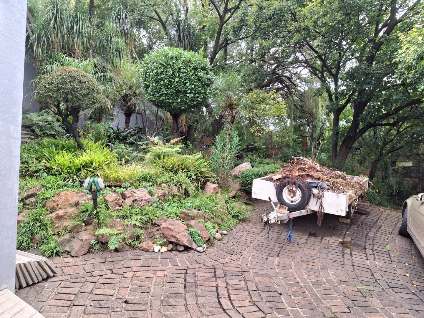The huge garage (111 square meter) park 9 cars. The House can be entered safely from the garage. The outside room and separate bathroom can also be entered from inside the garage. Three additional storerooms, a laundry and an underroof greenhouse just offer so many opportunities. Melting into a beautiful garden one finds a quality (municipal plans) aviary for the bird or animal lover. The garden with all its trees, landscaping, borehole and huge swimming pool is surely something very special and rare. Peace of mind is guaranteed as the high walls, electric fencing, cameras, alarms and automated gates takes care of your safety.