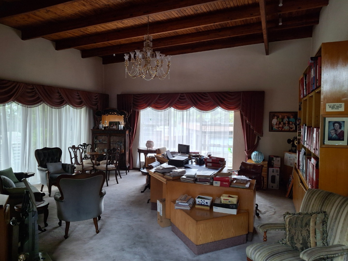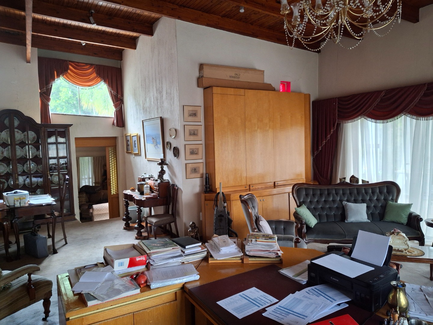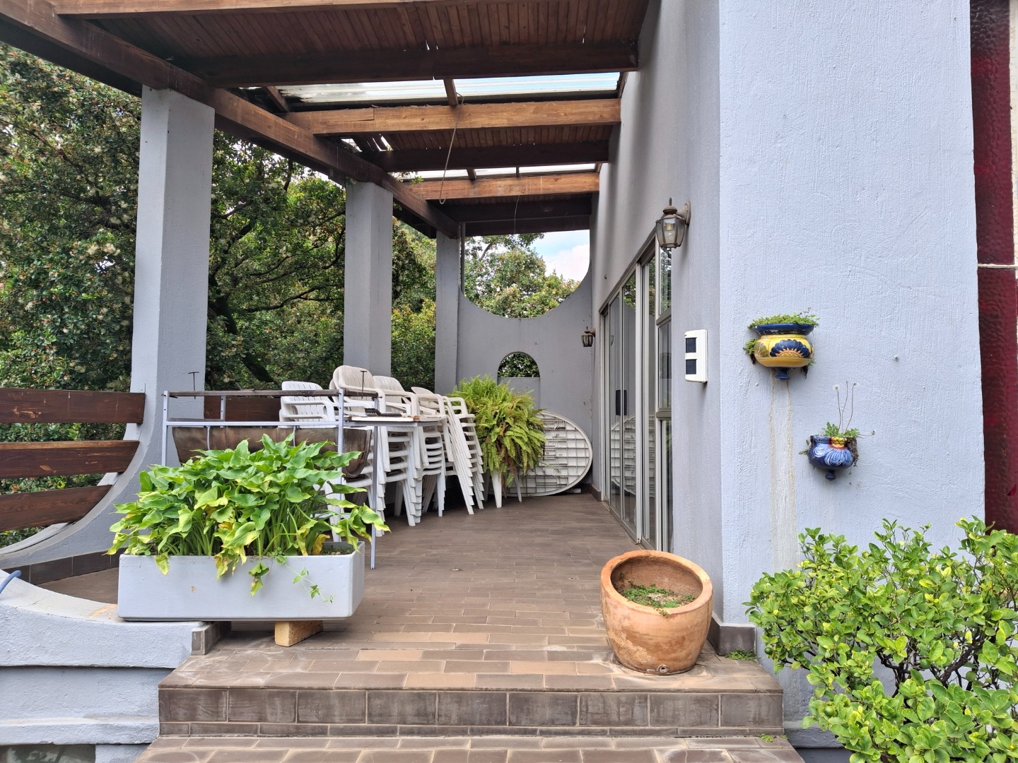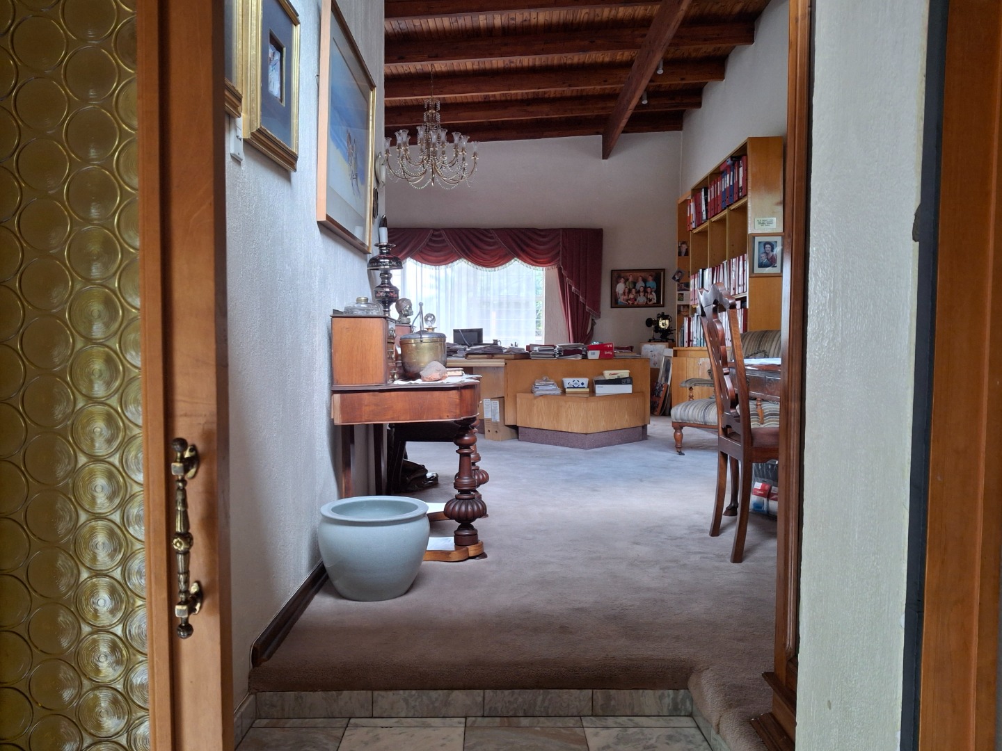 The huge garage (111 square meter) park 9 cars. The House can be entered safely from the garage. The outside room and separate bathroom can also be entered from inside the garage. Three additional storerooms, a laundry and an underroof greenhouse just offer so many opportunities. Melting into a beautiful garden one finds a quality (municipal plans) aviary for the bird or animal lover. The garden with all its trees, landscaping, borehole and huge swimming pool is surely something very special and rare. Peace of mind is guaranteed as the high walls, electric fencing, cameras, alarms and automated gates takes care of your safety.