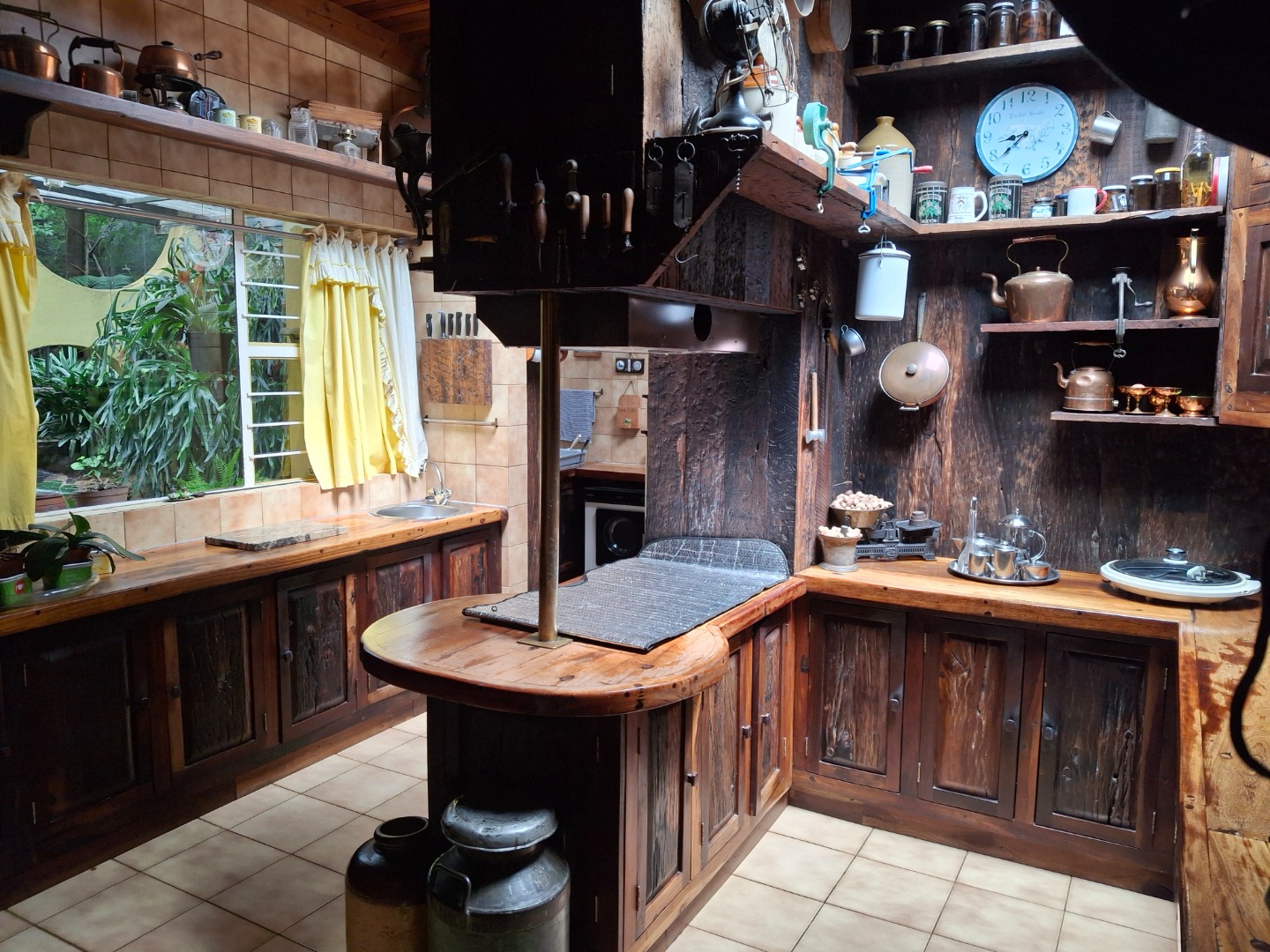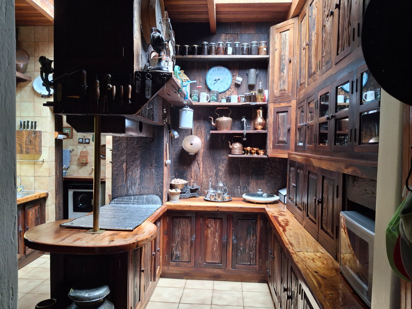 The spacious kitchen is fitted with sleeper wood cupboards and includes a practical pizza oven. The kitchen door leads to a sunny underroof tea garden.