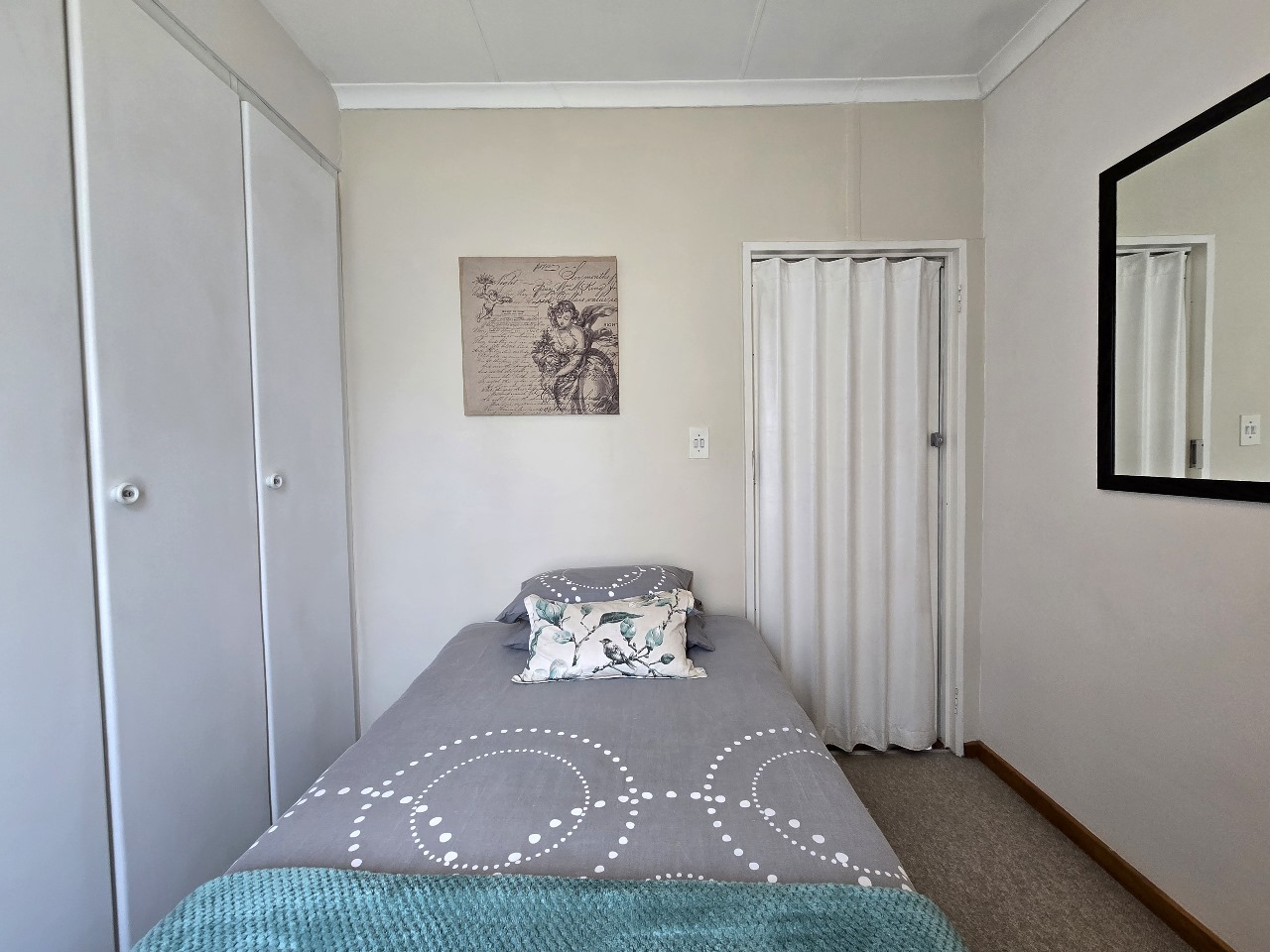 Discover this charming single-story home, ideally situated in a secure complex within the suburban heart of Verwoerdpark, Alberton. Boasting a distinctive green tiled roof and a well-maintained exterior, the property offers immediate kerb appeal with its lush garden, paved driveway, and secure gated entrance leading to a welcoming covered patio. The interior features a bright and airy lounge, complete with hardwood-style flooring, neutral walls, and large windows that invite ample natural light. Security bars on the windows provide peace of mind. Adjacent to this comfortable living space is a dedicated dining room, perfect for family meals and entertaining. The functional kitchen is equipped with white cabinetry, dark granite-look countertops, a white tiled backsplash, an electric stovetop, and a built-in oven, offering good storage and counter space. This residence comprises two well-proportioned bedrooms, each featuring soft carpeting, neutral walls, and ceiling fans for comfort. Ample built-in wardrobes ensure generous storage, while large windows maintain a bright atmosphere. The home includes two fully tiled bathrooms, both fitted with a bathtub and overhead shower, a pedestal sink, and a toilet, providing practical and easy-to-maintain facilities. Outdoor living is a highlight, with a spacious, healthy lawn and a prominent thatched-roof lapa, creating an excellent space for outdoor entertainment and relaxation. A single garage provides secure parking and additional storage. This property, with an erf size of 408 sqm and a floor size of 115 sqm, offers a comfortable and secure lifestyle. Verwoerdpark is a well-established residential area in Alberton, known for its family-friendly environment and convenient access to local amenities, schools, and major transport routes, making it a desirable location for homeowners. Key Features: * Two comfortable bedrooms with built-in wardrobes * Two fully tiled bathrooms with bathtubs * Spacious lounge and dedicated dining room * Functional kitchen with ample storage * Secure gated entrance and paved driveway * Thatched lapa for outdoor entertaining * Well-maintained garden and lawn * Single garage for secure parking * Located in a secure complex * Erf Size: 408 sqm, Floor Size: 115 sqm
