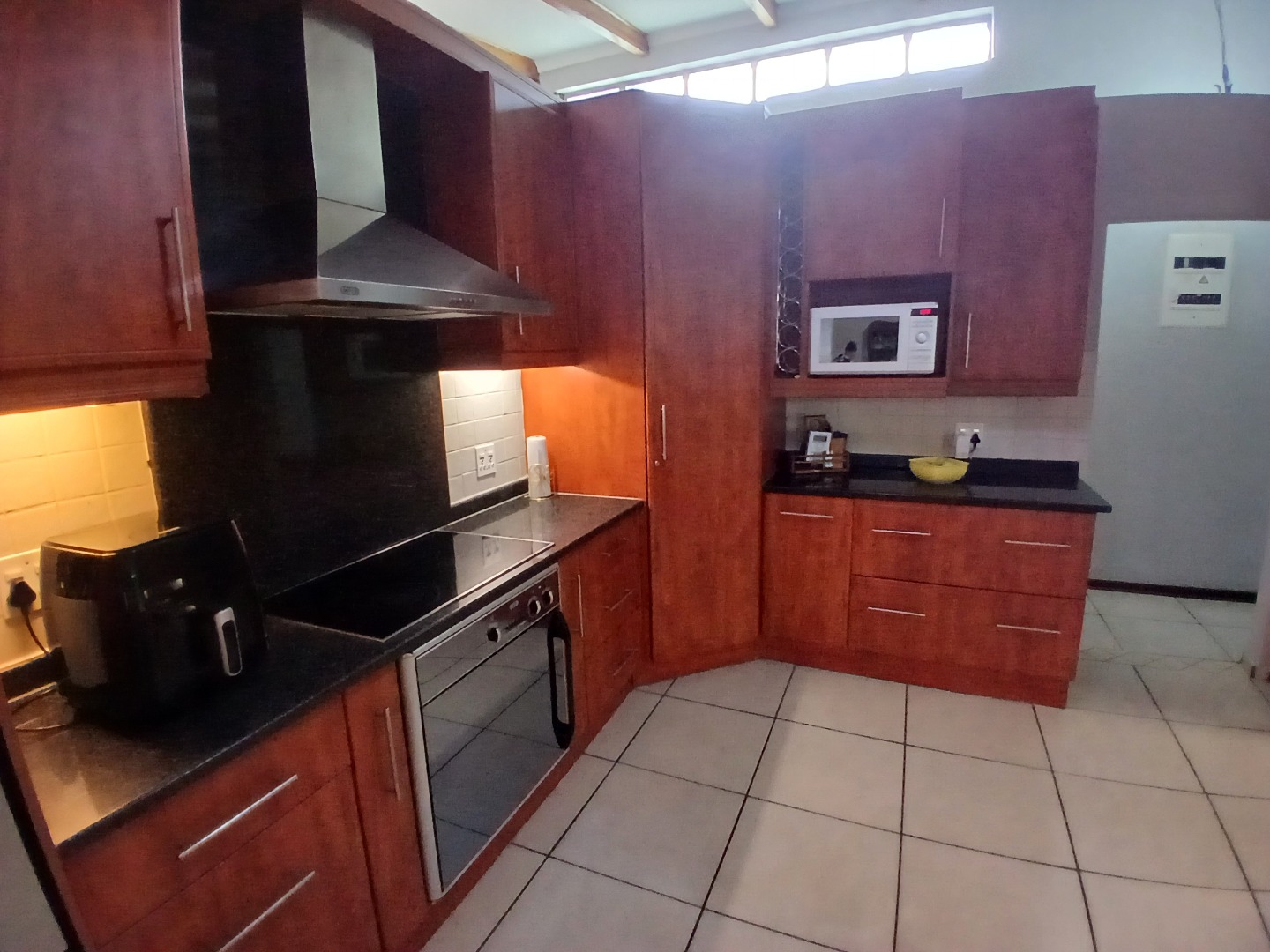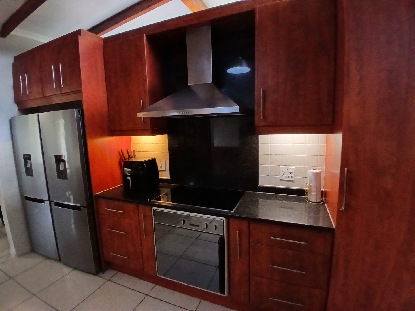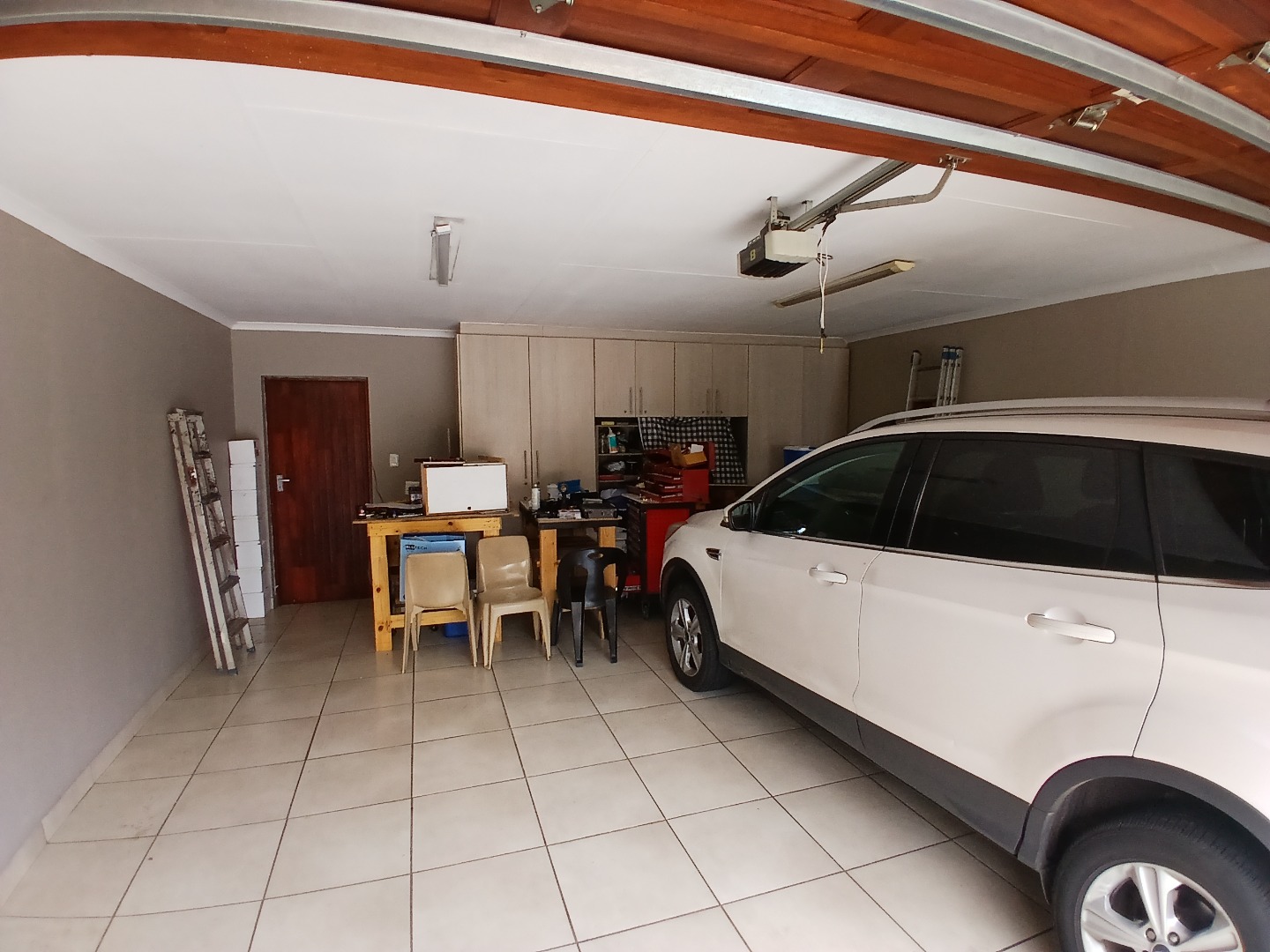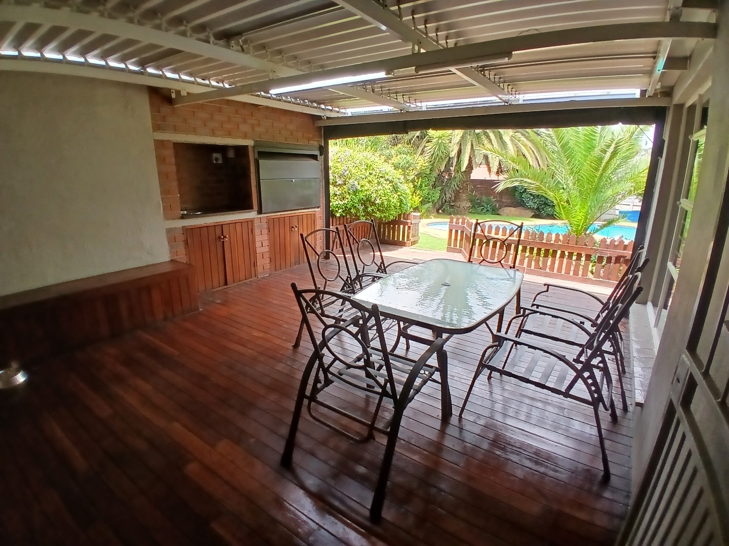 The home welcomes you with beautifully maintained grounds, featuring a sparkling swimming pool and an enclosed entertainment deck with a built-in braai, ideal for hosting family and friends.
