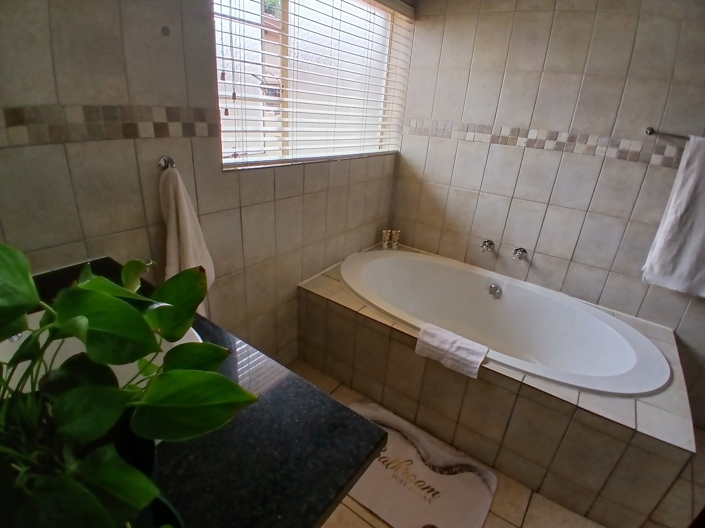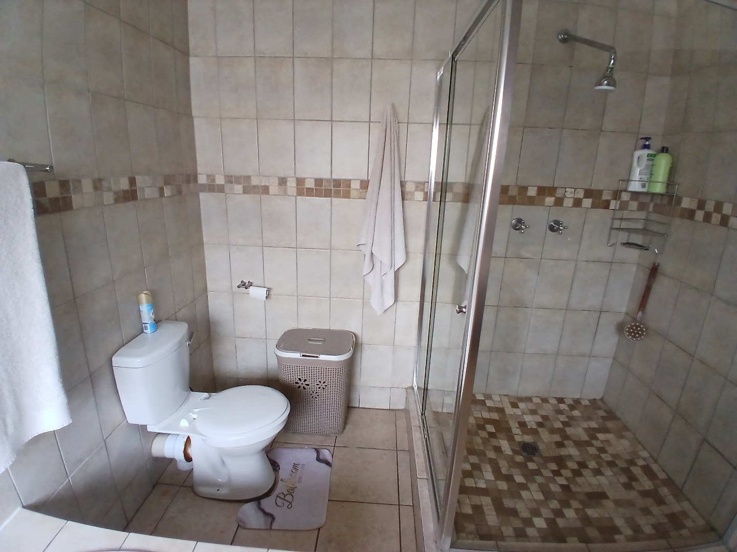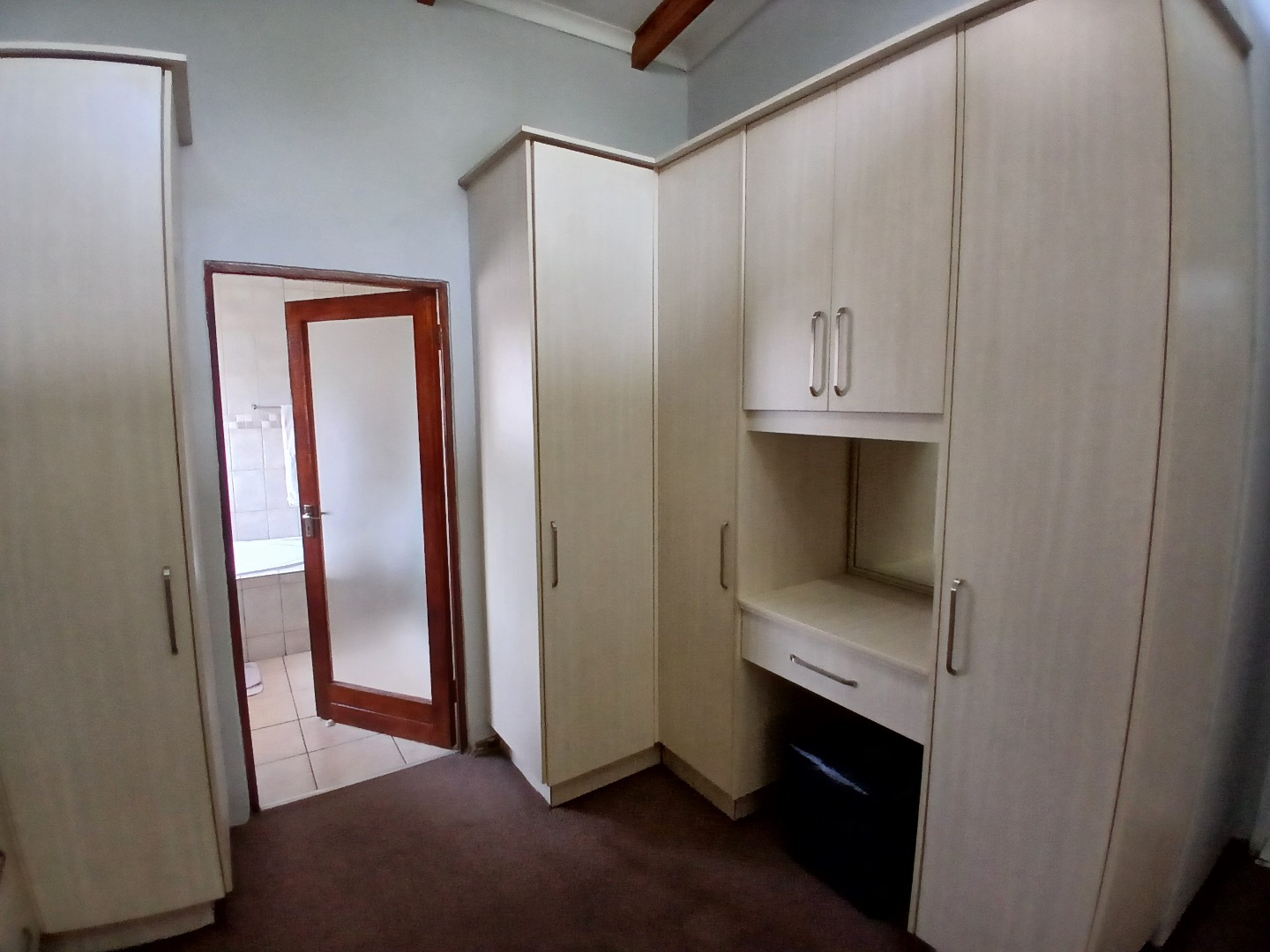 The main bedroom is generously sized with abundant built-in cupboards and a bright, full en-suite bathroom. Three additional bedrooms also feature built-in cupboards and are serviced by a modern bathroom fitted with a walk-in shower, basin, and toilet.
