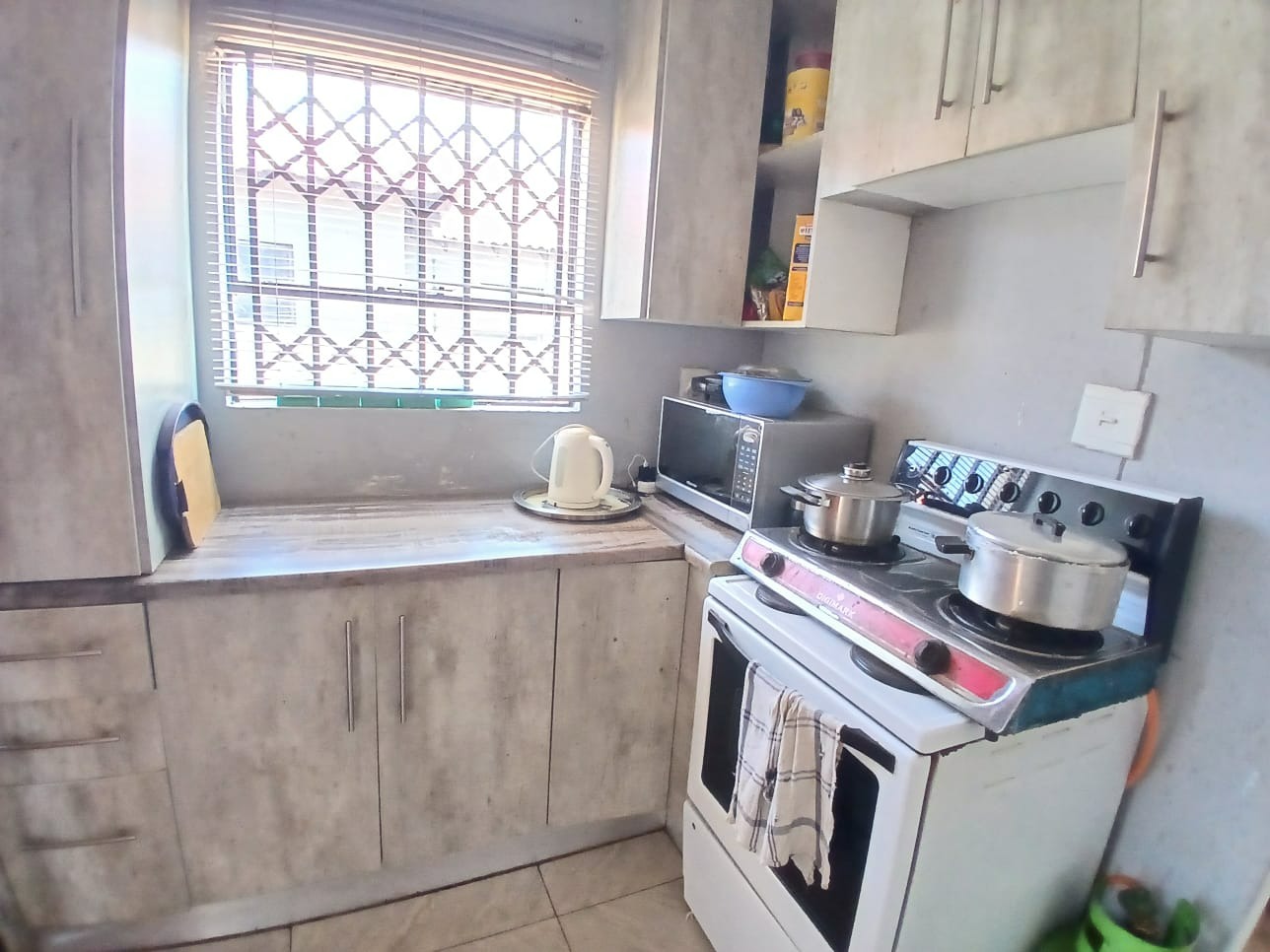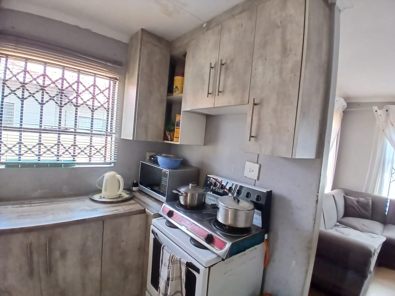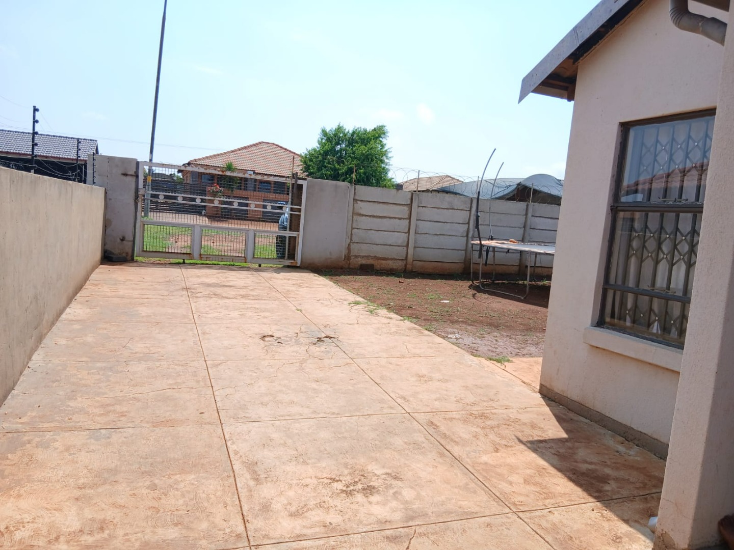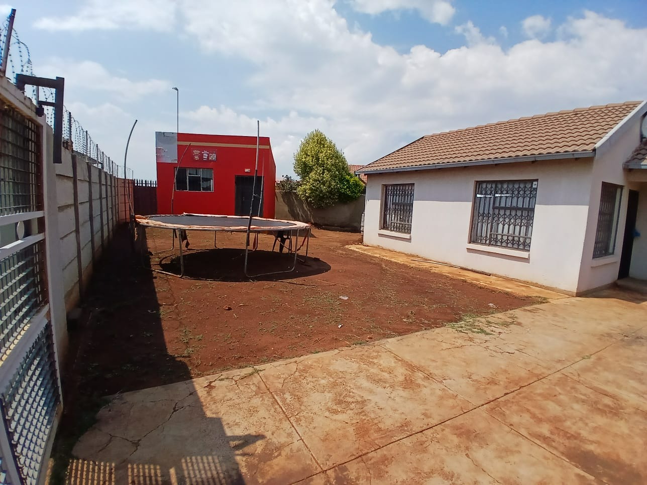 Discover this inviting two-bedroom home situated within a secure gated community in Dawn Park, Boksburg, South Africa. The property immediately presents a welcoming kerb appeal with a paved driveway and a secure gated entrance, leading to a generous 375 sqm erf that offers ample space for future landscaping and outdoor enjoyment. Security bars on all visible windows provide an enhanced sense of safety and peace of mind. Step inside to a bright and functional interior, featuring an open-plan lounge area that boasts modern wood-look laminate flooring and a distinctive brick-patterned accent wall, creating a warm and inviting atmosphere. Natural light floods the space through multiple windows, ensuring a cheerful living environment. The well-equipped kitchen provides practical counter and cabinet storage, ready for your personal touch and culinary endeavours. This residence offers two comfortable bedrooms, each designed as a private retreat and secured with window bars. A single, well-appointed bathroom serves these living spaces, ensuring convenience for residents and guests alike. Beyond the interiors, the expansive outdoor area presents a versatile canvas for gardening enthusiasts or those desiring space for recreation and expansion. A separate outbuilding, ideal for staff quarters, adds valuable functionality and flexibility to the property. Practical amenities include two dedicated parking spaces, complementing the secure access gate and robust perimeter fencing with barbed wire. Key Features: * 2 Bedrooms, 1 Bathroom * 1 Lounge, 1 Kitchen * 375 sqm Erf Size * Gated Community * 2 Parking Spaces * Staff Quarters * Paved Outdoor Areas * Security Bars on Windows * Perimeter Fencing * Open-Plan Living Area