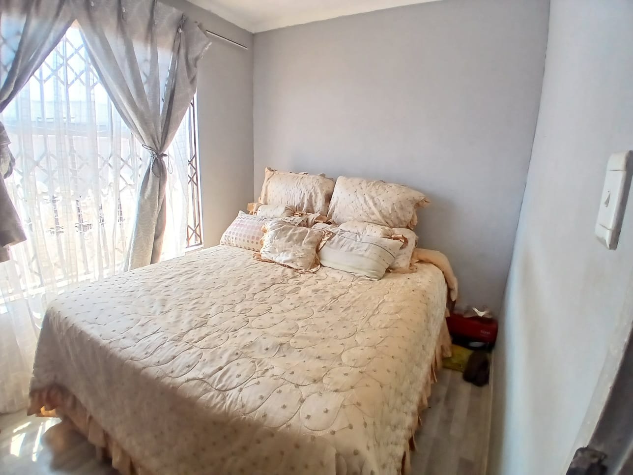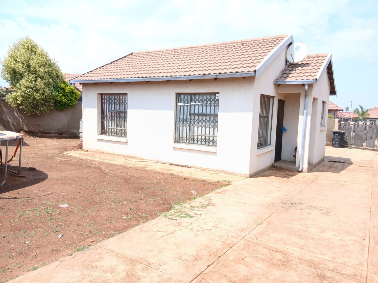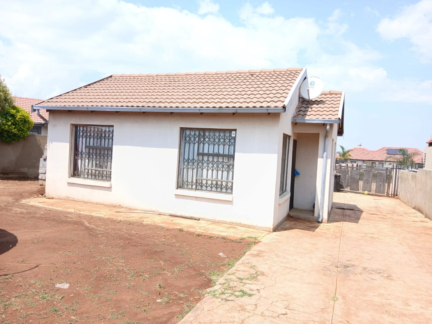 Discover this inviting two-bedroom home situated within a secure gated community in Dawn Park, Boksburg, South Africa. The property immediately presents a welcoming kerb appeal with a paved driveway and a secure gated entrance, leading to a generous 375 sqm erf that offers ample space for future landscaping and outdoor enjoyment. Security bars on all visible windows provide an enhanced sense of safety and peace of mind. Step inside to a bright and functional interior, featuring an open-plan lounge area that boasts modern wood-look laminate flooring and a distinctive brick-patterned accent wall, creating a warm and inviting atmosphere. Natural light floods the space through multiple windows, ensuring a cheerful living environment. The well-equipped kitchen provides practical counter and cabinet storage, ready for your personal touch and culinary endeavours. This residence offers two comfortable bedrooms, each designed as a private retreat and secured with window bars. A single, well-appointed bathroom serves these living spaces, ensuring convenience for residents and guests alike. Beyond the interiors, the expansive outdoor area presents a versatile canvas for gardening enthusiasts or those desiring space for recreation and expansion. A separate outbuilding, ideal for staff quarters, adds valuable functionality and flexibility to the property. Practical amenities include two dedicated parking spaces, complementing the secure access gate and robust perimeter fencing with barbed wire. Key Features: * 2 Bedrooms, 1 Bathroom * 1 Lounge, 1 Kitchen * 375 sqm Erf Size * Gated Community * 2 Parking Spaces * Staff Quarters * Paved Outdoor Areas * Security Bars on Windows * Perimeter Fencing * Open-Plan Living Area