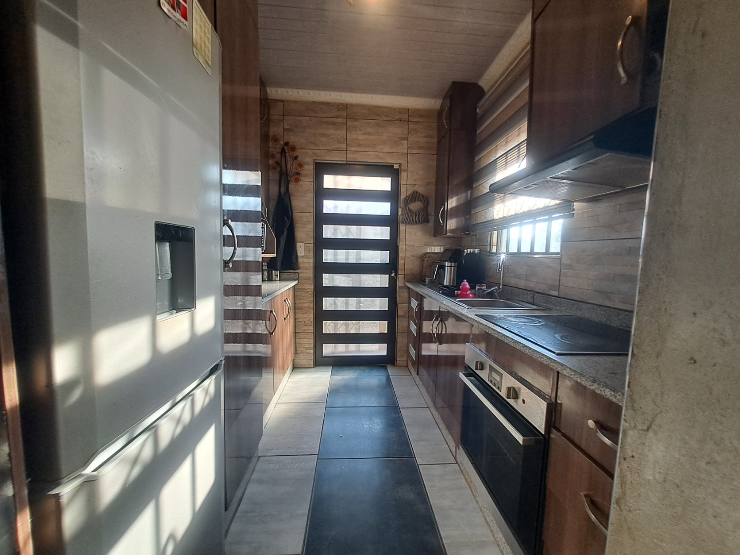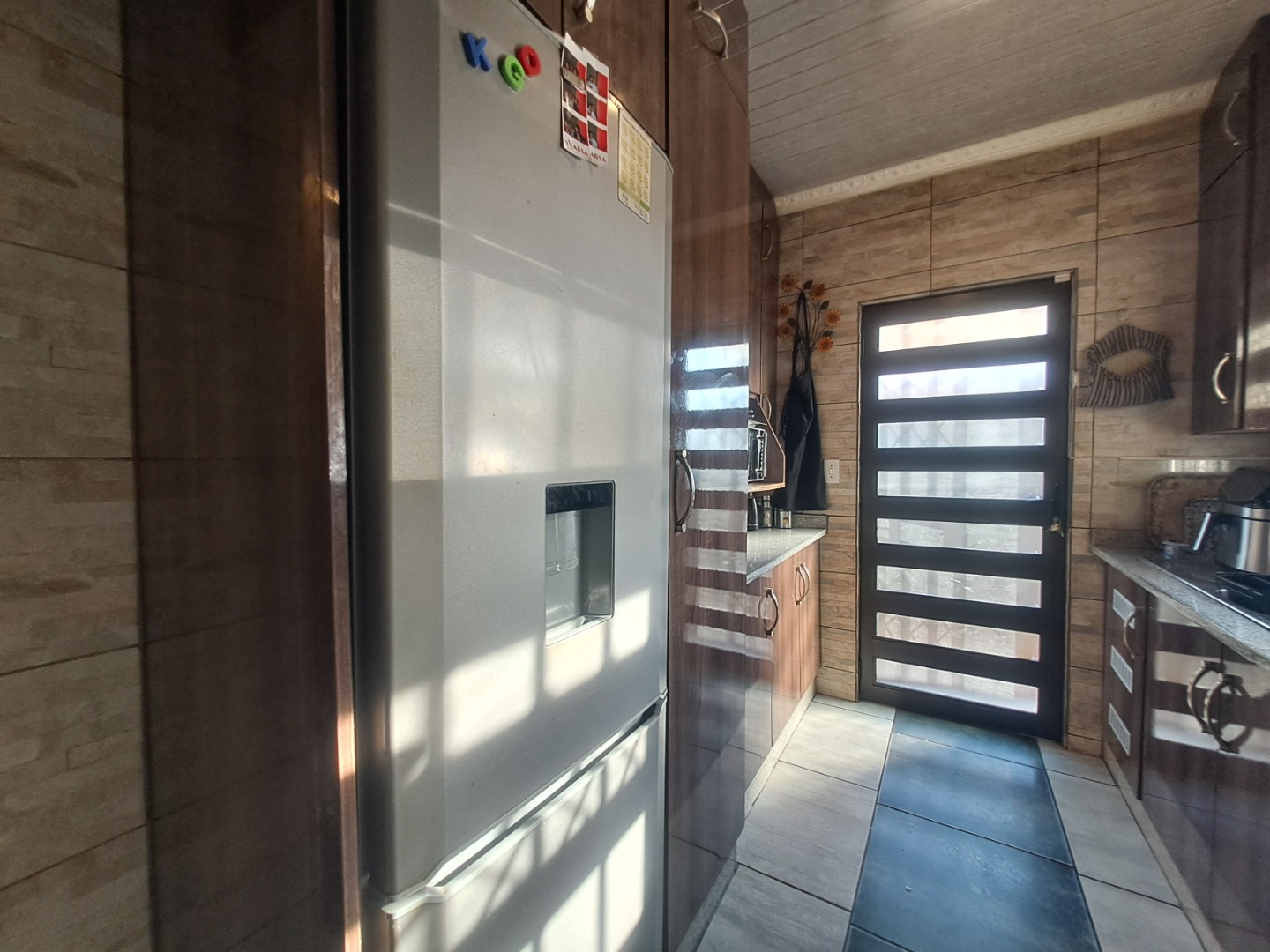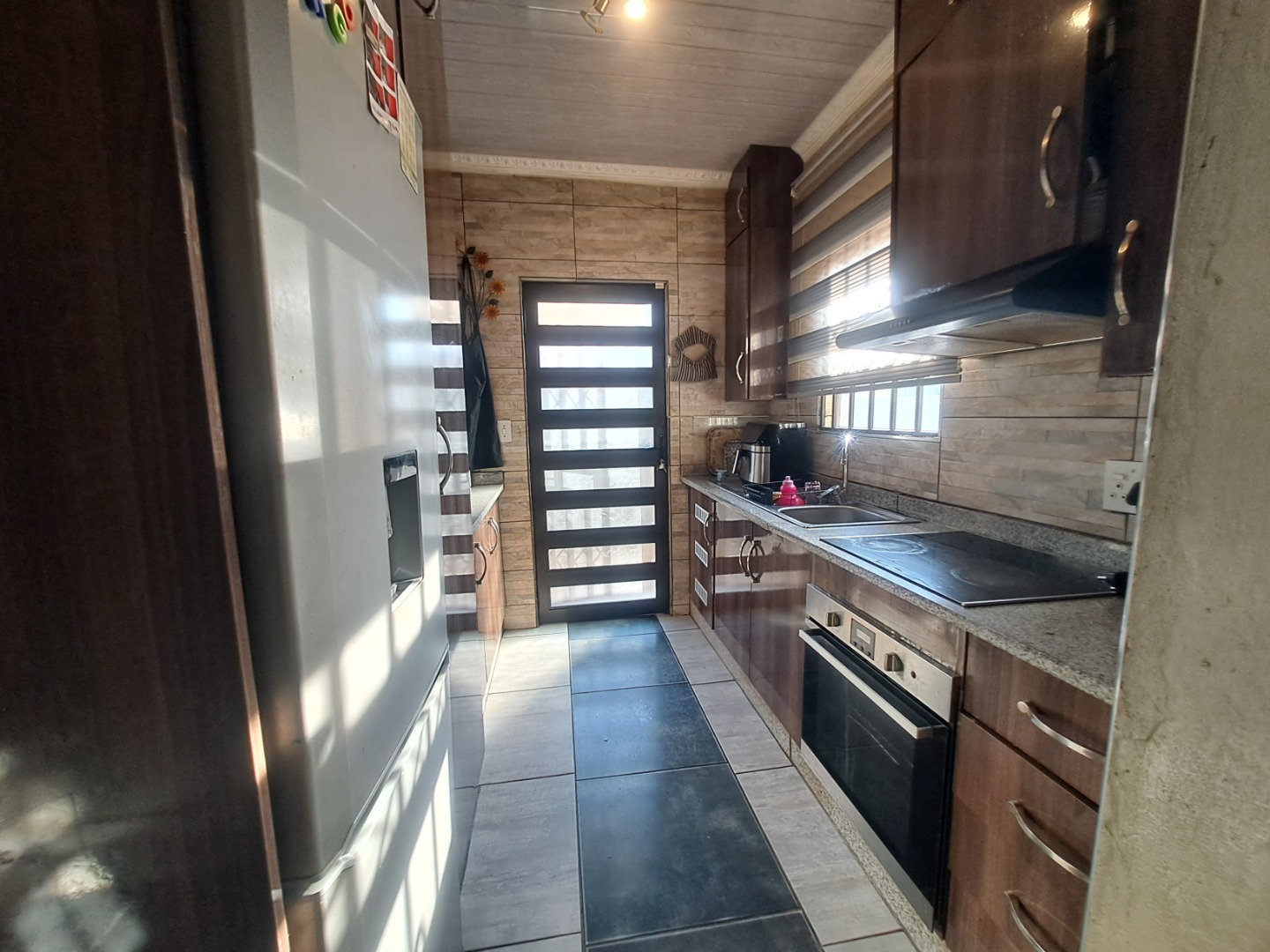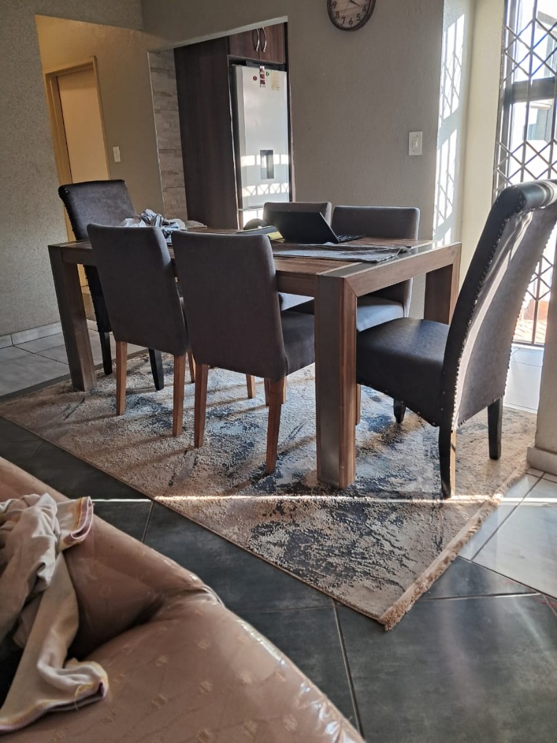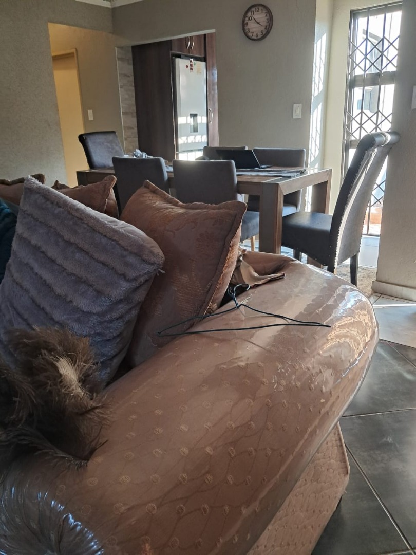 Outside, the home is paved is all-round with a bit of grass at the back of the house. From the lounge you can acces the double garage with an automated door. The home, windows are all aluminum even the kitchen door, also it has an aluminum awning. There's also extra parking space in the yard. This home safety features include burglar bars on the windows and a high barrier wall for security and safety.