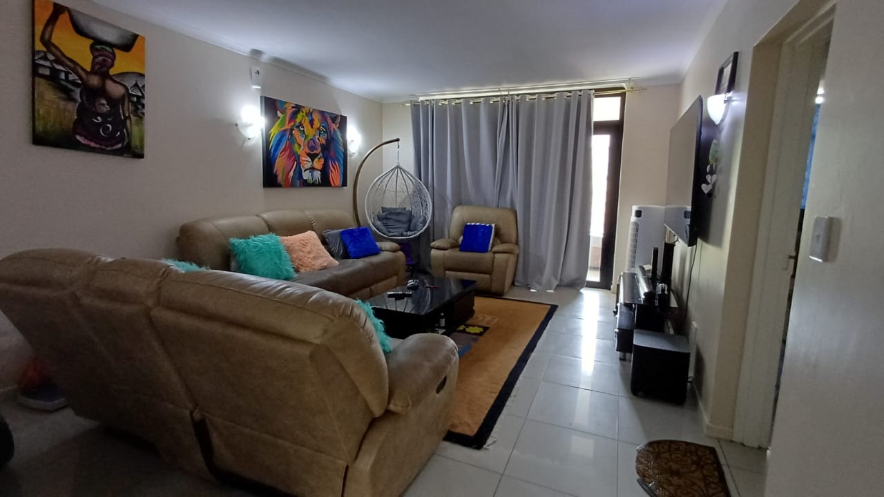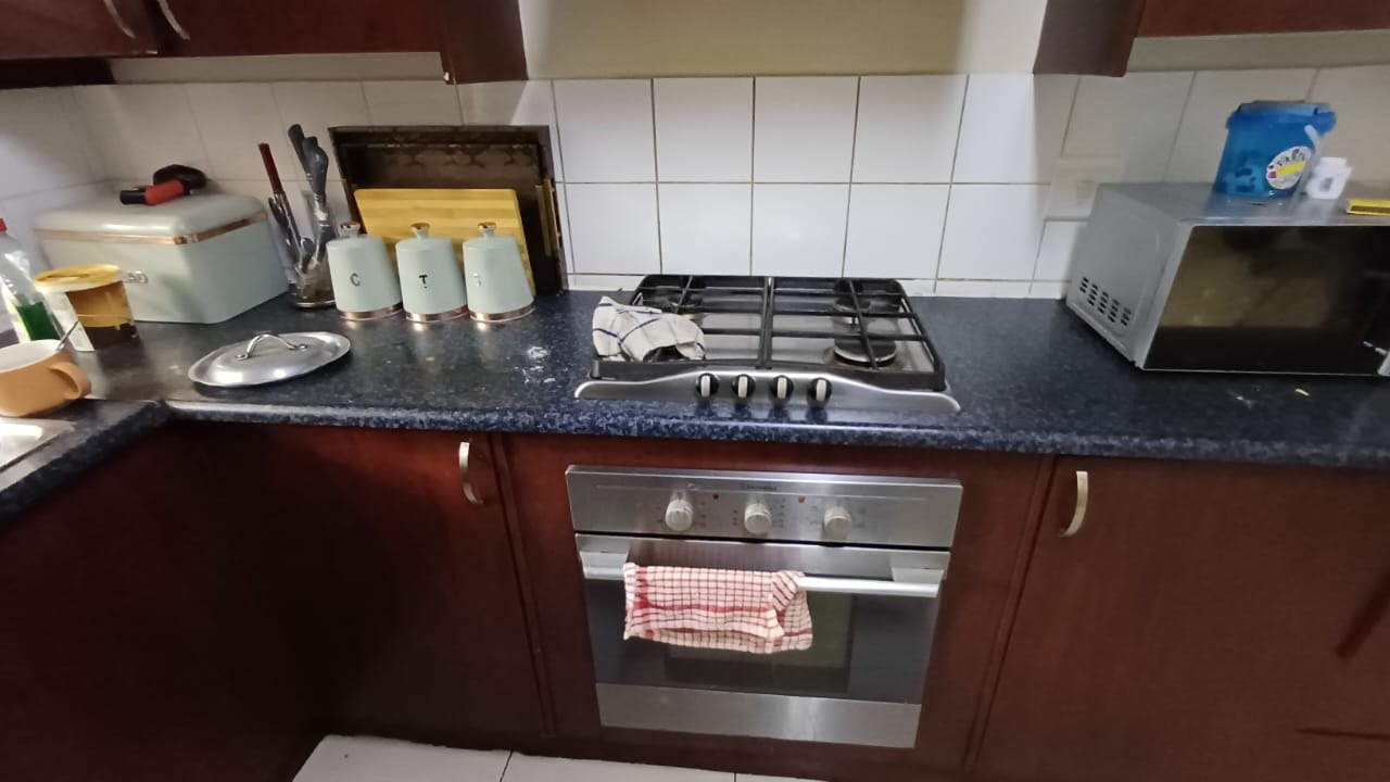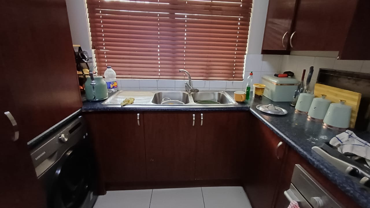 The kitchen is equipped with dark wood-toned cabinetry, dark countertops, an integrated gas hob, and an oven, complemented by a double stainless steel sink and practical tiled flooring. Ample storage solutions are available throughout the apartment, ensuring a clutter-free environment. The two comfortable bedrooms share a well-maintained bathroom, offering privacy and convenience for residents.