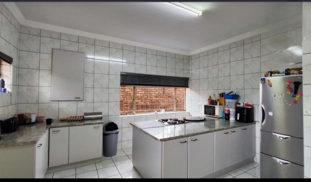 Inside, the residence presents a functional layout designed for family life. It includes two comfortable lounges and a dedicated dining room, offering versatile spaces for relaxation and formal meals. The kitchen is a highlight, featuring an open-plan design with a practical island that includes an integrated stovetop, ample cabinet space, and tiled walls for easy maintenance. This area flows seamlessly into a living space, promoting an inclusive atmosphere.