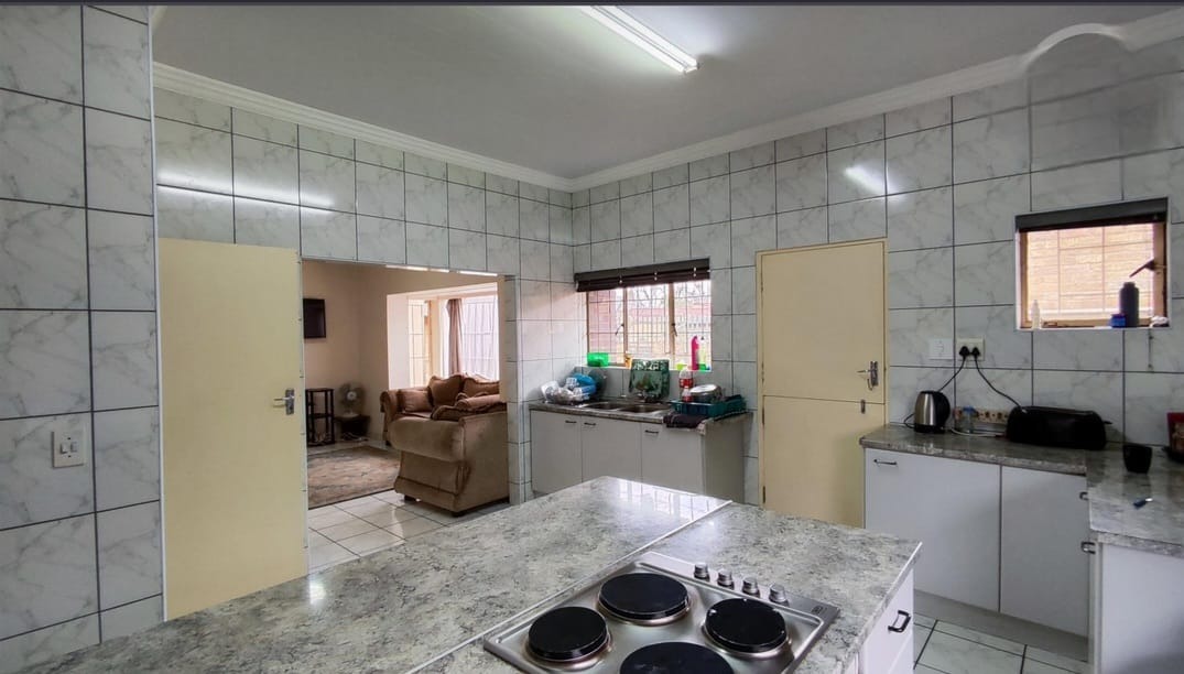 Inside, the residence presents a functional layout designed for family life. It includes two comfortable lounges and a dedicated dining room, offering versatile spaces for relaxation and formal meals. The kitchen is a highlight, featuring an open-plan design with a practical island that includes an integrated stovetop, ample cabinet space, and tiled walls for easy maintenance. This area flows seamlessly into a living space, promoting an inclusive atmosphere.