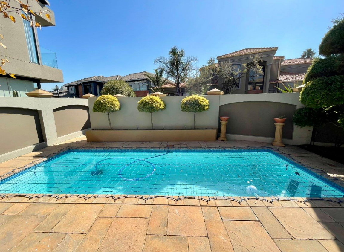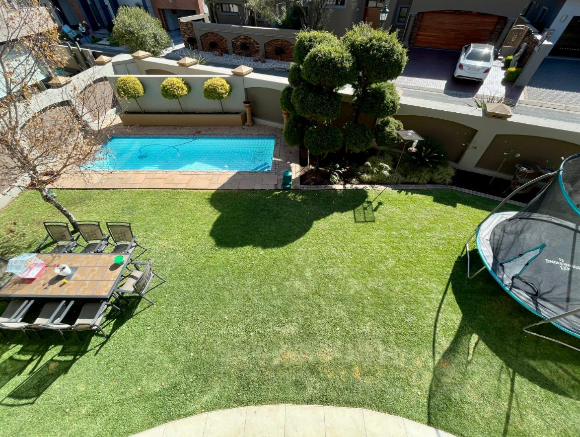 Discover this modern family residence nestled within a secure estate in Sunward Park, Boksburg, South Africa. This striking two-story home immediately impresses with its contemporary design, featuring elegant stone accents and prominent columns, complemented by a paved driveway leading to a double wooden garage door, enhancing its kerb appeal. Step inside to a grand, inviting entryway boasting high ceilings and a graceful curved staircase with ornate wrought iron railings, bathed in natural light. The home offers two spacious lounges and a dedicated dining room, all featuring durable tiled flooring, crown molding, and recessed lighting, creating an atmosphere of refined comfort. An open-plan layout seamlessly connects living areas, ideal for both daily life and entertaining. The heart of the home is a spacious kitchen, equipped with extensive dark wood cabinetry, a built-in oven and microwave, a gas stovetop, and a convenient pantry. Modern pendant lighting illuminates the space, which also includes a dedicated display cabinet. The dining room, large enough to accommodate a substantial table, features a modern chandelier and glass sliding doors that open to the outdoor area. Accommodation comprises four well-appointed bedrooms and three bathrooms, including two luxurious en-suites, providing ample space and privacy for the entire family. Outdoors, the property boasts a private swimming pool, a well-maintained garden, and a covered patio perfect for alfresco dining and relaxation. A small balcony on the upper level offers an additional outdoor retreat. Security is paramount within this estate, offering 24-hour security, an alarm system, access gates, and security gates for peace of mind. The property also benefits from fibre connectivity, ensuring high-speed internet access, and is pet-friendly. With two garages and three additional parking spaces, convenience is assured for residents and guests alike. Key Features: * 4 Bedrooms, 3 Bathrooms (2 En-suite) * 2 Lounges, 1 Dining Room * Spacious Kitchen with Pantry * Double Garage & 3 Additional Parkings * Private Swimming Pool & Garden * Covered Patio for Entertaining * Secure Estate Living with 24-Hour Security * Fibre Connectivity