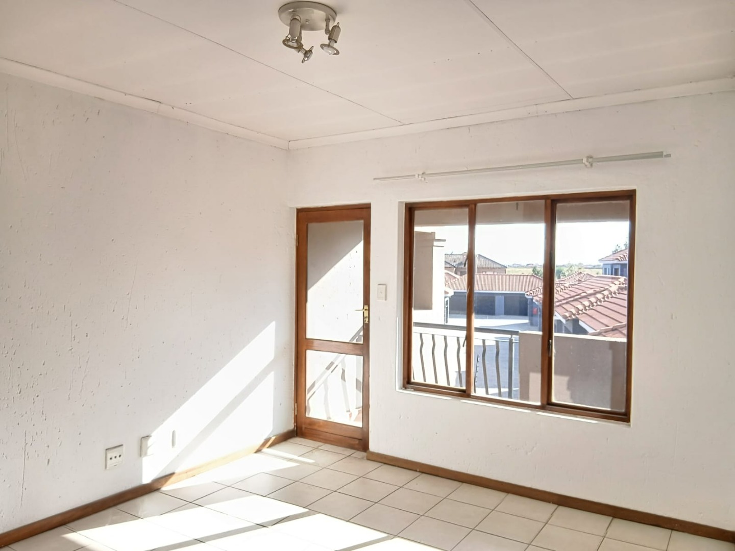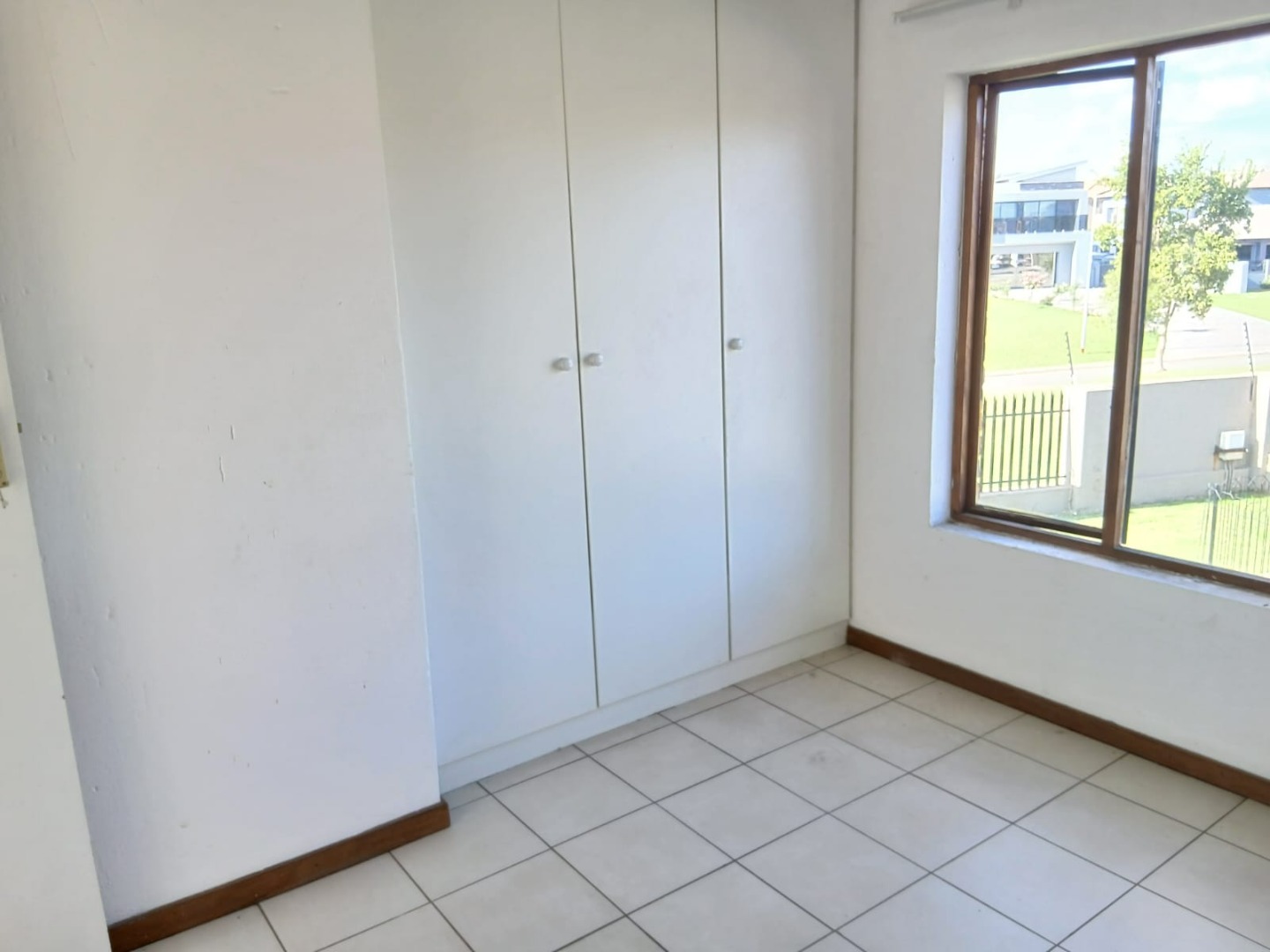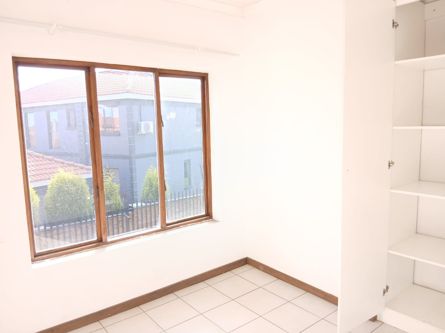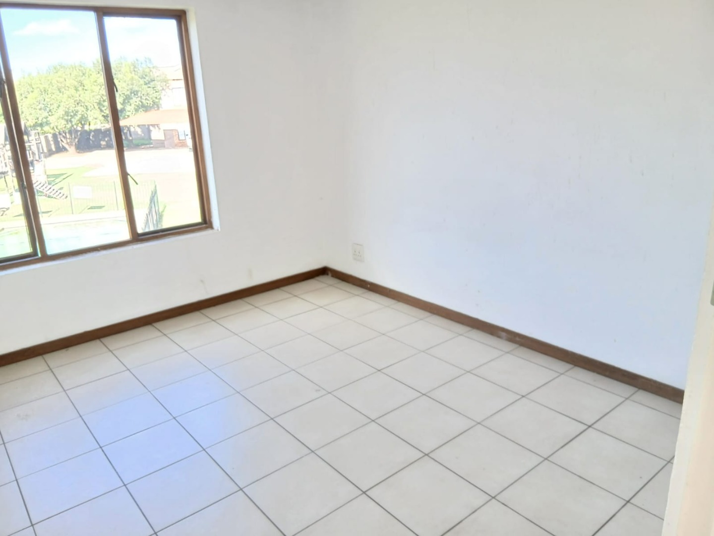 The open-plan lounge, featuring practical tiled flooring and abundant natural light, flows seamlessly into the functional kitchen. Here, you'll find wooden build in cabinetry with space for storage and providing a practical culinary environment.