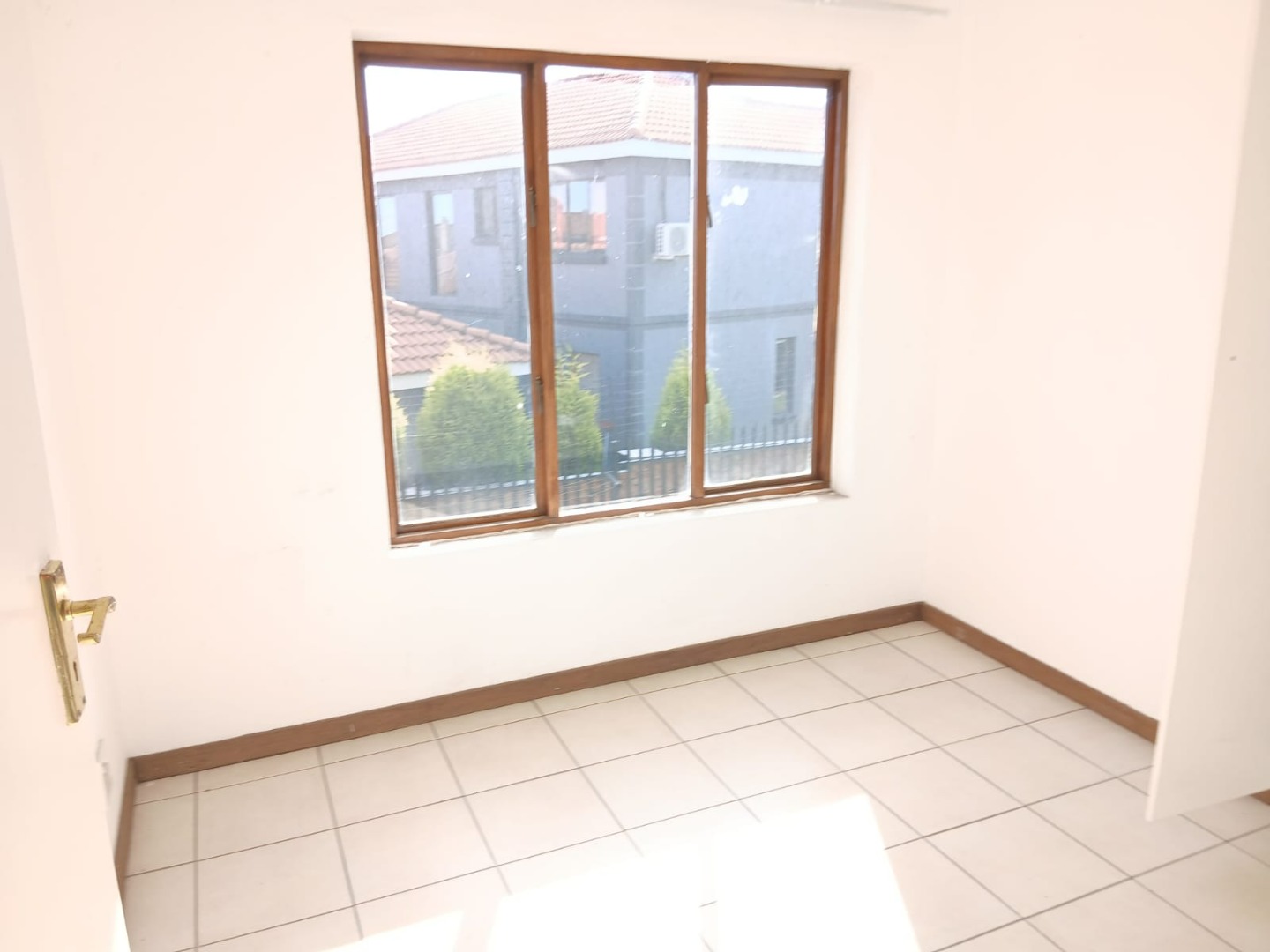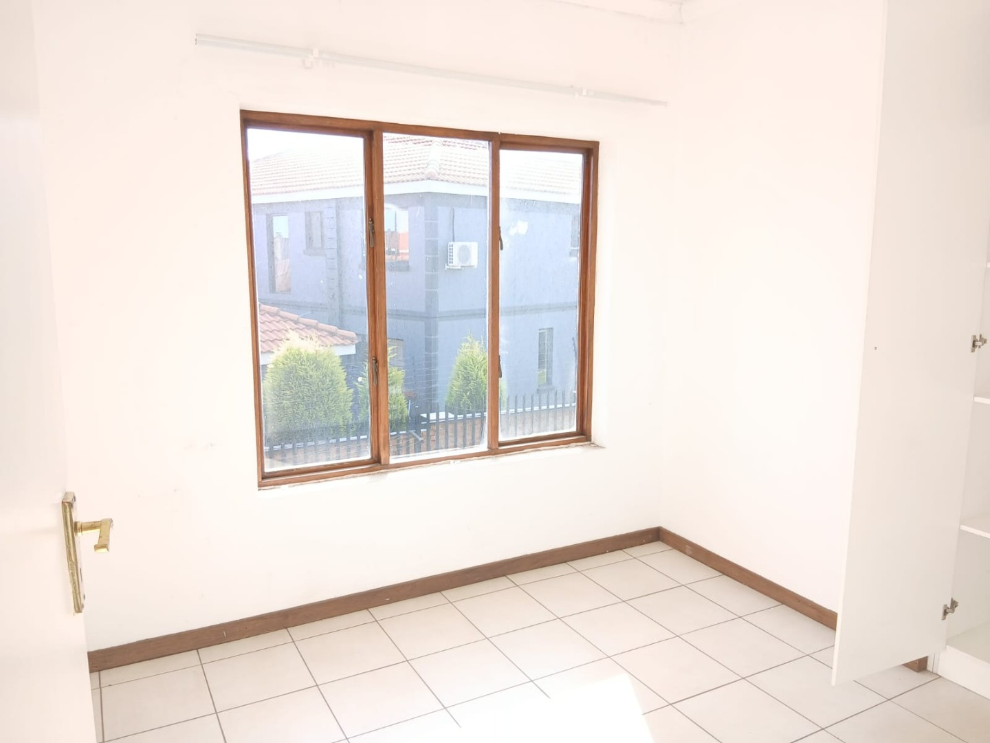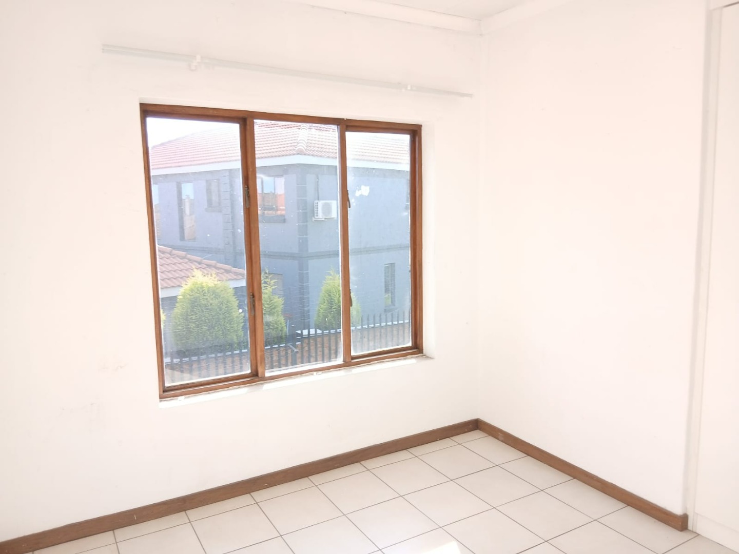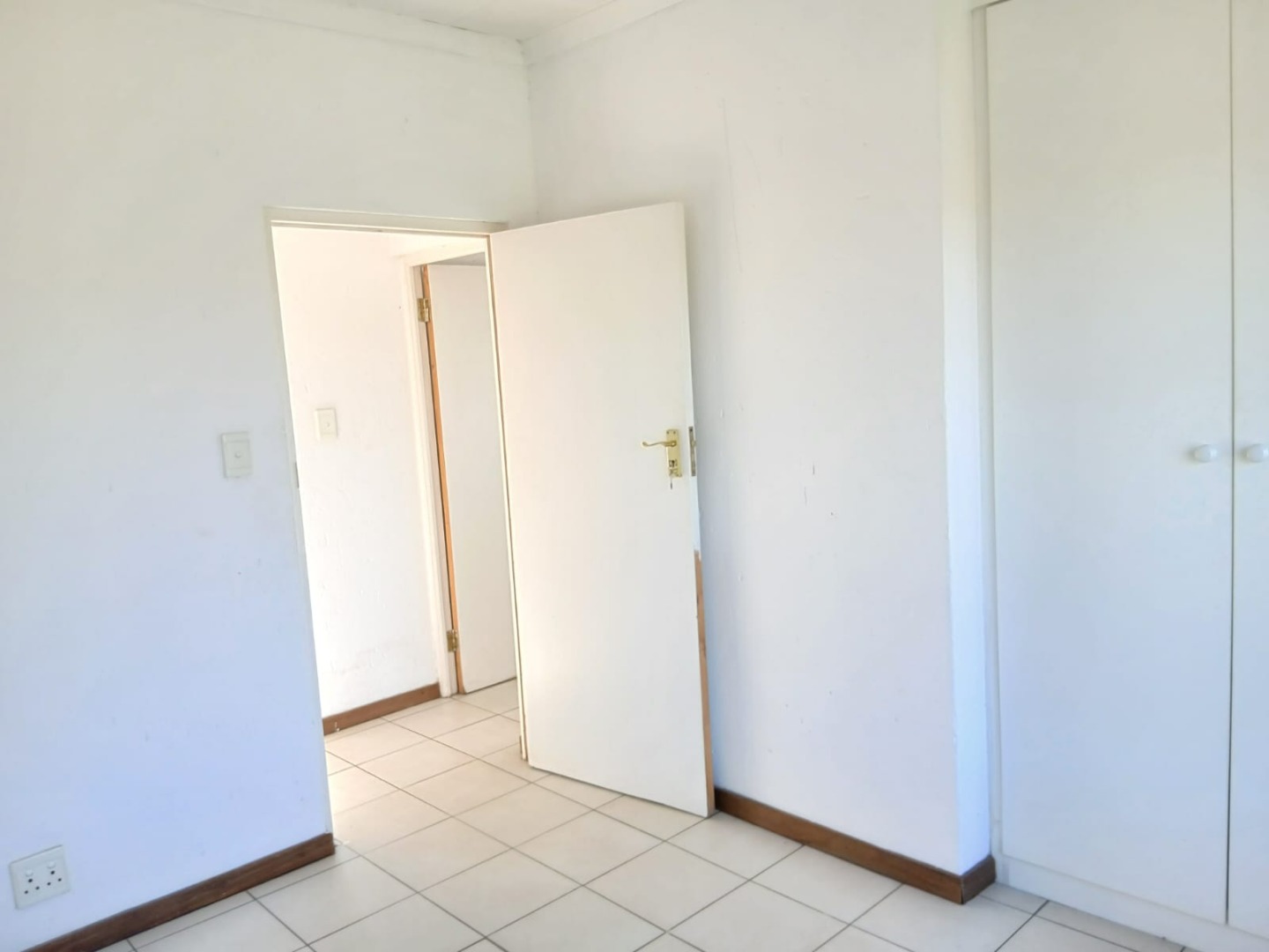 The open-plan lounge, featuring practical tiled flooring and abundant natural light, flows seamlessly into the functional kitchen. Here, you'll find wooden build in cabinetry with space for storage and providing a practical culinary environment.
