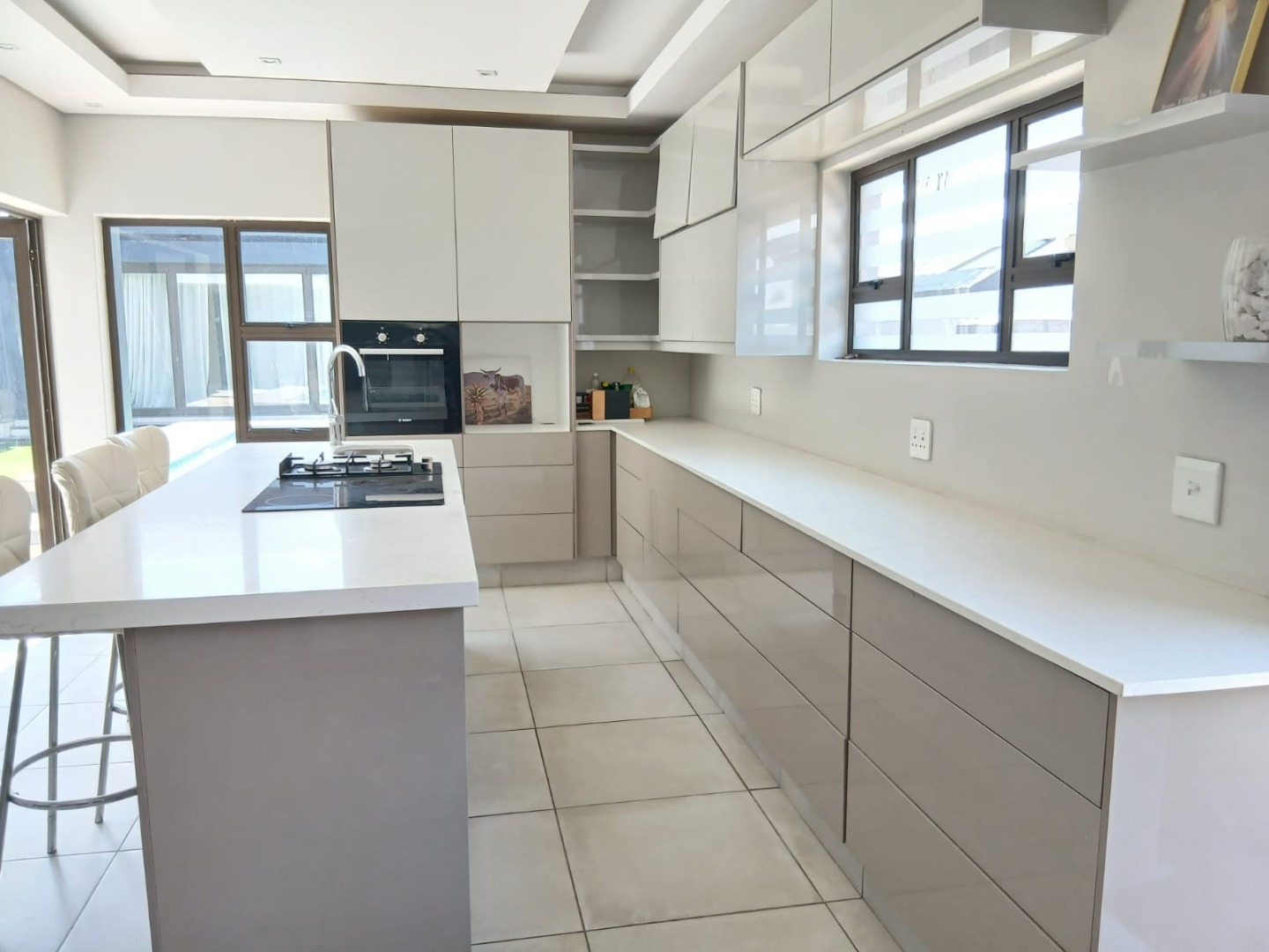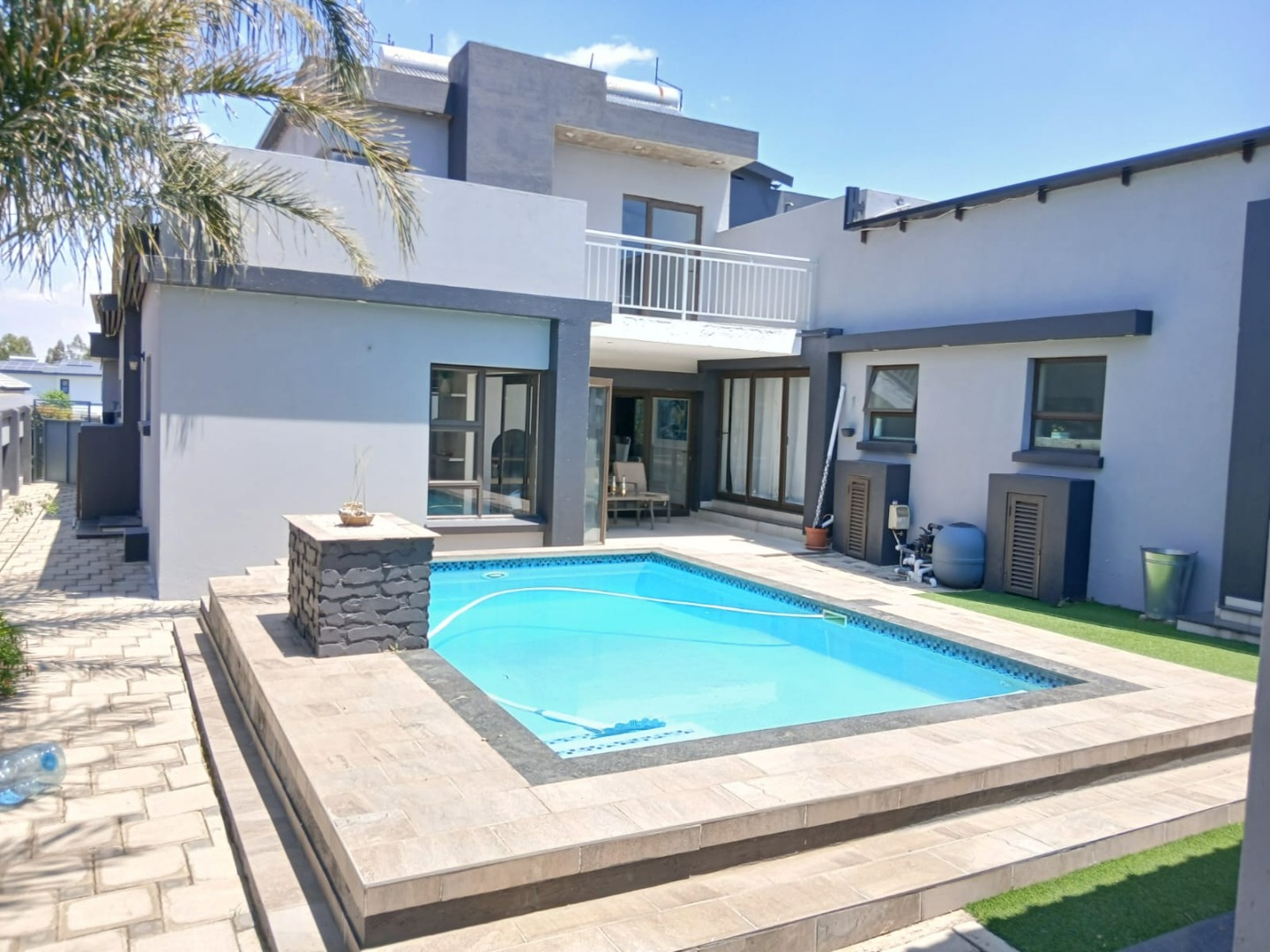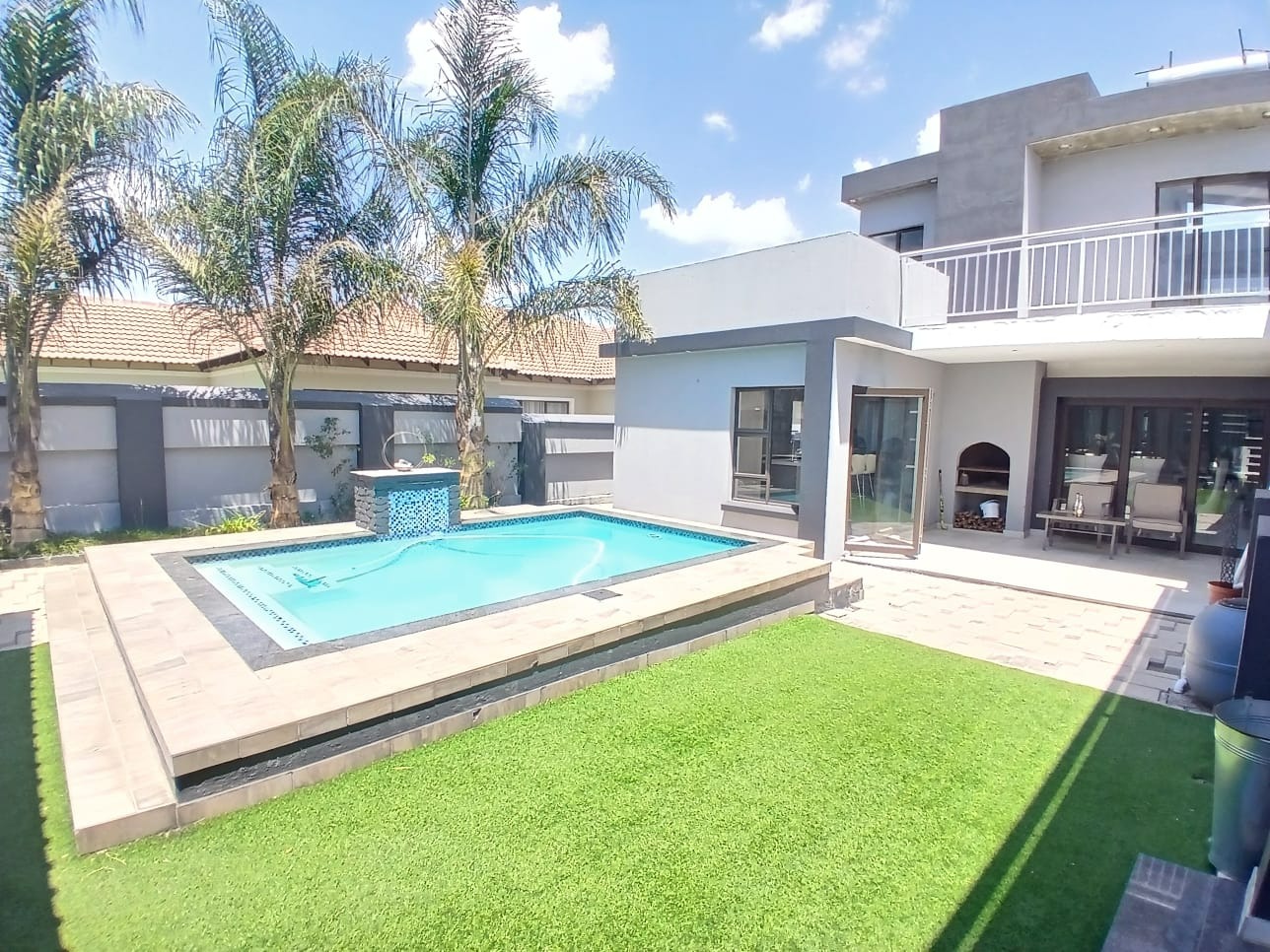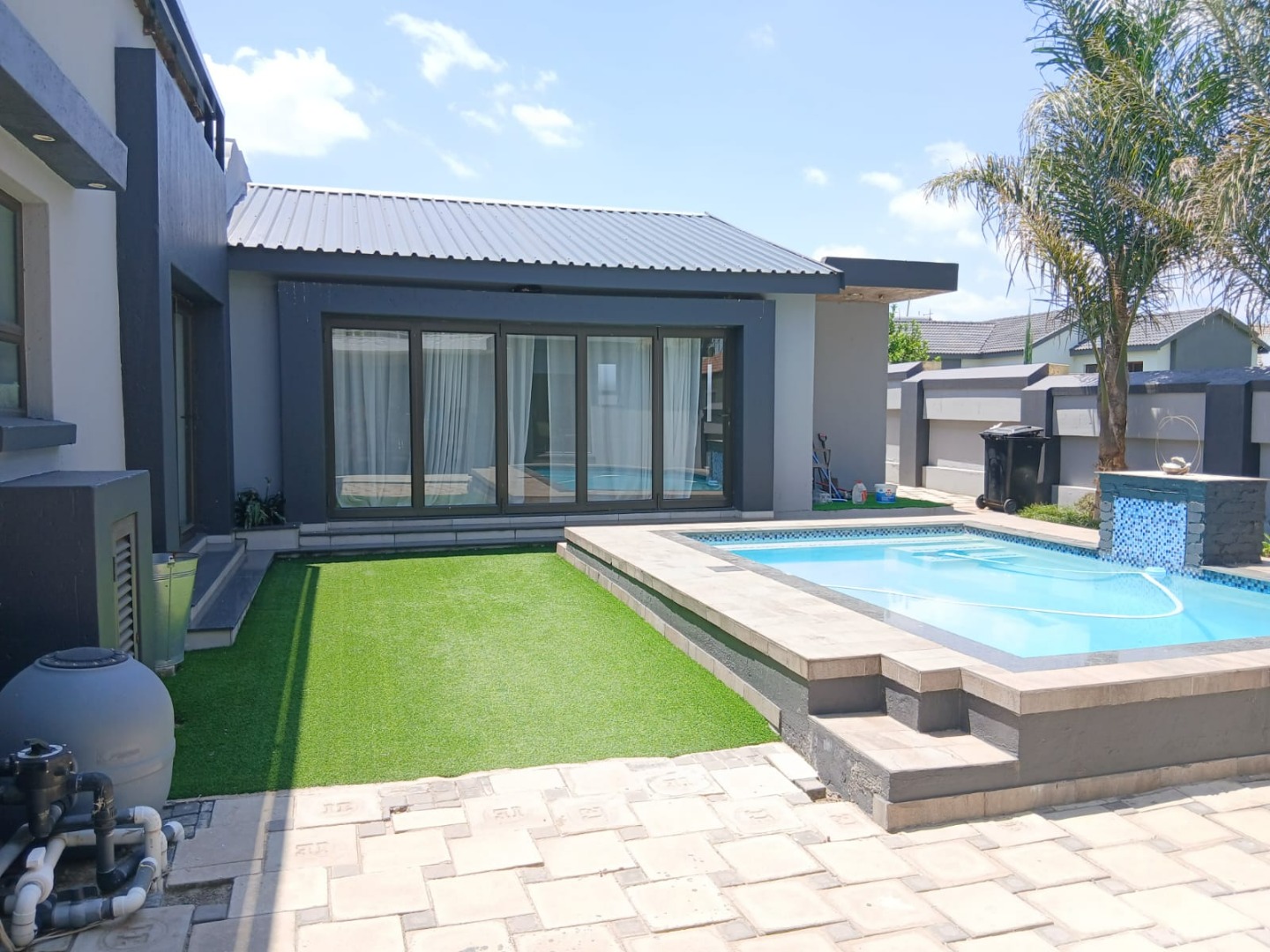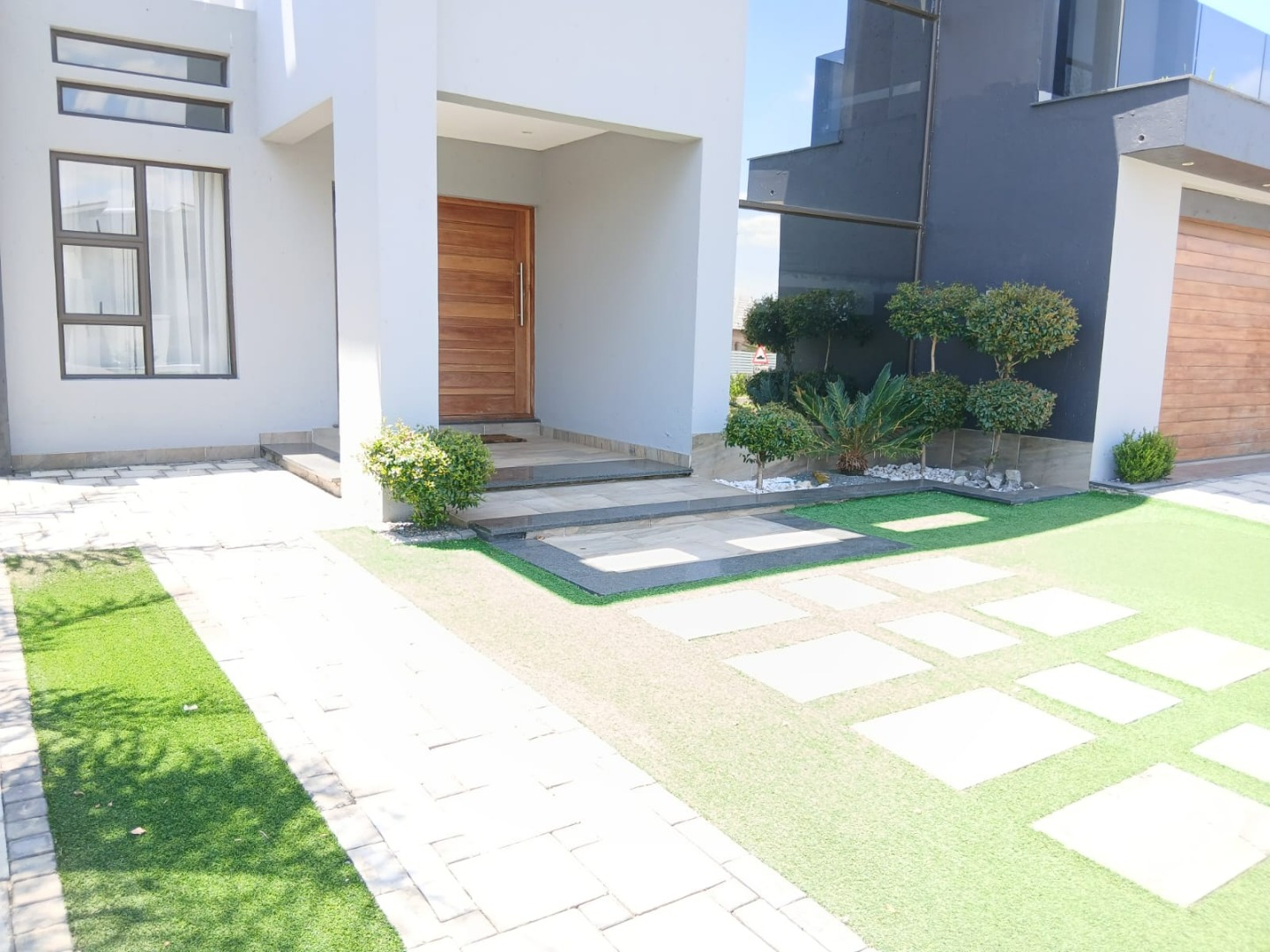 Discover an exquisite modern sanctuary nestled within the prestigious Helderwyk security estate in Brakpan, South Africa. This architectural masterpiece, spanning an impressive 400 sqm on a 713 sqm erf, immediately captivates with its striking contemporary facade. Clean lines, expansive glass elements, and warm natural wood accents on the grand entrance and garage doors create an inviting yet sophisticated curb appeal. The meticulously landscaped front, featuring artificial turf and elegant stepping stones, sets a tone of refined, low-maintenance luxury.
