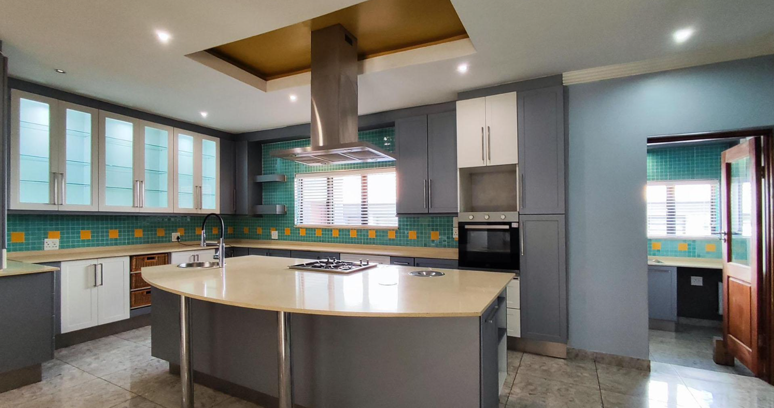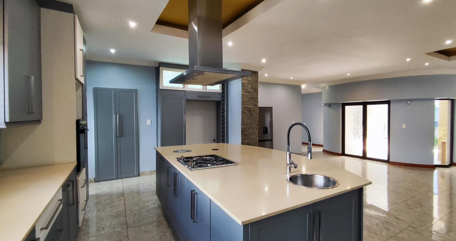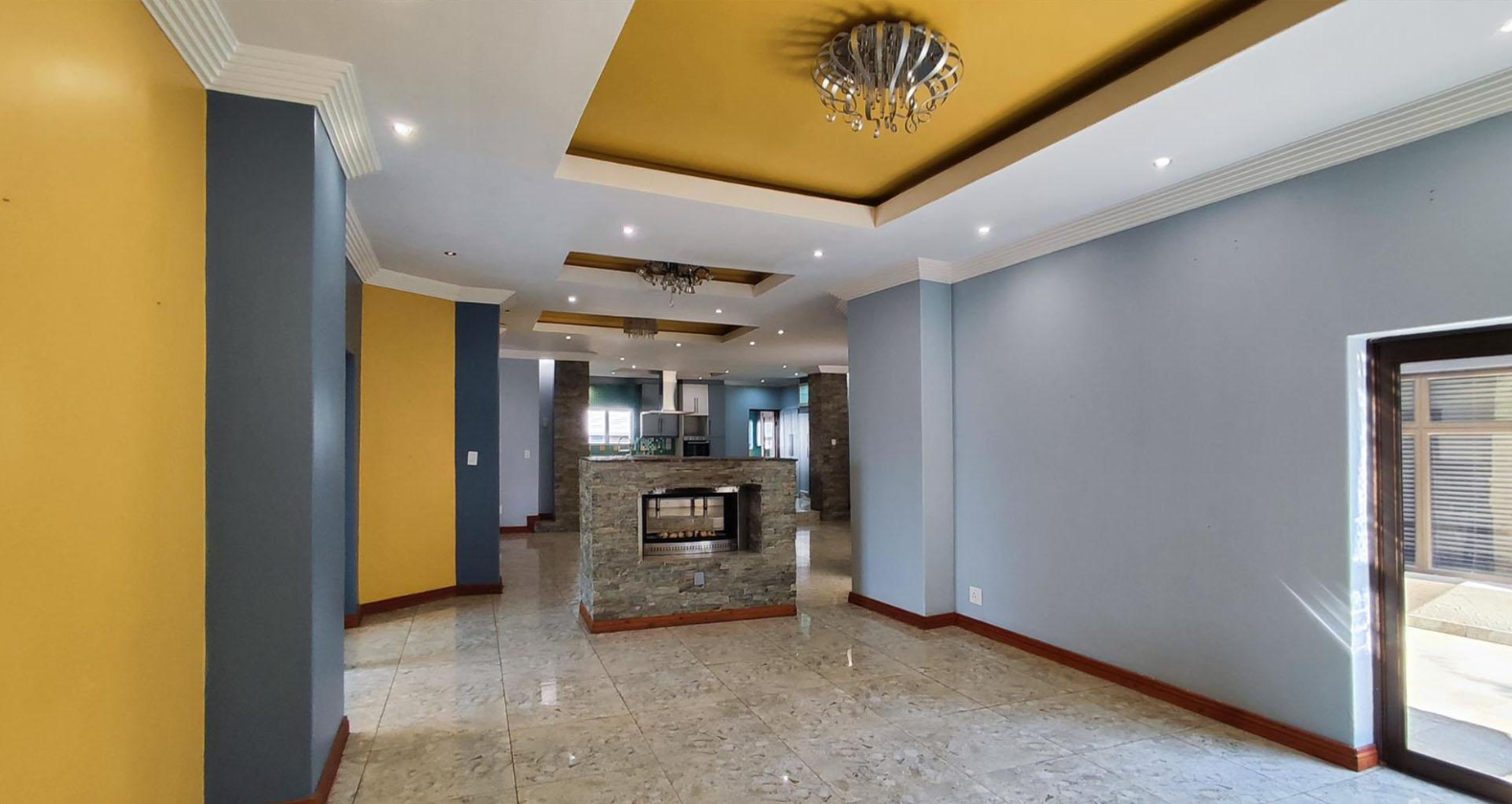 Step inside to an inviting open-plan layout, where modern tiled flooring flows seamlessly throughout the main living areas. The interior is characterized by light blue walls, impressive tray ceilings with recessed lighting, and decorative chandeliers, creating an atmosphere of sophistication. A stylish, stone-clad built-in fireplace serves as a focal point, while large glass sliding doors invite natural light and offer access to the garden. The contemporary kitchen is a chef's delight, featuring a large central island with an integrated hob and sink, an overhead extractor fan, and ample two-tone grey and cream cabinetry. A separate scullery/utility area provides additional convenience, and unique curved architectural features add character to the adjoining living space.