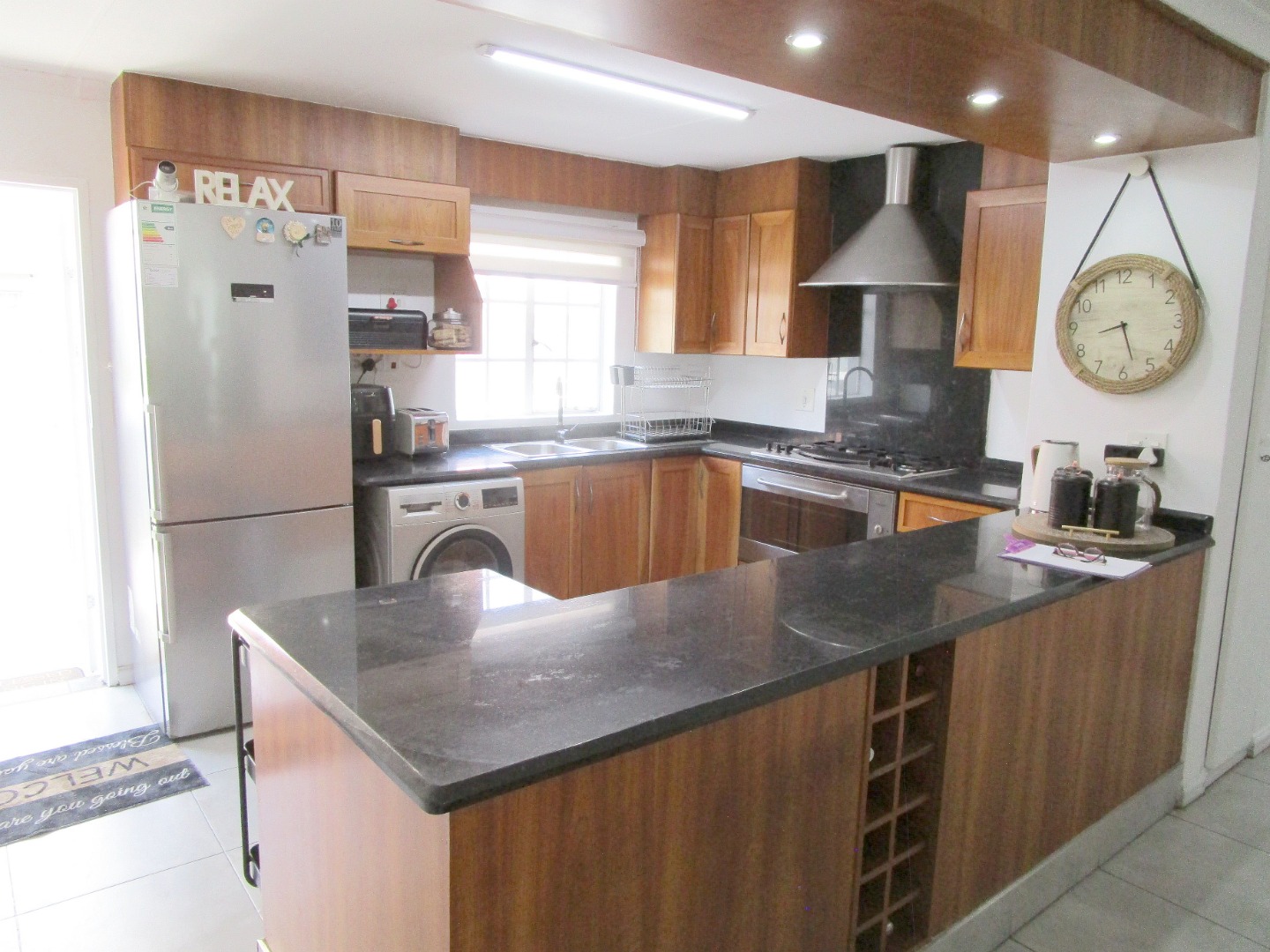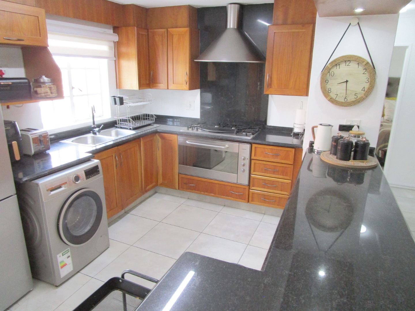 Step inside to an open-plan living and dining area, bathed in natural light from large windows and featuring practical tiled flooring. This versatile space provides ample room for relaxation and entertaining, with white walls offering a neutral canvas for personal touches. The modern kitchen is a highlight, boasting dark granite countertops, traditional wooden cabinetry, and stainless steel appliances including an oven, hob, and range hood. An integrated washing machine and a breakfast bar with a wine rack add to its functionality.