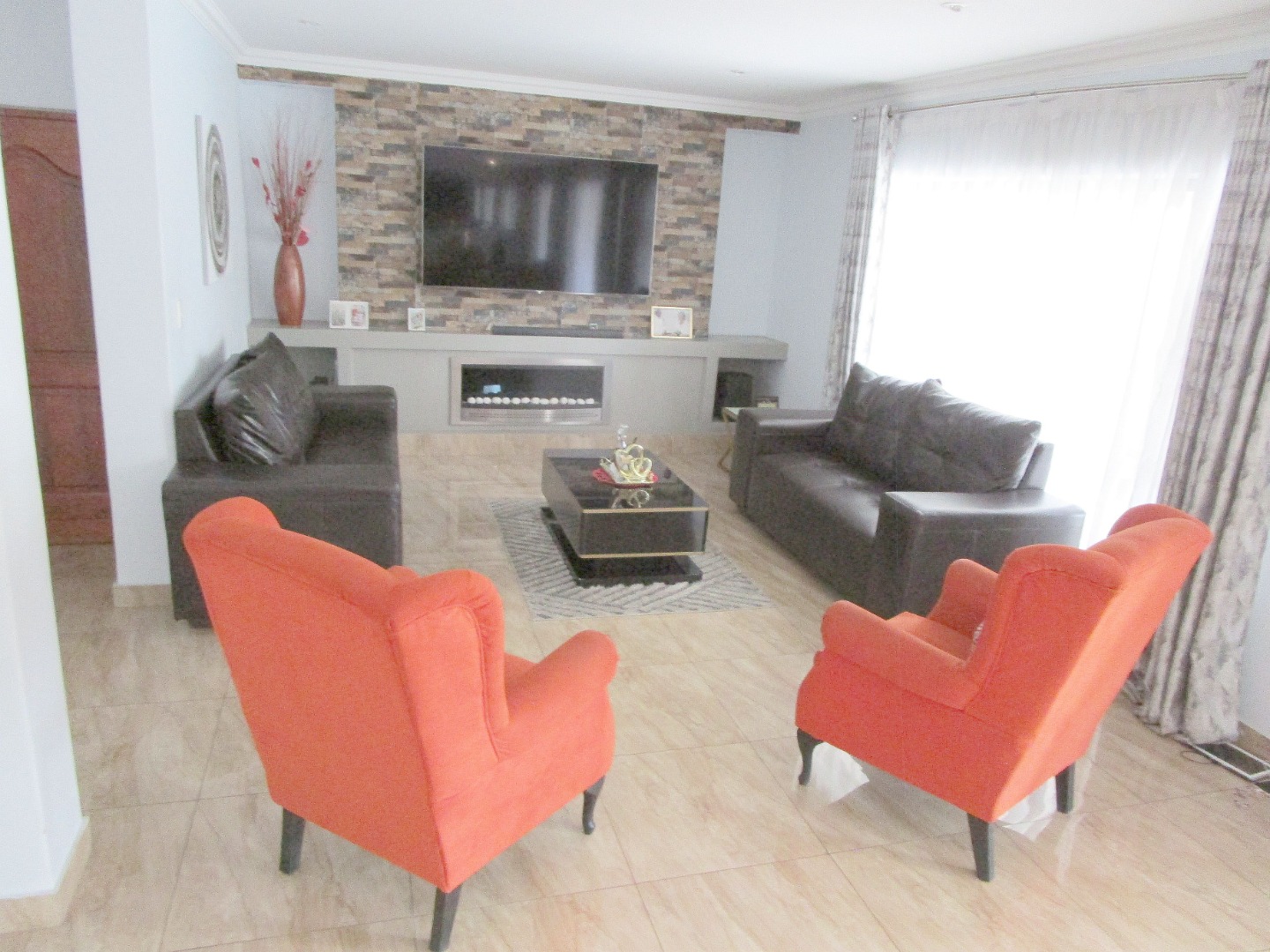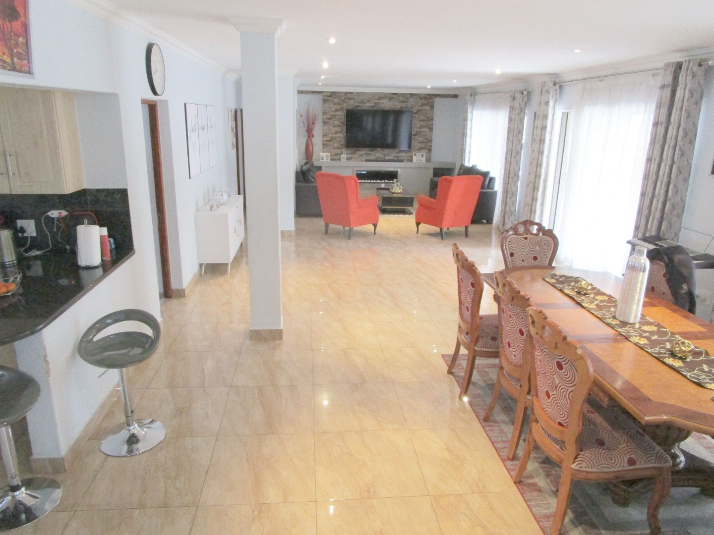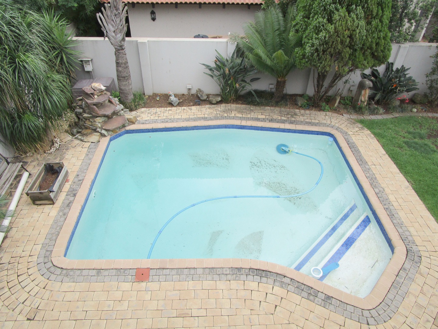An outdoor sanctuary awaits, featuring a sprawling covered veranda, an idyllic setting for sophisticated al fresco dining and grand entertaining. This expansive space seamlessly transitions to a paved patio and lush, irrigated gardens, family size swimming pool with overflowing water-feature over the pool which offers a heated solar panels creating a serene backdrop for relaxation. A built-in braai invites memorable gatherings under the African sky. Practical considerations are met with two secure garages and an impressive six additional parking spaces, ensuring effortless accommodation for residents and guests alike.