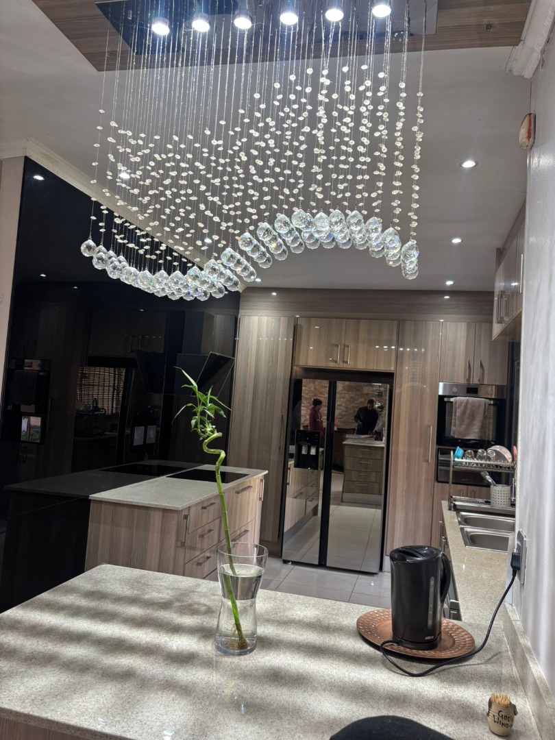 The sleek kitchen is a culinary delight, boasting stylish wooden cabinetry, integrated built-in appliances including an induction cooktop, and a central island/breakfast bar. Contemporary lighting, including elegant chandeliers and recessed lights, illuminates the space, flowing seamlessly into a dining area with a distinctive stacked stone wall and tiled flooring. A comfortable lounge and a dedicated family TV room complete the versatile living space.