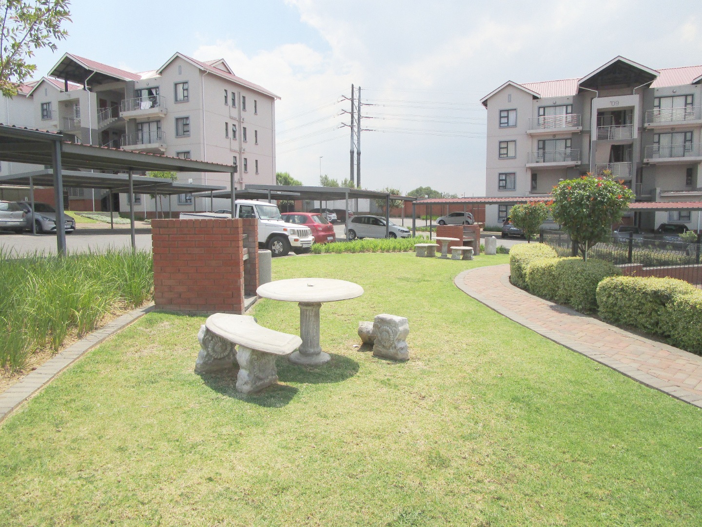 Step outside to a private patio, perfect for relaxation, overlooking a well-maintained garden. The property also benefits from two dedicated parking spaces and paved areas. Residents can enjoy access to a communal braai area and a club house, fostering a vibrant community atmosphere.