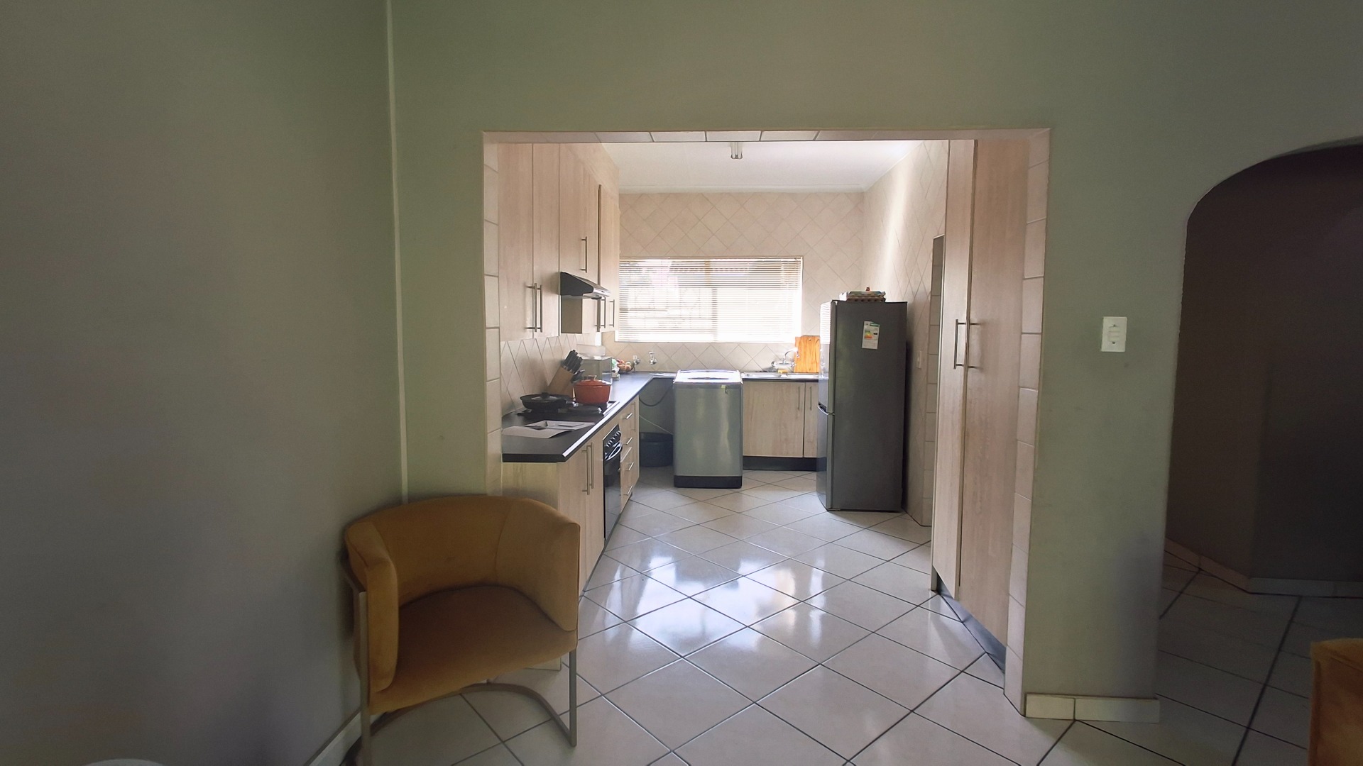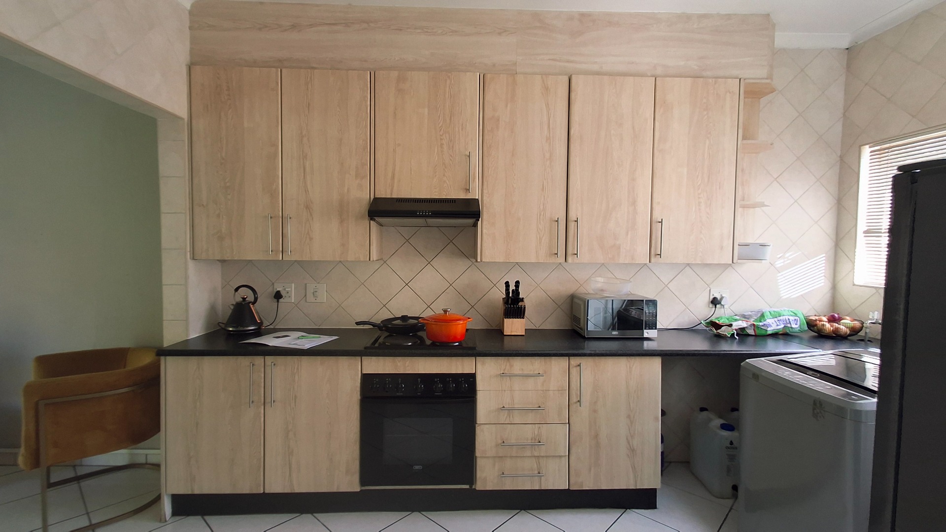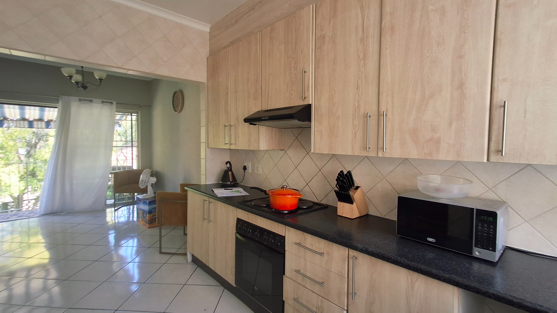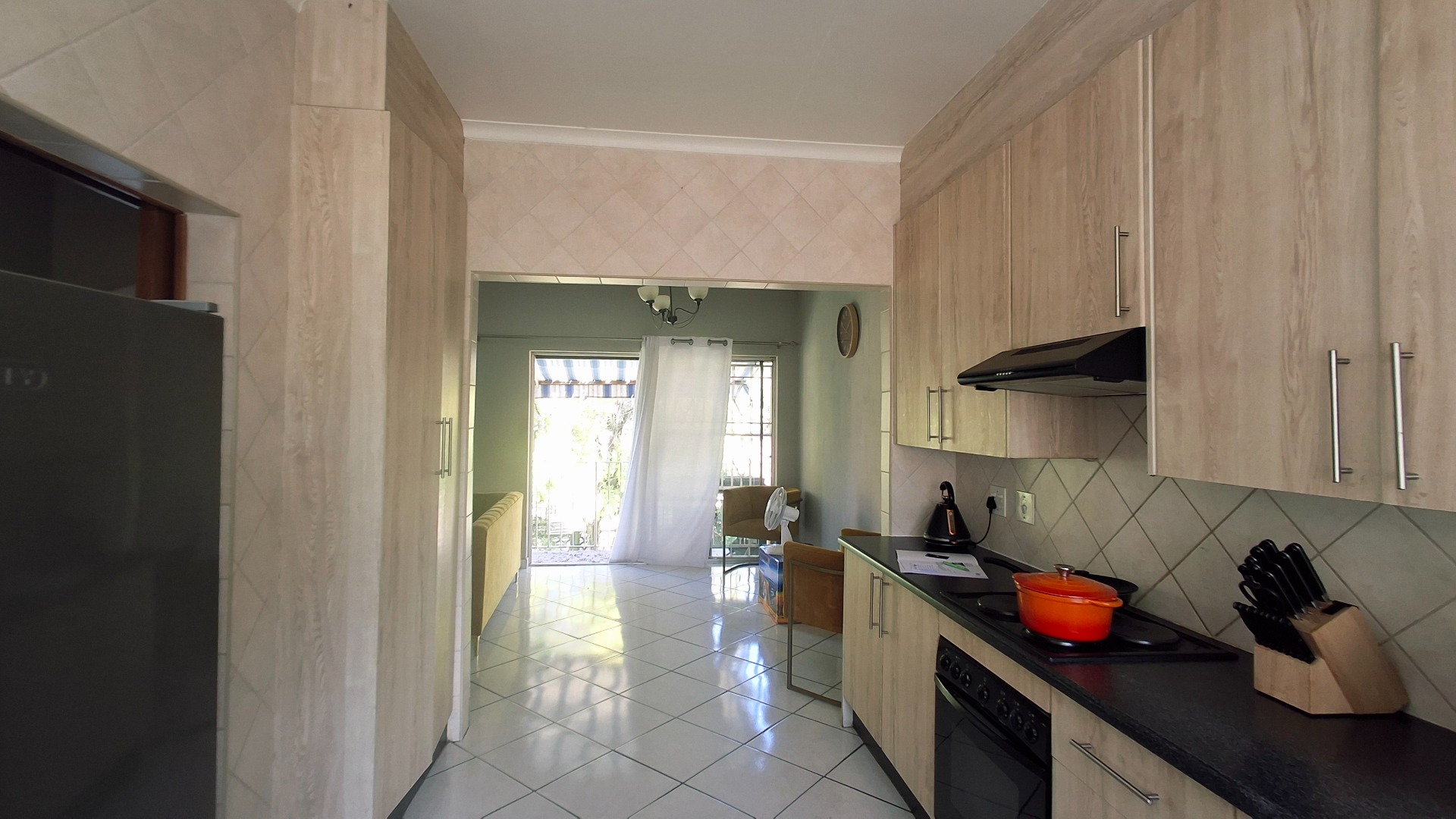 - Modern kitchen with stylish cupboards, flowing into the dining and lounge area