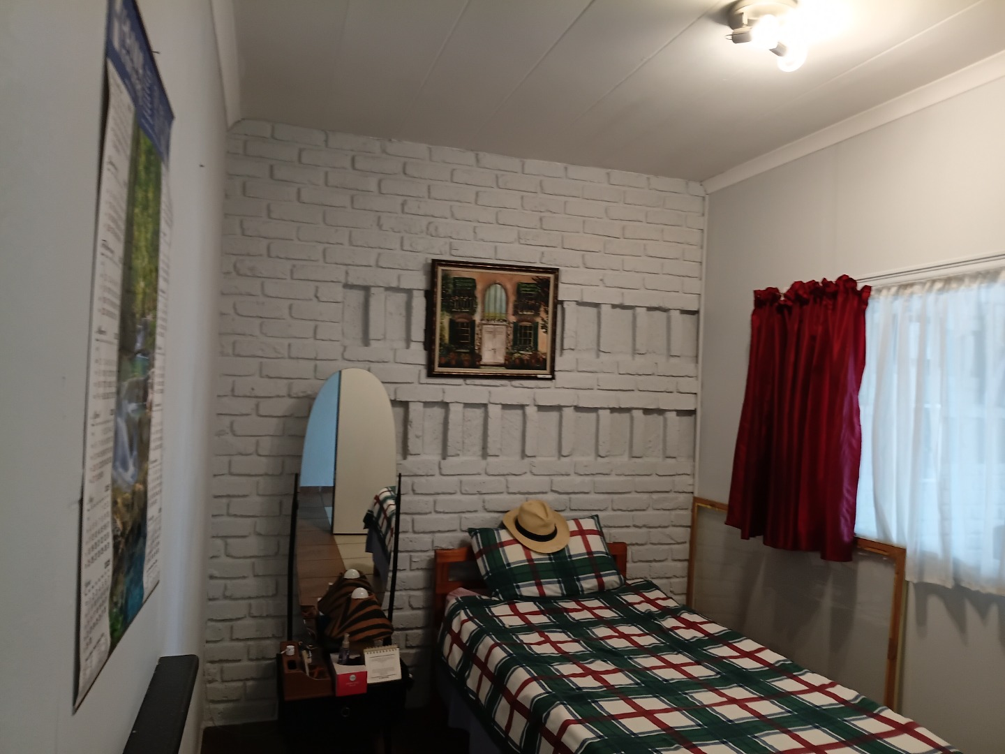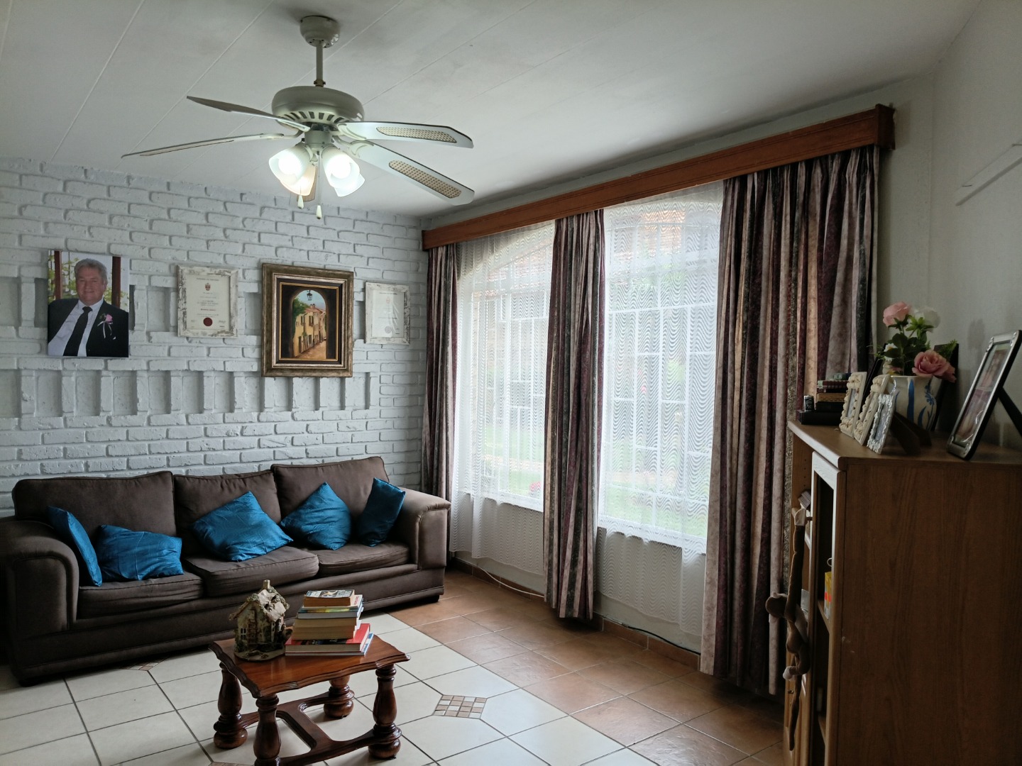 Discover this inviting residential unit located in Albemarle, Germiston. The interior features a functional layout designed for comfortable living. The lounge area is brightened by large windows, complemented by practical tiled flooring and a ceiling fan for climate control. A distinctive white brick-style accent wall adds character to this main living space.