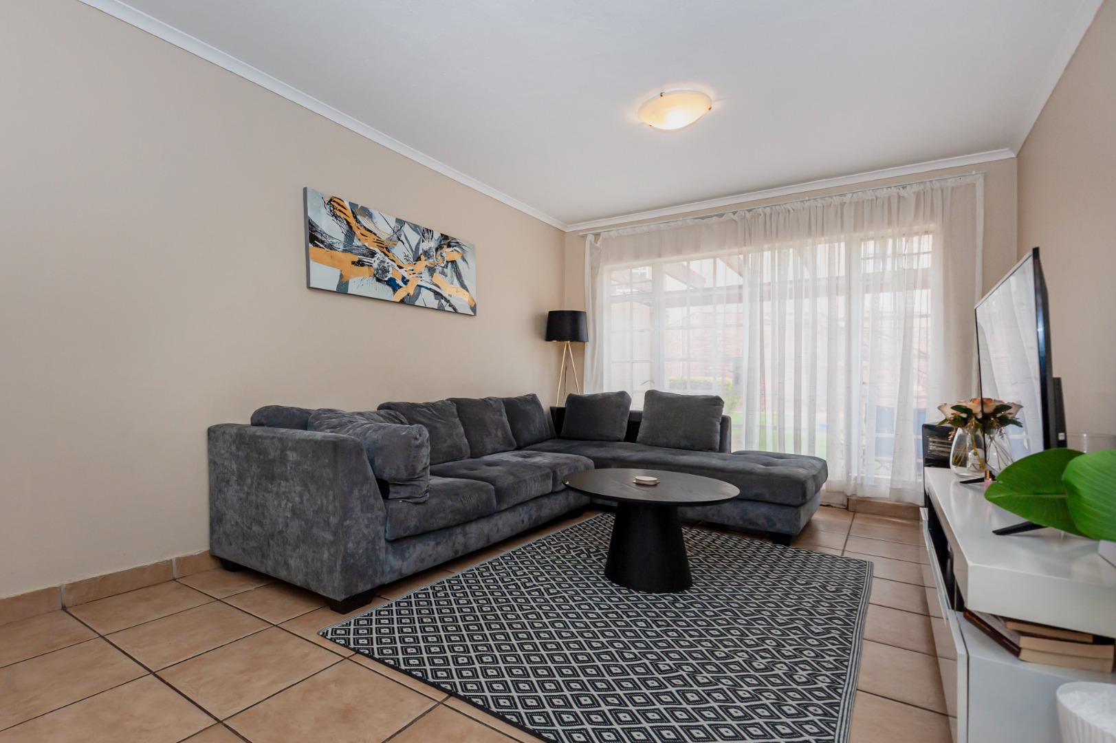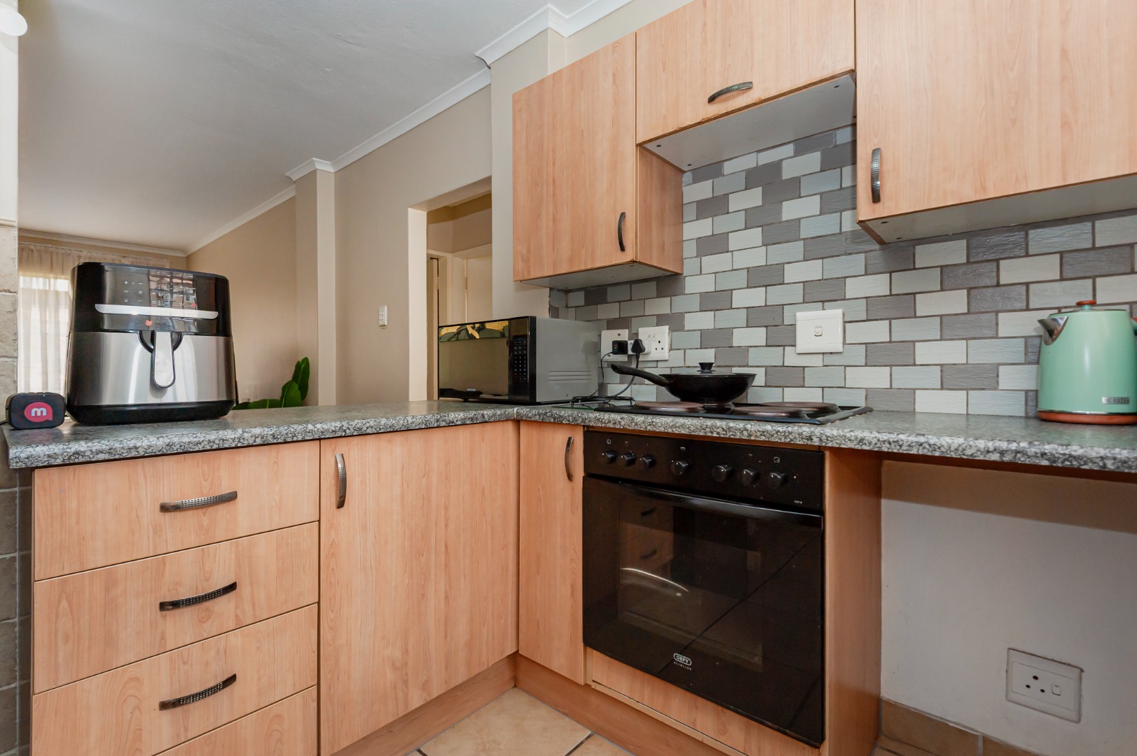 A well-sized kitchen with ample cupboard space,