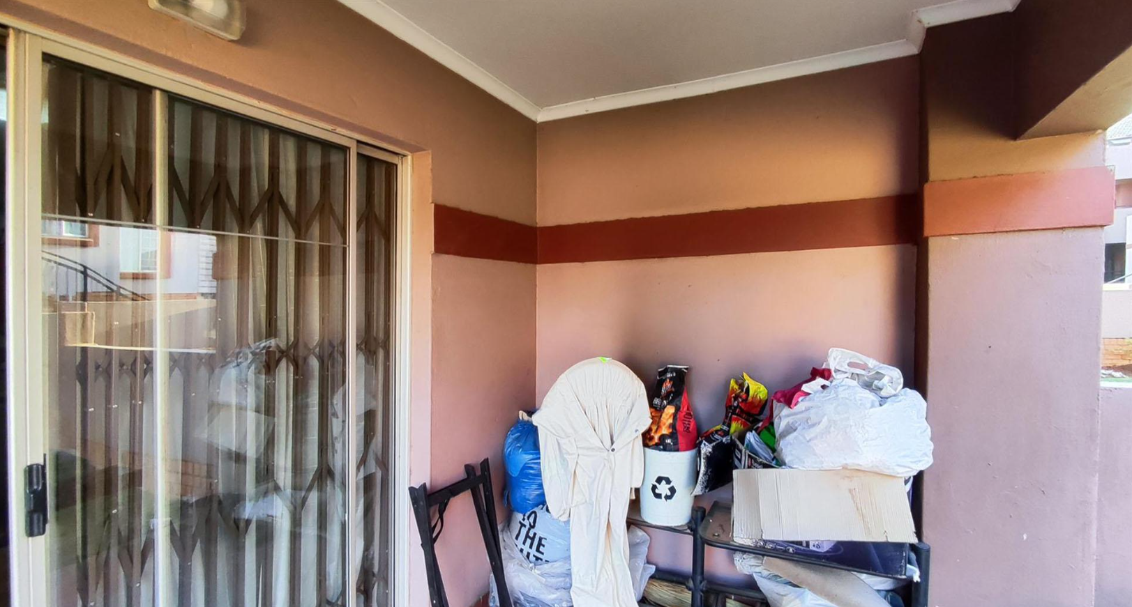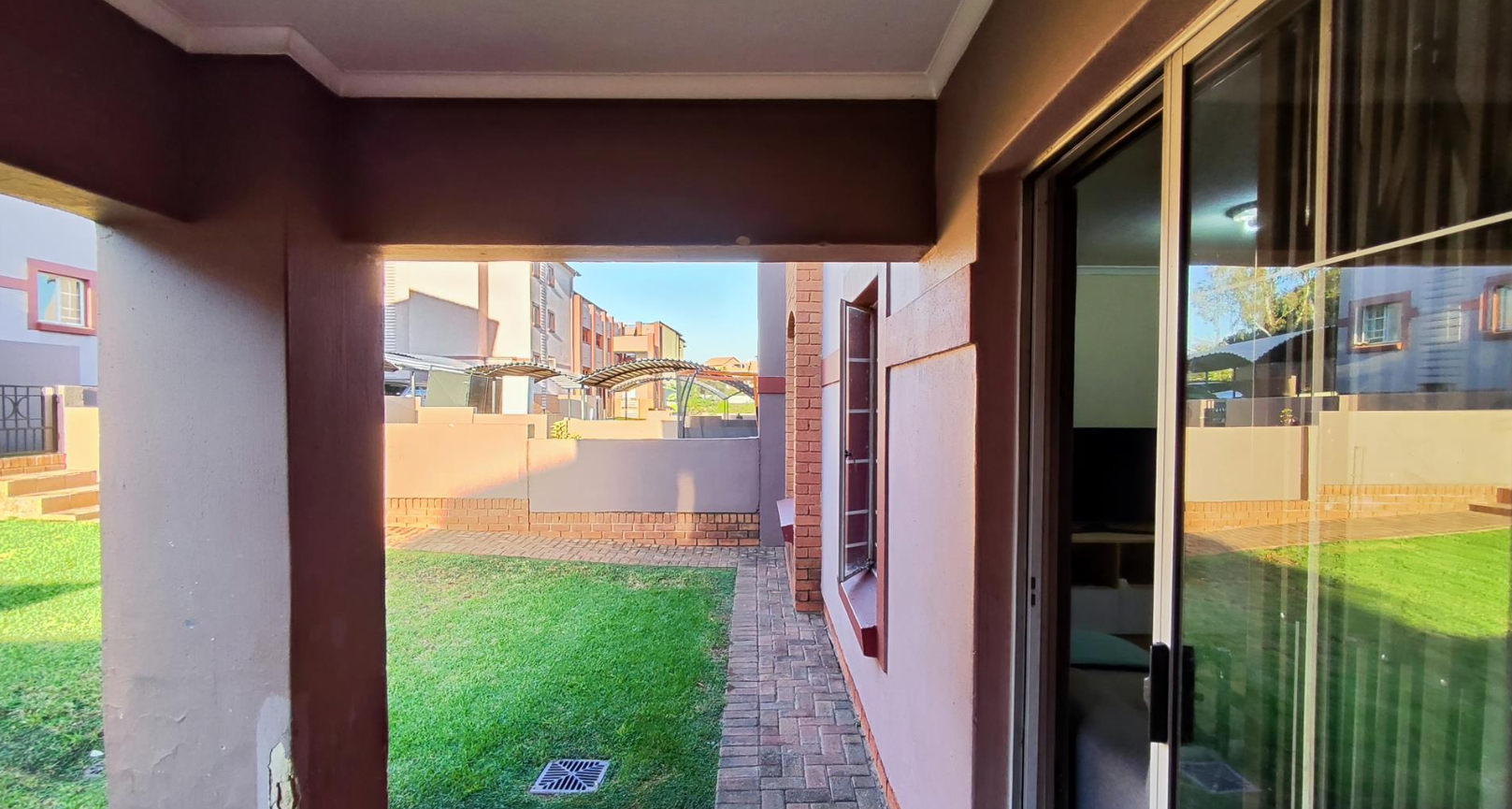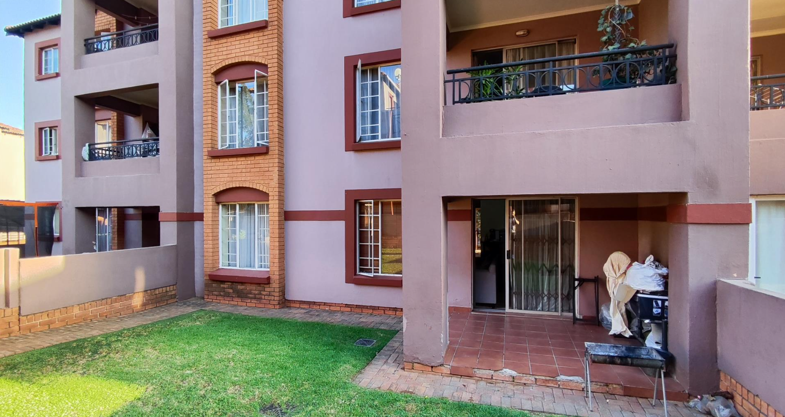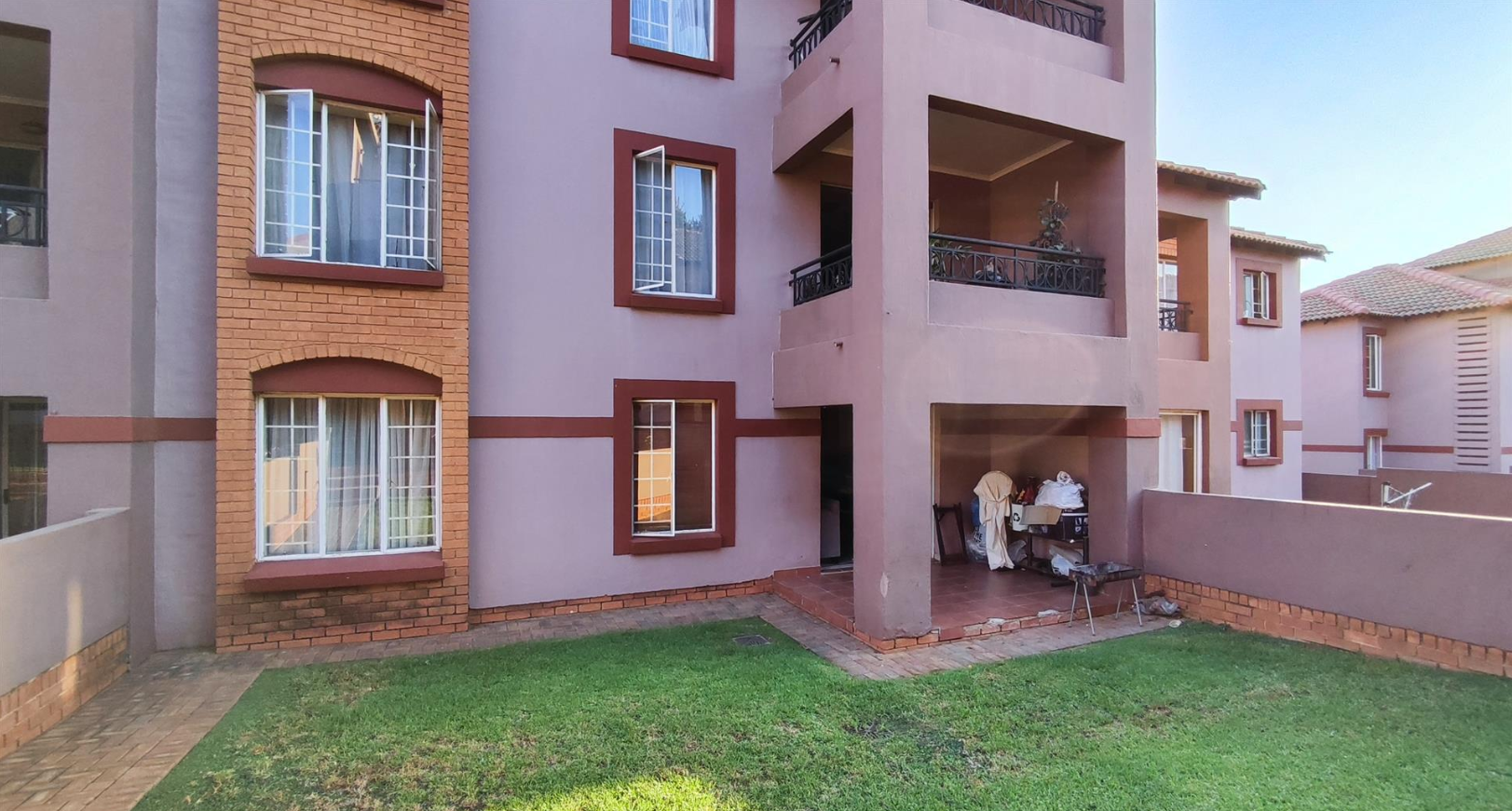 This residential property in Castleview, Germiston, offers a practical and secure living environment within a well-maintained complex. The exterior presents a contemporary design with light purple-pink stucco walls, reddish-brown trim, and brick accents, complemented by neat green lawns and paved pathways, creating a welcoming first impression.